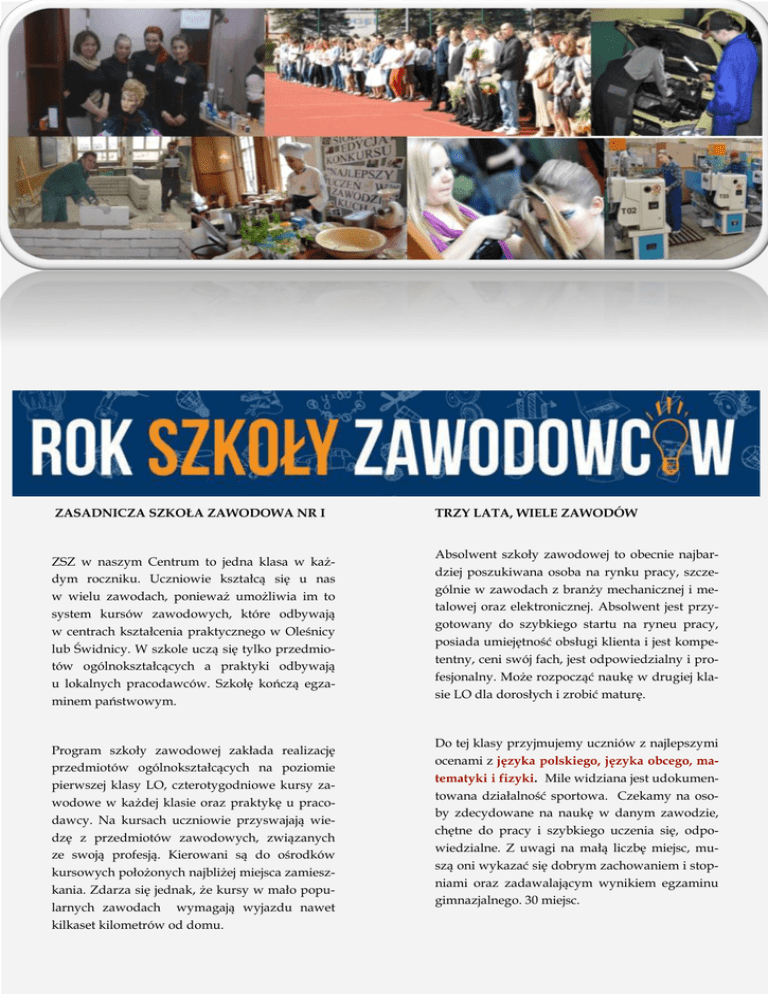 ZASADNICZA SZKOŁA ZAWODOWA NR I ZSZ w naszym Centrum to jedna klasa w każdym roczniku. Uczniowie kształcą się u nas w wielu zawodach, ponieważ umożliwia im to system kursów zawodowych, które odbywają w centrach kształcenia praktycznego w Oleśnicy lub Świdnicy. W szkole uczą się tylko przedmiotów ogólnokształcących a praktyki odbywają u lokalnych pracodawców. Szkołę kończą egzaminem państwowym. Program szkoły zawodowej zakłada realizację przedmiotów ogólnokształcących na poziomie pierwszej klasy LO, czterotygodniowe kursy zawodowe w każdej klasie oraz praktykę u pracodawcy. Na kursach uczniowie przyswajają wiedzę z przedmiotów zawodowych, związanych ze swoją profesją. Kierowani są do ośrodków kursowych położonych najbliżej miejsca zamieszkania. Zdarza się jednak, że kursy w mało popularnych zawodach wymagają wyjazdu nawet kilkaset kilometrów od domu. TRZY LATA, WIELE ZAWODÓW Absolwent szkoły zawodowej to obecnie najbardziej poszukiwana osoba na rynku pracy, szczególnie w zawodach z branży mechanicznej i metalowej oraz elektronicznej. Absolwent jest przygotowany do szybkiego startu na ryneu pracy, posiada umiejętność obsługi klienta i jest kompetentny, ceni swój fach, jest odpowiedzialny i profesjonalny. Może rozpocząć naukę w drugiej klasie LO dla dorosłych i zrobić maturę. Do tej klasy przyjmujemy uczniów z najlepszymi ocenami z języka polskiego, języka obcego, matematyki i fizyki. Mile widziana jest udokumentowana działalność sportowa. Czekamy na osoby zdecydowane na naukę w danym zawodzie, chętne do pracy i szybkiego uczenia się, odpowiedzialne. Z uwagi na małą liczbę miejsc, muszą oni wykazać się dobrym zachowaniem i stopniami oraz zadawalającym wynikiem egzaminu gimnazjalnego. 30 miejsc.