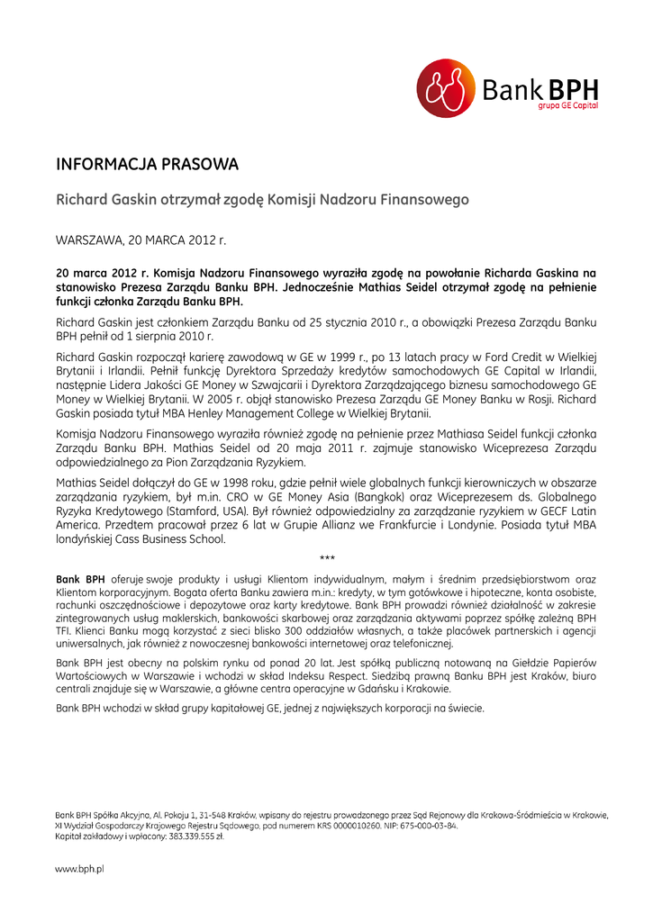 INFORMACJA PRASOWA Richard Gaskin otrzymał zgodę Komisji Nadzoru Finansowego WARSZAWA, 20 MARCA 2012 r. 20 marca 2012 r. Komisja Nadzoru Finansowego wyraziła zgodę na powołanie Richarda Gaskina na stanowisko Prezesa Zarządu Banku BPH. Jednocześnie Mathias Seidel otrzymał zgodę na pełnienie funkcji członka Zarządu Banku BPH. Richard Gaskin jest członkiem Zarządu Banku od 25 stycznia 2010 r., a obowiązki Prezesa Zarządu Banku BPH pełnił od 1 sierpnia 2010 r. Richard Gaskin rozpoczął karierę zawodową w GE w 1999 r., po 13 latach pracy w Ford Credit w Wielkiej Brytanii i Irlandii. Pełnił funkcję Dyrektora Sprzedaży kredytów samochodowych GE Capital w Irlandii, następnie Lidera Jakości GE Money w Szwajcarii i Dyrektora Zarządzającego biznesu samochodowego GE Money w Wielkiej Brytanii. W 2005 r. objął stanowisko Prezesa Zarządu GE Money Banku w Rosji. Richard Gaskin posiada tytuł MBA Henley Management College w Wielkiej Brytanii. Komisja Nadzoru Finansowego wyraziła również zgodę na pełnienie przez Mathiasa Seidel funkcji członka Zarządu Banku BPH. Mathias Seidel od 20 maja 2011 r. zajmuje stanowisko Wiceprezesa Zarządu odpowiedzialnego za Pion Zarządzania Ryzykiem. Mathias Seidel dołączył do GE w 1998 roku, gdzie pełnił wiele globalnych funkcji kierowniczych w obszarze zarządzania ryzykiem, był m.in. CRO w GE Money Asia (Bangkok) oraz Wiceprezesem ds. Globalnego Ryzyka Kredytowego (Stamford, USA). Był również odpowiedzialny za zarządzanie ryzykiem w GECF Latin America. Przedtem pracował przez 6 lat w Grupie Allianz we Frankfurcie i Londynie. Posiada tytuł MBA londyńskiej Cass Business School. *** Bank BPH oferuje swoje produkty i usługi Klientom indywidualnym, małym i średnim przedsiębiorstwom oraz Klientom korporacyjnym. Bogata oferta Banku zawiera m.in.: kredyty, w tym gotówkowe i hipoteczne, konta osobiste, rachunki oszczędnościowe i depozytowe oraz karty kredytowe. Bank BPH prowadzi również działalność w zakresie zintegrowanych usług maklerskich, bankowości skarbowej oraz zarządzania aktywami poprzez spółkę zależną BPH TFI. Klienci Banku mogą korzystać z sieci blisko 300 oddziałów własnych, a także placówek partnerskich i agencji uniwersalnych, jak również z nowoczesnej bankowości internetowej oraz telefonicznej. Bank BPH jest obecny na polskim rynku od ponad 20 lat. Jest spółką publiczną notowaną na Giełdzie Papierów Wartościowych w Warszawie i wchodzi w skład Indeksu Respect. Siedzibą prawną Banku BPH jest Kraków, biuro centrali znajduje się w Warszawie, a główne centra operacyjne w Gdańsku i Krakowie. Bank BPH wchodzi w skład grupy kapitałowej GE, jednej z największych korporacji na świecie. Katarzyna Ewert, Specjalista ds. Public Relations Bank BPH e-mail: [email protected]
