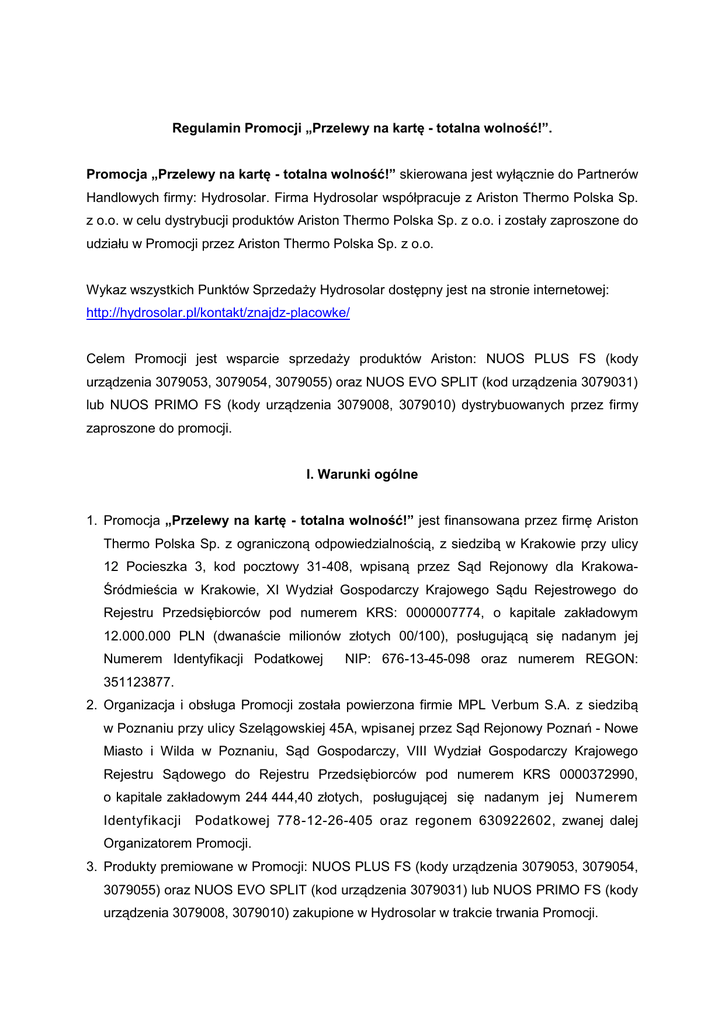 Regulamin Promocji „Przelewy na kartę - totalna wolność!”. Promocja „Przelewy na kartę - totalna wolność!” skierowana jest wyłącznie do Partnerów Handlowych firmy: Hydrosolar. Firma Hydrosolar współpracuje z Ariston Thermo Polska Sp. z o.o. w celu dystrybucji produktów Ariston Thermo Polska Sp. z o.o. i zostały zaproszone do udziału w Promocji przez Ariston Thermo Polska Sp. z o.o. Wykaz wszystkich Punktów Sprzedaży Hydrosolar dostępny jest na stronie internetowej: http://hydrosolar.pl/kontakt/znajdz-placowke/ Celem Promocji jest wsparcie sprzedaży produktów Ariston: NUOS PLUS FS (kody urządzenia 3079053, 3079054, 3079055) oraz NUOS EVO SPLIT (kod urządzenia 3079031) lub NUOS PRIMO FS (kody urządzenia 3079008, 3079010) dystrybuowanych przez firmy zaproszone do promocji. I. Warunki ogólne 1. Promocja „Przelewy na kartę - totalna wolność!” jest finansowana przez firmę Ariston Thermo Polska Sp. z ograniczoną odpowiedzialnością, z siedzibą w Krakowie przy ulicy 12 Pocieszka 3, kod pocztowy 31-408, wpisaną przez Sąd Rejonowy dla KrakowaŚródmieścia w Krakowie, XI Wydział Gospodarczy Krajowego Sądu Rejestrowego do Rejestru Przedsiębiorców pod numerem KRS: 0000007774, o kapitale zakładowym 12.000.000 PLN (dwanaście milionów złotych 00/100), posługującą się nadanym jej Numerem Identyfikacji Podatkowej NIP: 676-13-45-098 oraz numerem REGON: 351123877. 2. Organizacja i obsługa Promocji została powierzona firmie MPL Verbum S.A. z siedzibą w Poznaniu przy ulicy Szelągowskiej 45A, wpisanej przez Sąd Rejonowy Poznań - Nowe Miasto i Wilda w Poznaniu, Sąd Gospodarczy, VIII Wydział Gospodarczy Krajowego Rejestru Sądowego do Rejestru Przedsiębiorców pod numerem KRS 0000372990, o kapitale zakładowym 244 444,40 złotych, posługującej się nadanym jej Numerem Identyfikacji Podatkowej 778-12-26-405 oraz regonem 630922602, zwanej dalej Organizatorem Promocji. 3. Produkty premiowane w Promocji: NUOS PLUS FS (kody urządzenia 3079053, 3079054, 3079055) oraz NUOS EVO SPLIT (kod urządzenia 3079031) lub NUOS PRIMO FS (kody urządzenia 3079008, 3079010) zakupione w Hydrosolar w trakcie trwania Promocji. 4. Promocja obejmuje zakup produktów premiowanych w okresie od 01.02.2017 do 31.03.2017 lub do wyczerpania zapasów nagród promocyjnych. 5. Nagrodą w Promocji jest przelew na kartę VISA MY ARISTON o wartościach zależnych od zakupionego produktu premiowanego: 5.a. 420 zł za pompę NUOS PLUS FS lub NUOS EVO SPLIT, (na kwotę 420 zł składają się: podstawowa wartość przelewu - 225 zł oraz podwyższona - promocyjna wartość przelewu - 195 zł) 5.b. 320 zł za pompę NUOS PRIMO FS: (na kwotę 320 zł składają się: podstawowa wartość przelewu - 150 zł oraz podwyższona - promocyjna wartość przelewu - 170 zł) 5.c. Dodatkowa, podwyższona - promocyjna wartość przelewu dotyczy tylko urządzeń zakupionych w Hydrosolar. 6. Uczestnikiem Promocji może być Partner Handlowy, który w ramach prowadzonej działalności gospodarczej dokonuje zakupu produktów premiowanych: NUOS PLUS FS, NUOS EVO SPLIT, NUOS PRIMO FS w firmie: Hydrosolar a następnie dokonuje odsprzedaży tych produktów na terenie Polski. Przystępując do Promocji, Partner Handlowy spełnia i akceptuje warunki niniejszego Regulaminu, a także wyraził chęć udziału w Promocji w punkcie sprzedaży Hydrosolar. 7. Promocja przeznaczona jest dla osób fizycznych, osób prawnych oraz jednostek organizacyjnych nie posiadających osobowości prawnej, które w trakcie trwania Promocji prowadzą zarejestrowaną działalność gospodarczą w zakresie handlu i instalacji pomp ciepła na terenie Rzeczpospolitej Polskiej, zwanych dalej „Uczestnikami”. Uczestnikiem Promocji nie może być: osoba nabywająca Produkty jako konsument w rozumieniu art. 22(1) kodeksu cywilnego, ani firmy: Hydrosolar włączając w to podmioty powiązane kapitałowo z tą firmą, właścicieli tej firmy, pracowników i członków ich rodzin. 8. Nagrody wymienione w punkcie 5 wydawane są w ramach programu MY ARISTON. Uczestnik promocji akceptuje regulamin programu MY ARISTON na stronie internetowej www.myariston.pl przed zamówieniem przelewu na kartę VISA MY ARISTON. 9. Organizator promocji po zakończeniu trwania promocji usunie z bazy danych programu MY ARSITON wszystkie dane Uczestników promocji, którzy zarejestrowali się po raz pierwszy do programu MY ARISTON w czasie trwania promocji oraz ich pierwszym zarejestrowanym urządzeniem w programie był Produkt premiowany w promocji wraz z kodem promocyjnym. II. Warunki uczestnictwa w Promocji: 1. Warunkiem wzięcia udziału w Promocji jest akceptacja przecz Uczestnika Promocji niniejszego Regulaminu, udostępnionego Uczestnikowi przed rozpoczęciem Promocji, dostępnego u Dystrybutorów produktów Ariston, biorących udział w promocji to jest: Hydrosolar oraz w siedzibie Organizatora, oraz spełnienie pozostałych warunków opisanych w niniejszym Regulaminie. 2. Do każdej zakupionej u Dystrybutorów produktów Ariston, biorących udział w promocji stojącej pompy ciepła Ariston NUOS PLUS FS, NUOS EVO SPLIT, NUOS PRIMO FS, Instalator otrzymuje pakiet: ulotkę z loginem i hasłem do strony programu MY ARISTON, kartę płatniczą VISA MY ARTISTON wraz z kodem numerycznym na przelew o podwyższonej – promocyjnej wartości. 3. Instalator otrzymuje nagrodę - przelew na kartę VISA MY ARISTON wykonując poniższe czynności: 3.a. loguje się loginem i hasłem z ulotki z pakietu z pkt. 2 na stronie programu MY ARISTON www.myariston.pl (wzór ulotki - załącznik numer 2 do tego regulaminu), 3.b. uzupełnia swoje dane w formularzu rejestracji i akceptuje regulamin programu MY ARISTON, 3.c. rejestruje zakupione urządzenie wprowadzając kod numeryczny z naklejki Ariston, dostępnej na zakupionym urządzeniu w zakładce „Rejestracja sprzedaży” na stronie www.myariston.pl (wzór naklejki - załącznik numer 1 do tego regulaminu), 3.d. dodatko