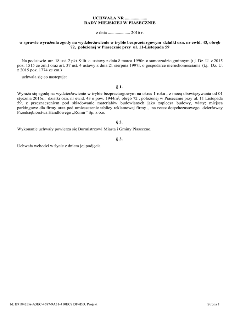 UCHWAŁA NR .................... RADY MIEJSKIEJ W PIASECZNIE z dnia .................... 2016 r. w sprawie wyrażenia zgody na wydzierżawienie w trybie bezprzetargowym działki ozn. nr ewid. 43, obręb 72, położonej w Piasecznie przy ul. 11-Listopada 59 Na podstawie atr. 18 ust. 2 pkt. 9 lit. a ustawy z dnia 8 marca 1990r. o samorzadzie gminnym (t.j. Dz. U. z 2015 poz. 1515 ze zm.) oraz art. 37 ust. 4 ustawy z dnia 21 sierpnia 1997r. o gospodarce nieruchomosciami (t.j. Dz. U. z 2015 poz. 1774 ze zm.) uchwala się co nastepuje: § 1. Wyraża się zgodę na wydzierżawienie w trybie bezprzetargowym na okres 1 roku , z mocą obowiązywania od 01 stycznia 2016r., działki ozn. nr ewid. 43 o pow. 1944m2, obręb 72 , położonej w Piasecznie przy ul. 11 Listopada 59, z przeznaczeniem pod składowanie materiałów budowlanych jako zaplecza budowy, wiaty; miejsca parkingowe dla firmy oraz pod umieszczenie tablicy reklamowej firmy , na rzecz dotychczasowego dzierżawcy Przedsiębiorstwa Handlowego „Romir” Sp. z o.o. § 2. Wykonanie uchwały powierza się Burmistrzowi Miasta i Gminy Piaseczno. § 3. Uchwała wchodzi w życie z dniem jej podjęcia Id: B91842EA-A3EC-4587-9A31-410EC813F4DD. Projekt Strona 1 Uzasadnienie Działka ozn. nr ewid. 43, obręb 72, położona w Piasecznie przy zbiegu ulic 11- Listopada 59 i ul. Wołodyjowskiego wydzierżawiana była była firmie Przedsiębiorstwo Handlowe "Romir" Sp. z o.o. , Wykonastwo Wszelkich Robót Ogólnobudowlanych bez przerwy od 01.01.2014r. do 31.12.2015r. na podstawie umów dzierżaw z przeznaczeniem pod składowanie i zaplecze budowy tj. pod magazyny, wiaty, pod parking sprzęt budowlany i samochody firmy, kontener biurowy oraz pod tablicę reklamową firmy. W miejscowym planie zagospodarowania przestrzennego części miasta Piaseczno zatwierdzonym uchwałą Nr 943/XXXIV/2013 Rady Miejskiej w Piasecznie z dn. 15.05.2013r. teren działki znajduje sie w obszarze przeznaczonym pod zabudowę mieszkaniową jednorodzinną wolnostojącą , na planie rysunku oznaczony literami 30MN. Przedmiotowa działka planowana jest do zbycia. Obecnie prowadzona jest regulacja działki w celu ujawnienia w księdze wieczystej Gminy Piaseczno jako właściciela. Burmistrz na wniosek dzierżawcy oraz w zwiąku z zamiarem zbycia w/wym działki proponuje wydzierżawić w trybie bezprzetargowym na 1 rok, z mocą obowiązywania od dnia 01.01.2016r., działki ozn. nr 43, obręb 72, położonej w Piasecznie przy ul. 11- Listopada 59, na rzecz dotychczasowego dzierżawcy - Przedsiębiorstwo Handlowe , jako kontynuację poprzednich umów, których łączny okres przekroczył 3 lata. Aby umowa dzierżawy mogła być zawarta w trybie bezprzetargowym na okres dłuższy niż trzy lata -to zgodnie z art. 37 ust. 4 ustawy o gospodarce nieruchomościami, wymagana jest zgoda Rady Miejskiej w formie stosownej uchwały. Id: B91842EA-A3EC-4587-9A31-410EC813F4DD. Projekt Strona 2