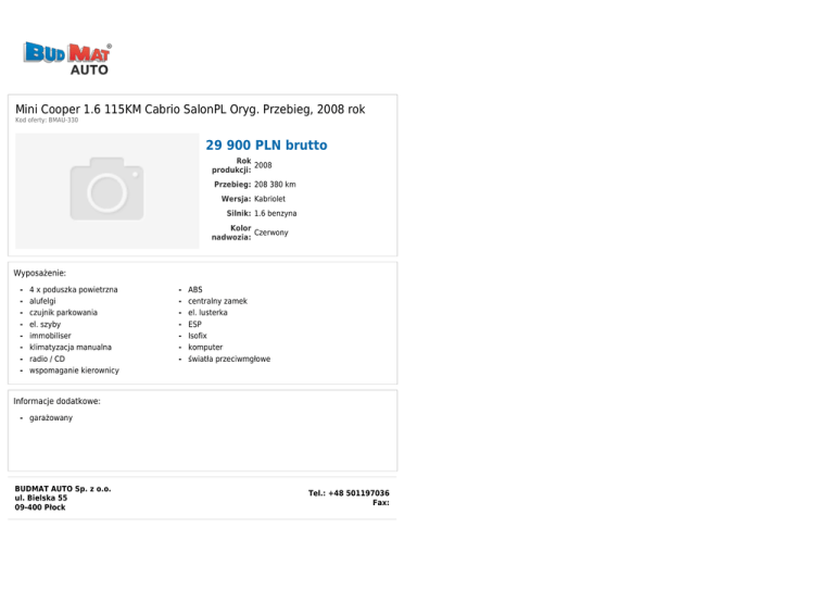 Mini Cooper 1.6 115KM Cabrio SalonPL Oryg. Przebieg, 2008 rok Kod oferty: BMAU-330 29 900 PLN brutto Rok 2008 produkcji: Przebieg: 208 380 km Wersja: Kabriolet Silnik: 1.6 benzyna Kolor Czerwony nadwozia: Wyposażenie: - 4 x poduszka powietrzna alufelgi czujnik parkowania el. szyby immobiliser klimatyzacja manualna radio / CD wspomaganie kierownicy - ABS centralny zamek el. lusterka ESP Isofix komputer światła przeciwmgłowe Informacje dodatkowe: - garażowany BUDMAT AUTO Sp. z o.o. ul. Bielska 55 09-400 Płock Tel.: +48 501197036 Fax: