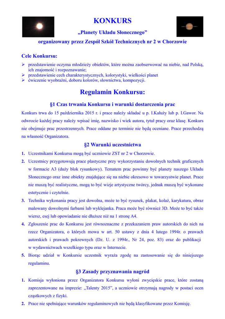 KONKURS „Planety Układu Słonecznego” organizowany przez Zespół Szkół Technicznych nr 2 w Chorzowie Cele Konkursu: przedstawienie oczyma młodzieży obiektów, które można zaobserwować na niebie, nad Polską, ich znajomość i rozpoznawanie; przedstawienie cech charakterystycznych, kolorystyki, wielkości planet ćwiczenie wyobraźni, doboru kolorów, słownictwa, kompozycji. Regulamin Konkursu: §1 Czas trwania Konkursu i warunki dostarczenia prac Konkurs trwa do 15 października 2015 r. i prace należy składać u p. I.Kałuży lub p. I.Gawor. Na odwrocie każdej pracy należy wpisać imię, nazwisko i wiek autora, tytuł pracy oraz klasę. Konkurs nie obejmuje prac przestrzennych. Prace oddane po terminie nie będą oceniane. Prace przechodzą na własność Organizatora. §2 Warunki uczestnictwa 1. Uczestnikami Konkursu mogą być uczniowie ZST nr 2 w Chorzowie. 2. Uczestnicy przygotowują prace plastyczne przy wykorzystaniu dowolnych technik graficznych w formacie A3 (duży blok rysunkowy). Tematem prac powinny być planety naszego Układu Słonecznego oraz inne obiekty znajdujące się na niebie okresowo w towarzystwie planet. Prace nie muszą być realistyczne, mogą to być wizje artystyczne twórcy, jednak muszą być wykonane estetycznie i czytelnie. 3. Technika wykonania pracy jest dowolna, może to być rysunek, plakat, kolaż, karykatura, obraz malowany dowolnymi farbami lub wyklejanka. Praca może być również 3D. Może to być także wiersz, esej lub opowiadanie nie dłuższe niż na 1 stronę A4. 4. Zgłoszenie prac do Konkursu jest równoznaczne z przekazaniem praw autorskich do nich na rzecz Organizatora, o których mowa w art. 50 ustawy z dnia 4 lutego 1994r. o prawach autorskich i prawach pokrewnych (Dz. U. z 1994r., Nr 24, poz. 83) oraz do publikacji w wydawnictwach wszelkiego typu oraz w Internecie. 5. Biorąc udział w Konkursie uczestnik wyraża zgodę na zastosowanie się do niniejszego regulaminu. §3 Zasady przyznawania nagród 1. Komisja wyłoniona przez Organizatora Konkursu wyłoni zwycięskie prace, które zostaną zaprezentowane na imprezie: „Talenty 2015”, a uczniowie otrzymają nagrody w postaci ocen cząstkowych z fizyki. 2. Prace nie spełniające warunków regulaminowych nie będą klasyfikowane przez Komisję.