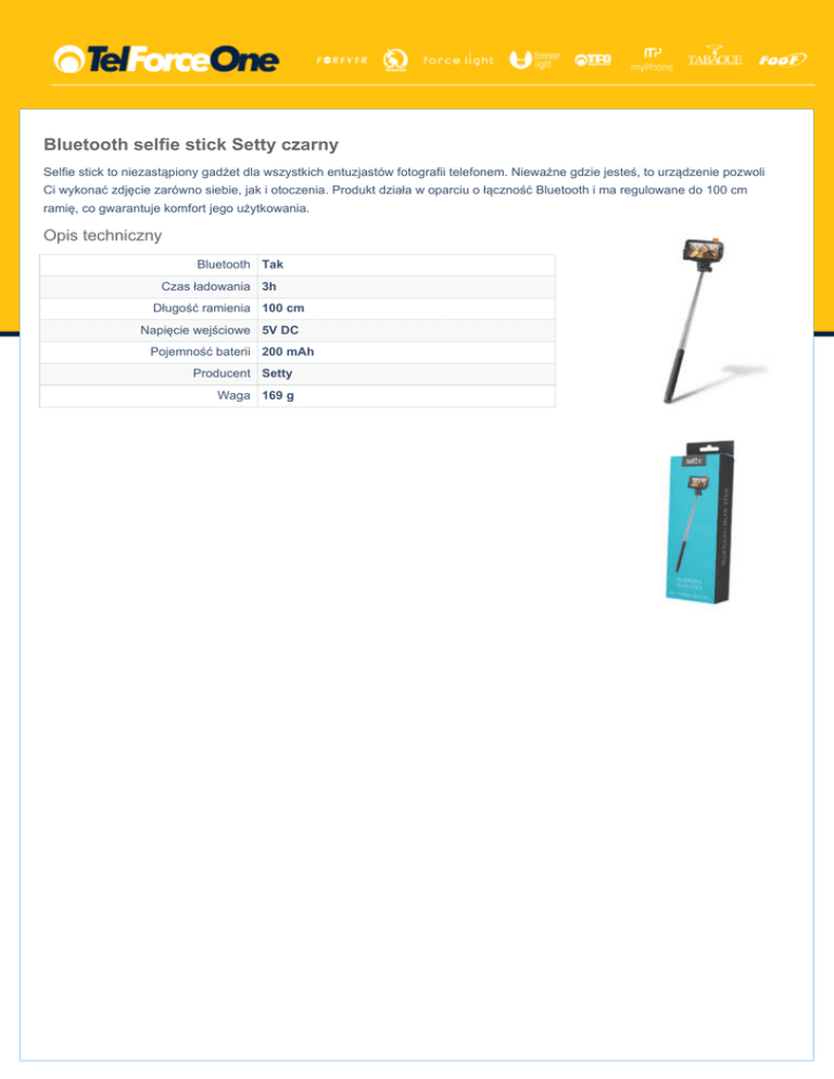 Bluetooth selfie stick Setty czarny Selfie stick to niezastąpiony gadżet dla wszystkich entuzjastów fotografii telefonem. Nieważne gdzie jesteś, to urządzenie pozwoli Ci wykonać zdjęcie zarówno siebie, jak i otoczenia. Produkt działa w oparciu o łączność Bluetooth i ma regulowane do 100 cm ramię, co gwarantuje komfort jego użytkowania. Opis techniczny Bluetooth Tak Czas ładowania 3h Długość ramienia 100 cm Napięcie wejściowe 5V DC Pojemność baterii 200 mAh Producent Setty Waga 169 g
