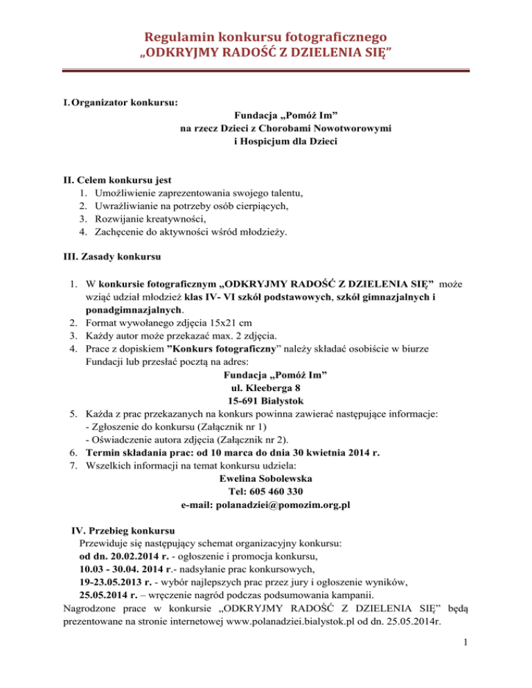 Regulamin konkursu fotograficznego „ODKRYJMY RADOŚĆ Z DZIELENIA SIĘ” I. Organizator konkursu: Fundacja „Pomóż Im” na rzecz Dzieci z Chorobami Nowotworowymi i Hospicjum dla Dzieci II. Celem konkursu jest 1. Umożliwienie zaprezentowania swojego talentu, 2. Uwrażliwianie na potrzeby osób cierpiących, 3. Rozwijanie kreatywności, 4. Zachęcenie do aktywności wśród młodzieży. III. Zasady konkursu 1. W konkursie fotograficznym „ODKRYJMY RADOŚĆ Z DZIELENIA SIĘ” może wziąć udział młodzież klas IV- VI szkół podstawowych, szkół gimnazjalnych i ponadgimnazjalnych. 2. Format wywołanego zdjęcia 15x21 cm 3. Każdy autor może przekazać max. 2 zdjęcia. 4. Prace z dopiskiem ”Konkurs fotograficzny” należy składać osobiście w biurze Fundacji lub przesłać pocztą na adres: Fundacja „Pomóż Im” ul. Kleeberga 8 15-691 Białystok 5. Każda z prac przekazanych na konkurs powinna zawierać następujące informacje: - Zgłoszenie do konkursu (Załącznik nr 1) - Oświadczenie autora zdjęcia (Załącznik nr 2). 6. Termin składania prac: od 10 marca do dnia 30 kwietnia 2014 r. 7. Wszelkich informacji na temat konkursu udziela: Ewelina Sobolewska Tel: 605 460 330 e-mail: [email protected] IV. Przebieg konkursu Przewiduje się następujący schemat organizacyjny konkursu: od dn. 20.02.2014 r. - ogłoszenie i promocja konkursu, 10.03 - 30.04. 2014 r.- nadsyłanie prac konkursowych, 19-23.05.2013 r. - wybór najlepszych prac przez jury i ogłoszenie wyników, 25.05.2014 r. – wręczenie nagród podczas podsumowania kampanii. Nagrodzone prace w konkursie „ODKRYJMY RADOŚĆ Z DZIELENIA SIĘ” będą prezentowane na stronie internetowej www.polanadziei.bialystok.pl od dn. 25.05.2014r. 1 Regulamin konkursu fotograficznego „ODKRYJMY RADOŚĆ Z DZIELENIA SIĘ” V. Nagrody: 1. Spośród Uczestników spełniających warunki Regulaminu konkursu Organizator wyłoni zwycięzców, którzy otrzymają atrakcyjne nagrody. 2. Przewiduje się wyróżnienia dla autorów interesujących prac. 3. Każdy z laureatów otrzyma dodatkowo dyplom będący poświadczeniem uczestnictwa w konkursie. 4. Wyróżnieni zostaną również nauczyciele – opiekunowie uczestników konkursu. 5. Laureatów konkursu wyłoni jury, w którego skład wchodzić będą pracownicy Wojewódzkiego Ośrodka Animacji Kultury w Białymstoku. VI. Postanowienia końcowe 1. Organizator konkursu nie ponosi odpowiedzialności za usługi pocztowe, z których korzystać będą uczestnicy konkursu. Organizator nie ponosi również odpowiedzialności za działania osób trzecich, związanych z organizacją konkursu oraz za szkody spowodowane podaniem błędnych lub nieaktualnych danych przez uczestników konkursu. 2. Nagrodę główną otrzyma autor najwyżej ocenionej przez Jury pracy, a dwie następne nagrody II i III stopnia otrzymają autorzy kolejnych najwyżej ocenionych prac. 2 Regulamin konkursu fotograficznego „ODKRYJMY RADOŚĆ Z DZIELENIA SIĘ” Załącznik Nr 1. …………………………… (pieczęć placówki) ZGŁOSZENIE DO KONKURSU FOTOGRAFICZNEGO „ODKRYJMY RADOŚĆ Z DZIELENIA SIĘ” 1. Imię i nazwisko ucznia ................................................................. 2. Imię i nazwisko opiekuna.............................................................. 3. Wiek ucznia ................................................................................... ............................................................................. (podpis autora pracy konkursowej) ............................................................................ (podpis rodzica/opiekuna autora pracy konkursowej) (dotyczy osób niepełnoletnich) 3 Regulamin konkursu fotograficznego „ODKRYJMY RADOŚĆ Z DZIELENIA SIĘ” Załącznik Nr 2. Uczestnictwo w konkursie jest równoznaczne z akceptacją warunków konkursu. 1. Uczestnik oświadcza, że jest jedynym autorem fotografii. 2. Poprzez fakt nadesłania fotografii, Uczestnik gwarantuje, że do fotografii przysługują mu wszelkie prawa własności intelektualnej, w tym wyłączne prawa autorskie, w szczególności umożliwiające reprodukcję, rozpowszechnianie i publikowanie. 3. Organizator zastrzega sobie prawo do wykorzystania fotografii dla własnych celów reklamowych i marketingowych. W takim przypadku Uczestnikowi nie przysługuje prawo żądania zapłaty za wykorzystanie przez Organizatora fotografii. 4. W chwili nadesłania fotografii Uczestnik wyraża zgodę na nieograniczone korzystanie z niej przez Fundację „Pomóż Im”. 5. Osoby zgłaszające się do Konkursu wyrażają tym samym zgodę na przetwarzanie swoich danych osobowych wyłącznie na potrzeby Konkursu w zakresie koniecznym do jego prawidłowego przeprowadzenia i dalszej prezentacji nadsyłanej pracy (ustawa o ochronie danych osobowych z dn. 29 sierpnia 1997 roku Dz. U. nr 133, poz. 833 z późn. zm.). OŚWIADCZENIE AUTORA FOTOGRAFII Ja,……………………………………………………………………………..…. niżej podpisany(a), oświadczam, że jestem jedynym autorem fotografii. 4