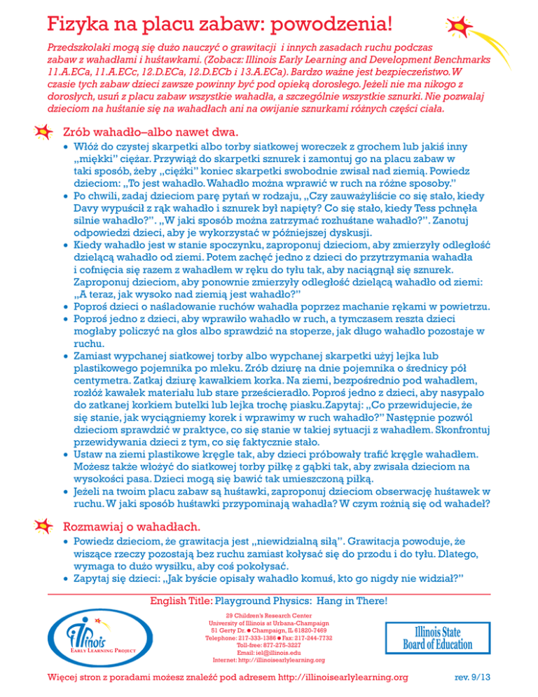 Fizyka na placu zabaw: powodzenia! Przedszkolaki mogą się dużo nauczyć o grawitacji i innych zasadach ruchu podczas zabaw z wahadłami i huśtawkami. (Zobacz: Illinois Early Learning and Development Benchmarks 11.A.ECa, 11.A.ECc, 12.D.ECa, 12.D.ECb i 13.A.ECa). Bardzo ważne jest bezpieczeństwo.W czasie tych zabaw dzieci zawsze powinny być pod opieką dorosłego. Jeżeli nie ma nikogo z dorosłych, usuń z placu zabaw wszystkie wahadła, a szczególnie wszystkie sznurki. Nie pozwalaj dzieciom na huśtanie się na wahadłach ani na owijanie sznurkami różnych części ciała. Zrób wahadło–albo nawet dwa. Włóż do czystej skarpetki albo torby siatkowej woreczek z grochem lub jakiś inny „miękki” ciężar. Przywiąż do skarpetki sznurek i zamontuj go na placu zabaw w taki sposób, żeby „ciężki” koniec skarpetki swobodnie zwisał nad ziemią. Powiedz dzieciom: „To jest wahadło. Wahadło można wprawić w ruch na różne sposoby.” Po chwili, zadaj dzieciom parę pytań w rodzaju, „Czy zauważyliście co się stało, kiedy Davy wypuścił z rąk wahadło i sznurek był napięty? Co się stało, kiedy Tess pchnęła silnie wahadło?”. „W jaki sposób można zatrzymać rozhuśtane wahadło?”. Zanotuj odpowiedzi dzieci, aby je wykorzystać w późniejszej dyskusji. Kiedy wahadło jest w stanie spoczynku, zaproponuj dzieciom, aby zmierzyły odległość dzielącą wahadło od ziemi. Potem zachęć jedno z dzieci do przytrzymania wahadła i cofnięcia się razem z wahadłem w ręku do tyłu tak, aby naciągnął się sznurek. Zaproponuj dzieciom, aby ponownie zmierzyły odległość dzielącą wahadło od ziemi: „A teraz, jak wysoko nad ziemią jest wahadło?” Poproś dzieci o naśladowanie ruchów wahadła poprzez machanie rękami w powietrzu. Poproś jedno z dzieci, aby wprawiło wahadło w ruch, a tymczasem reszta dzieci mogłaby policzyć na głos albo sprawdzić na stoperze, jak długo wahadło pozostaje w ruchu. Zamiast wypchanej siatkowej torby albo wypchanej skarpetki użyj lejka lub plastikowego pojemnika po mleku. Zrób dziurę na dnie pojemnika o średnicy pół centymetra. Zatkaj dziurę kawałkiem korka. Na ziemi, bezpośrednio pod wahadłem, rozłóż kawałek materiału lub stare prześcieradło. Poproś jedno z dzieci, aby nasypało do zatkanej korkiem butelki lub lejka trochę piasku.Zapytaj: „Co przewidujecie, że się stanie, jak wyciągniemy korek i wprawimy w ruch wahadło?” Następnie pozwól dzieciom sprawdzić w praktyce, co się stanie w takiej sytuacji z wahadłem. Skonfrontuj przewidywania dzieci z tym, co się faktycznie stało. Ustaw na ziemi plastikowe kręgle tak, aby dzieci próbowały trafić kręgle wahadłem. Możesz także włożyć do siatkowej torby piłkę z gąbki tak, aby zwisała dzieciom na wysokości pasa. Dzieci mogą się bawić tak umieszczoną piłką. Jeżeli na twoim placu zabaw są huśtawki, zaproponuj dzieciom obserwację huśtawek w ruchu. W jaki sposób huśtawki przypominają wahadła? W czym rożnią się od wahadeł? Rozmawiaj o wahadłach. Powiedz dzieciom, że grawitacja jest „niewidzialną siłą”. Grawitacja powoduje, że wiszące rzeczy pozostają bez ruchu zamiast kołysać się do przodu i do tyłu. Dlatego, wymaga to dużo wysiłku, aby coś pokołysać. Zapytaj się dzieci: „Jak byście opisały wahadło komuś, kto go nigdy nie widział?” English Title: Playground Physics: Hang in There! Early Learning Project 29 Children’s Research Center University of Illinois at Urbana-Champaign 51 Gerty Dr.Champaign, IL 61820-7469 Telephone: 217-333-1386Fax: 217-244-7732 Toll-free: 877-275-3227 Email: [email protected] Internet: http://illinoisearlylearning.org Illinois State Board of Education Więcej stron z poradami możesz znaleźć pod adresem http://illinoisearlylearning.org rev. 9/13