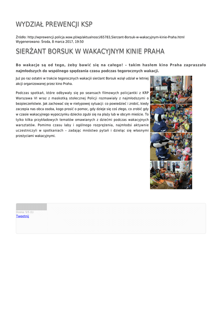WYDZIAŁ PREWENCJI KSP Źródło: http://wprewencji.policja.waw.pl/wp/aktualnosci/65783,Sierzant-Borsuk-w-wakacyjnym-kinie-Praha.html Wygenerowano: Środa, 8 marca 2017, 19:50 SIERŻANT BORSUK W WAKACYJNYM KINIE PRAHA Bo wakacje są od tego, żeby bawić się na całego! – takim hasłem kino Praha zapraszało najmłodszych do wspólnego spędzania czasu podczas tegorocznych wakacji. Już po raz ostatni w trakcie tegorocznych wakacjii sierżant Borsuk wziął udział w letniej akcji organizowanej przez kino Praha. Podczas spotkań, które odbywały się po seansach filmowych policjantki z KRP Warszawa VI wraz z maskotką stołecznej Policji rozmawiały z najmłodszymi o bezpieczeństwie. Jak zachować się w nietypowej sytuacji: co powiedzieć i zrobić, kiedy zaczepia nas obca osoba, kogo prosić o pomoc, gdy dzieje się coś złego, co zrobić gdy w czasie wakacyjnego wypoczynku dziecko zgubi się na plaży lub w obcym mieście. To tylko kilka przykładowych tematów omawianych z dziećmi podczas wakacyjnych warsztatów. Pomimo czasu laby i ogólnego rozprężenia, najmłodsi aktywnie uczestniczyli w spotkaniach – zadając mnóstwo pytań i dzieląc się własnymi przeżyciami wakacyjnymi. Ocena: 5/5 (1) Tweetnij