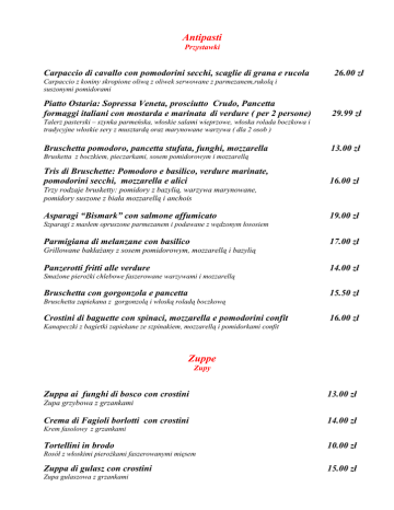 Antipasti Przystawki Carpaccio di cavallo con pomodorini secchi, scaglie di grana e rucola 26.00 zł Carpaccio z koniny skropione oliwą z oliwek serwowane z parmezanem,rukolą i suszonymi pomidorami Piatto Ostaria: Sopressa Veneta, prosciutto Crudo, Pancetta formaggi italiani con mostarda e marinata di verdure ( per 2 persone) 29.99 zł Talerz pasterski – szynka parmeńska, włoskie salami wieprzowe, włoska rolada boczkowa i tradycyjne włoskie sery z musztardą oraz marynowane warzywa ( dla 2 osob ) Bruschetta pomodoro, pancetta stufata, funghi, mozzarella 13.00 zł Brusketta z boczkiem, pieczarkami, sosem pomidorowym i mozzarellą Tris di Bruschette: Pomodoro e basilico, verdure marinate, pomodorini secchi, mozzarella e alici 16.00 zł Trzy rodzaje brusketty: pomidory z bazylią, warzywa marynowane, pomidory suszone z biała mozzarellą i anchois Asparagi “Bismark” con salmone affumicato 19.00 zł Szparagi z masłem opruszone parmezanem i podawane z wędzonym łososiem Parmigiana di melanzane con basilico 17.00 zł Grillowane bakłażany z sosem pomidorowym, mozzarellą i bazylią Panzerotti fritti alle verdure 14.00 zł Smażone pierożki chlebowe faszerowane warzywami i mozzarellą Bruschetta con gorgonzola e pancetta 15.50 zł Bruschetta zapiekana z gorgonzolą i włoską roladą boczkową Crostini di baguette con spinaci, mozzarella e pomodorini confit 16.00 zł Kanapeczki z bagietki zapiekane ze szpinakiem, mozzarellą i pomidorkami confit Zuppe Zupy Zuppa ai funghi di bosco con crostini 13.00 zł Zupa grzybowa z grzankami Crema di Fagioli borlotti con crostini 14.00 zł Krem fasolowy z grzankami Tortellini in brodo 10.00 zł Rosół z włoskimi pierożkami faszerowanymi mięsem Zuppa di gulasz con crostini Zupa gulaszowa z grzankami 15.00 zł Paste Pasty Spaghetti alla Carbonara con parmigiano 19.00 zł Spaghetti serwowane z sosem na bazie śmietanki, boczku i parmezanu Tagliatelle Bolognese con parmigiano 18.00 zł Tagiatelle domowej roboty z sosem bolońskim i parmezanem Tortelli papa Mario con speck e parmigiano 22.50 zł Tortelli domowej roboty: włoskie uszka faszerowane wołowiną serwowane z sosem śmietanowym speckiem i szczyptą parmezanu Pasticcio con ragu, funghi, prosciutto e formaggio 19.00 zł Lasagna z sosem bolońskim, szynką, grzybami i serem Maccheroni fatti in casa all’ amatriciana e parmigiano( piccante) 21.00 zł Makaron domowej roboty serwowany z sosem pomidorowym, wędzonym boczkiem, cebulką i parmezanem ( pikantny ) Tagliatelle fresche con prosciutto di Parma, panna e parmigiano 22.00 zł Tagliatelle domowej roboty z szynką parmeńnską, białym sosem i parmezanem Spaizerli trentini con pancetta affumicata e funghi 21.50 zł Gnocchi z Tyrolu (kluseczki) domowej roboty z boczkiem i grzybami Spaghetti al pesto Genovese con pomodorini 19.00 zł Spaghetti z bazyliowym sosem Pesto i pomidorami Confi Penne integrali con salmone e rucola 21.00 zł Makaron Penne (wieloziarnisty) z sosem łososiowym, rucolą i oliwą z oliwek Spaghetti integrali al pomodoro e basilico 18.00 zł Spaghetti (wieloziarniste) ze świeżymi pomidorami, bazylią i czosnkiem Tagliatelle al gorgonzola noci e pomodorini secchi Tagliatelle domowej roboty z sosem z sera gorgonzola, orzechami włoskimi i pomidorami suszonymi 22.00 zł Secondi piatti di carne Dania mięsne Filetto di maiale ai funghi con patate al rosmarino 28.00 zł Polędwica wieprzowa w sosie na bazie śmietanki i grzybów serwowana z ziemniakami z pieca Saltimbocca alla romana con patate 31.00 zł Stek wołowy z szynką parmeńską i ziemniakami z pieca Petto di pollo al sesamo con salsa soia e insalatina 21.00 zł Filet z kurczaka w sezamie z sosem sojowym i sałatą Spezzatino di manzo con polenta 23.00 zł Włoski gulasz wołowy serwowany z „polentą„ Bistecche di cavallo con patate 32.00 zł Grillowany stek z mięsa końskiego, serwowany z pieczonymi ziemniakami Porchetta di maialino con patate fritte 24.00 zł Aromatyczna pieczeń wieprzowa z frytkami Bocconcini di Pollo fritto con insalatina e salsa all’aglio 25.00 zł Kawałki smażonego kurczaka z sałatą i sosem czosnkowym Secondi di pesce Dania rybne Filetto di sogliola con pomodorini e olive verdi 23.50 zł Filet z soli ze świeżymi pomidorami i oliwkami Fritto di calamari,gamberi,verdure e sogliola con sweet and sour 26.00 zł Mix smażonych: kalmary, krewetki, limanda i warzywa z sosem ananasowym Filetto d’orata all’acqua pazza 28.00 zł Filet z dorady zapiekany z warzywami Insalatone Sałatki Insalata mediteranea 15.50 zł Insalata, feta, olive, mais, pomodori, tonno Zielona sałata, feta, oliwki, kukurydza, pomidory, tuńczyk Insalata Ostaria 15.50 zł Insalata, cetrioli, pomodori secchi, cipolla, mais Zielona sałata, ogórki, suszone pomidory, cebula, kukurydza, Insalata sfiziosa Insalata, cus cus, gamberi, salmone affumicato, salsa citronette Zielona sałata, wędzony łosoś, kus-kus, krewetki – całość serwowana z salsą cytrynową 16.50 zł Contorni Dodatki Insalata mista 5.50 zł Sałata zielona z sezonowymi warzywami Verdure alla griglia 7.50 zł Grillowane warzywa Patate fritte 5.00 zł Frytki Parmigiano 5.00 zł Parmezan Focaccia al rosmarino 12.00 zł Włoski podpłomyk z rozmarynem Secondo cestino di pane 3.00 zł Kosz pieczywa (dodatkowy) Dolci Desery Tiramisu con frutta 14.50 zł Tradycyjny włoski deser na bazie serka mascarpone i owoców Tortino all’amaretto con salsa al caramello 14.00 zł Torcik amaretto z sosem karmelowym Gelato con salsa ai frutti di bosco 10.00 zł Lody śmietankowe w sosie z owoców leśnych Semifreddo al cioccolato con sciroppo alla menta Tradycyjne włoskie semifreddo czekoladowe z 14.50 zł miętowym Dolce della casa Ostaria ( 4 mignon di dolce) 19.00 zł Deser “Ostaria 239” ( cztery rodzaje mini deserów) Crema catalana con cremoso al cioccolato Krem kataloński serwowany z musem czekoladowym 14.50 zł Kawa Caffe espresso 6.00 zł Kawa espresso Espresso macchiato 7.00 zł Espresso z 