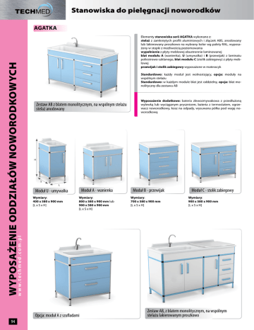 Stanowiska do pielęgnacji noworodków Elementy stanowiska serii AGATKA wykonano z: stelaż z zamkniętych profili aluminiowych i złączek ABS, anodowany lub lakierowany proszkowo na wybrany kolor wg palety RAL, wyposażony w stopki z możliwością poziomowania wypełnienie z płyty meblowej obustronnie laminowanej blat modułu A (wanienka), U (umywalka) i B (przewijak) z laminatu poliestrowo-szklanego, blat modułu C (stolik zabiegowy) z płyty meblowej przewijak i stolik zabiegowy wyposażone w materacyk Standardowo: każdy moduł jest wolnostojący, opcja: moduły na wspólnym stelażu Standardowo: w każdym module blat jest oddzielny, opcja: blat monolityczny dla zestawu AB Zestaw AB z blatem monolitycznym, na wspólnym stelażu stelaż anodowany Wyposażenie dodatkowe: bateria zlewozmywakowa z przedłużoną wylewką lub wyciąganym prysznicem, bateria z termostatem, ogrzewacz noworodkowy, kosz na odpady, wysuwana półka pod wagę noworodkową H S L Moduł A - wanienka Moduł U - umywalka Wymiary: 400 x 580 x 900 mm [L x S x H] Wymiary: 800 x 580 x 900 mm lub 900 x 580 x 900 mm [L x S x H] Moduł B - przewijak Wymiary: 700 x 580 x 900 mm [L x S x H] Moduł C - stolik zabiegowy Wymiary: 900 x 580 x 900 mm [L x S x H] w w w.techmed.com.pl WYPOSAŻENIE ODDZIAŁÓW NOWORODKOWYCH AGATKA Opcja: moduł A z szufladami 94 Zestaw AB, z blatem monolitycznym, na wspólnym stelażu lakierowanym proszkowo