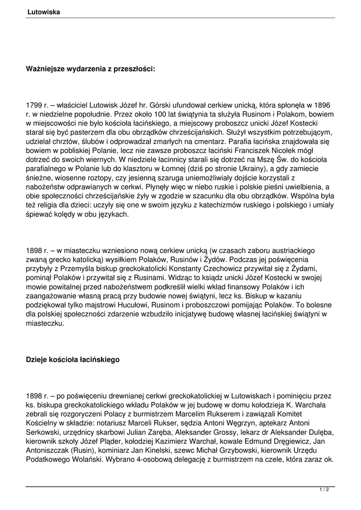 Lutowiska Ważniejsze wydarzenia z przeszłości: 1799 r. – właściciel Lutowisk Józef hr. Górski ufundował cerkiew unicką, która spłonęła w 1896 r. w niedzielne popołudnie. Przez około 100 lat świątynia ta służyła Rusinom i Polakom, bowiem w miejscowości nie było kościoła łacińskiego, a miejscowy proboszcz unicki Józef Kostecki starał się być pasterzem dla obu obrządków chrześcijańskich. Służył wszystkim potrzebującym, udzielał chrztów, ślubów i odprowadzał zmarłych na cmentarz. Parafia łacińska znajdowała się bowiem w pobliskiej Polanie, lecz nie zawsze proboszcz łaciński Franciszek Nicołek mógł dotrzeć do swoich wiernych. W niedziele łacinnicy starali się dotrzeć na Mszę Św. do kościoła parafialnego w Polanie lub do klasztoru w Łomnej (dziś po stronie Ukrainy), a gdy zamiecie śnieżne, wiosenne roztopy, czy jesienną szaruga uniemożliwiały dojście korzystali z nabożeństw odprawianych w cerkwi. Płynęły więc w niebo ruskie i polskie pieśni uwielbienia, a obie społeczności chrześcijańskie żyły w zgodzie w szacunku dla obu obrządków. Wspólna była też religia dla dzieci: uczyły się one w swoim języku z katechizmów ruskiego i polskiego i umiały śpiewać kolędy w obu językach. 1898 r. – w miasteczku wzniesiono nową cerkiew unicką (w czasach zaboru austriackiego zwaną grecko katolicką) wysiłkiem Polaków, Rusinów i Żydów. Podczas jej poświęcenia przybyły z Przemyśla biskup greckokatolicki Konstanty Czechowicz przywitał się z Żydami, pominął Polaków i przywitał się z Rusinami. Widząc to ksiądz unicki Józef Kostecki w swojej mowie powitalnej przed nabożeństwem podkreślił wielki wkład finansowy Polaków i ich zaangażowanie własną pracą przy budowie nowej świątyni, lecz ks. Biskup w kazaniu podziękował tylko majstrowi Hucułowi, Rusinom i proboszczowi pomijając Polaków. To bolesne dla polskiej społeczności zdarzenie wzbudziło inicjatywę budowę własnej łacińskiej świątyni w miasteczku. Dzieje kościoła łacińskiego 1898 r. – po poświęceniu drewnianej cerkwi greckokatolickiej w Lutowiskach i pominięciu przez ks. biskupa greckokatolickiego wkładu Polaków w jej budowę w domu kołodzieja K. Warchała zebrali się rozgoryczeni Polacy z burmistrzem Marcelim Rukserem i zawiązali Komitet Kościelny w składzie: notariusz Marceli Rukser, sędzia Antoni Węgrzyn, aptekarz Antoni Serkowski, urzędnicy skarbowi Julian Zaręba, Aleksander Grossy, lekarz dr Aleksander Dulęba, kierownik szkoły Józef Pląder, kołodziej Kazimierz Warchał, kowale Edmund Dręgiewicz, Jan Antoniszczak (Rusin), kominiarz Jan Kinelski, szewc Michał Grzybowski, kierownik Urzędu Podatkowego Wolański. Wybrano 4-osobową delegację z burmistrzem na czele, która zaraz ok. 1/2 Lutowiska 11 – mimo trwającej jeszcze w cerkwi mszy - udała się pocztą do Przemyśla i już późnym popołudniem została od razu przyjęta przez ordynariusza diecezji łacińskiej ks. biskupa Sebastiana Pelczara. Po wysłuchaniu delegacji ks. biskup wyraził zgodę na budowę kościoła łacińskiego i obiecał przysłać do pomocy kapłana. Warto zobaczyć: 1. Kościół rzymsko-katolicki p.w. św. Stanisława Biskupa z lat 2. Ośrodek Informacyjno-Edukacyjny BPN oferujący bezpłatne zajęcia edukacyjne i filmy dla młodzieży szkolnej oraz salę wystawową ze zmieniającymi się ekspozycjami fotograficznymi, malarskimi, twórców regionalnych itp. 3. Cmentarz żydowski (kirkut) – dojście od szkoły 4. Panoramę widokową na najwyższe partie górskie BPN z podjazdu na pasmo Ostrego. Opracował Stanisław Orłowski 2/2
