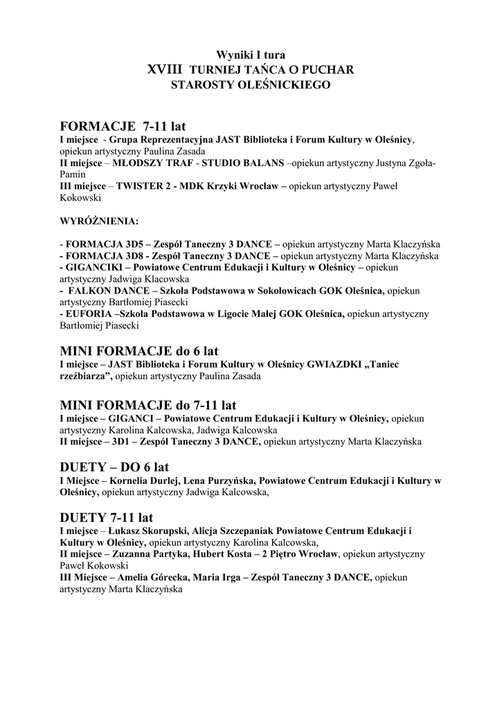 Wyniki I tura XVIII TURNIEJ TAŃCA O PUCHAR STAROSTY OLEŚNICKIEGO FORMACJE 7-11 lat I miejsce - Grupa Reprezentacyjna JAST Biblioteka i Forum Kultury w Oleśnicy, opiekun artystyczny Paulina Zasada II miejsce – MŁODSZY TRAF - STUDIO BALANS –opiekun artystyczny Justyna ZgołaPamin III miejsce – TWISTER 2 - MDK Krzyki Wrocław – opiekun artystyczny Paweł Kokowski WYRÓŻNIENIA: - FORMACJA 3D5 – Zespół Taneczny 3 DANCE – opiekun artystyczny Marta Klaczyńska - FORMACJA 3D8 - Zespół Taneczny 3 DANCE – opiekun artystyczny Marta Klaczyńska - GIGANCIKI – Powiatowe Centrum Edukacji i Kultury w Oleśnicy – opiekun artystyczny Jadwiga Klacowska - FALKON DANCE – Szkoła Podstawowa w Sokołowicach GOK Oleśnica, opiekun artystyczny Bartłomiej Piasecki - EUFORIA –Szkoła Podstawowa w Ligocie Małej GOK Oleśnica, opiekun artystyczny Bartłomiej Piasecki MINI FORMACJE do 6 lat I miejsce – JAST Biblioteka i Forum Kultury w Oleśnicy GWIAZDKI „Taniec rzeźbiarza”, opiekun artystyczny Paulina Zasada MINI FORMACJE do 7-11 lat I miejsce – GIGANCI – Powiatowe Centrum Edukacji i Kultury w Oleśnicy, opiekun artystyczny Karolina Kalcowska, Jadwiga Kalcowska II miejsce – 3D1 – Zespół Taneczny 3 DANCE, opiekun artystyczny Marta Klaczyńska DUETY – DO 6 lat I Miejsce – Kornelia Durlej, Lena Purzyńska, Powiatowe Centrum Edukacji i Kultury w Oleśnicy, opiekun artystyczny Jadwiga Kalcowska, DUETY 7-11 lat I miejsce – Łukasz Skorupski, Alicja Szczepaniak Powiatowe Centrum Edukacji i Kultury w Oleśnicy, opiekun artystyczny Karolina Kalcowska, II miejsce – Zuzanna Partyka, Hubert Kosta – 2 Piętro Wrocław, opiekun artystyczny Paweł Kokowski III Miejsce – Amelia Górecka, Maria Irga – Zespół Taneczny 3 DANCE, opiekun artystyczny Marta Klaczyńska WYRÓŻNIENIA: - Karol Puchalski, Wiktoria Lemiec – MDK Krzyki Wrocław – opiekun artystyczny Paweł Kokowski - Aleksandra Korcz, Wiktoria Górecka – STUDIO BALANS, opiekun artystyczny Justyna Zgoła-Pamin - Kinga Kujawska, Sylwia Konieczna - MDK Krzyki Wrocław – opiekun artystyczny Paweł Kokowski - Milena Waszczak, Katarzyna Gajewska, Zespół Taneczny 3 DANCE, opiekun artystyczny Marta Klaczyńska - Ewa Świętuch, Weronika Mikuśkiewicz, Zespół Taneczny 3 DANCE, opiekun artystyczny Marta Klaczyńska SOLO do 6 lat I miejsce - Lena Kowalczyk – CARMEN WAŁBRZYCH II miejsce – Natalia Wiewióra- Powiatowe Centrum Edukacji i Kultury w Oleśnicy, opiekun artystyczny Jadwiga Kalcowska, III miejsce – Aniela Prus - JAST Biblioteka i Forum Kultury w Oleśnicy, opiekun artystyczny Paulina Zasada SOLO 7-11 lat I miejsce – Maja Żukowska JAST Biblioteka i Forum Kultury w Oleśnicy opiekun artystyczny Paulina Zasada II miejsce – Wiktoria Wzgarda - Powiatowe Centrum Edukacji i Kultury w Oleśnicy, opiekun artystyczny Karolina Kalcowska, III miejsce – Wiktoria Kobiałka JAST Biblioteka i Forum Kultury w Oleśnicy, opiekun artystyczny Paulina Zasada WYRÓŻNIENIA - Martyna Matłaj –STUDIO BALANS opiekun artystyczny Justyna Zgoła-Pamin - Natalia Głąbicka - JAST Biblioteka i Forum Kultury w Oleśnicy, opiekun artystyczny Paulina Zasada - Julia Wiktorowicz – CARMEN WAŁBRZYCH, opiekun artystyczny Natalia Pinach - Jagoda Bartecka – JAST Biblioteka i Forum Kultury w Oleśnicy , opiekun artystyczny Paulina Zasada - Magdalena Antonicka - FUNKY FLAVA, opiekun artystyczny Jessica Ali CHEERLEADERS 7- 11 lat I miejsce JAST Biblioteka i Forum Kultury w Oleśnicy DIAMENTY , opiekun artystyczny Paulina Zasada II miejsce GWIAZDECZKI – MDK im. M. Kopernika we Wrocławiu, opiekun artystyczny Sylwia Nadolska III miejsce ISKIERKI - Powiatowe Centrum Edukacji i Kultury w Oleśnicy, opiekun artystyczny Klaudia Skadorwa