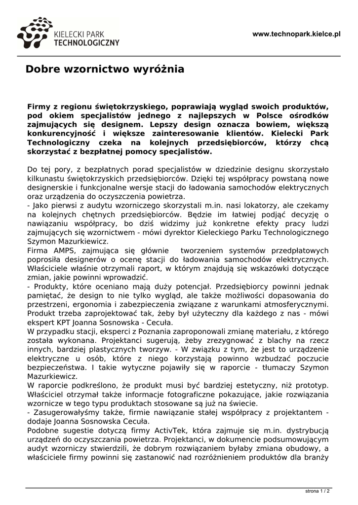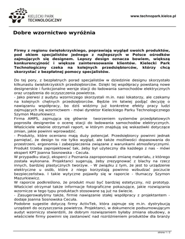 www.technopark.kielce.pl Dobre wzornictwo wyróżnia Firmy z regionu świętokrzyskiego, poprawiają wygląd swoich produktów, pod okiem specjalistów jednego z najlepszych w Polsce ośrodków zajmujących się designem. Lepszy design oznacza bowiem, większą konkurencyjność i większe zainteresowanie klientów. Kielecki Park Technologiczny czeka na kolejnych przedsiębiorców, którzy chcą skorzystać z bezpłatnej pomocy specjalistów. Do tej pory, z bezpłatnych porad specjalistów w dziedzinie designu skorzystało kilkunastu świętokrzyskich przedsiębiorców. Dzięki tej współpracy powstaną nowe designerskie i funkcjonalne wersje stacji do ładowania samochodów elektrycznych oraz urządzenia do oczyszczenia powietrza. - Jako pierwsi z audytu wzorniczego skorzystali m.in. nasi lokatorzy, ale czekamy na kolejnych chętnych przedsiębiorców. Będzie im łatwiej podjąć decyzję o nawiązaniu współpracy, bo dziś widzimy już konkretne efekty pracy ludzi zajmujących się wzornictwem - mówi dyrektor Kieleckiego Parku Technologicznego Szymon Mazurkiewicz. Firma AMPS, zajmująca się głównie tworzeniem systemów przedpłatowych poprosiła designerów o ocenę stacji do ładowania samochodów elektrycznych. Właściciele właśnie otrzymali raport, w którym znajdują się wskazówki dotyczące zmian, jakie powinni wprowadzić. - Produkty, które oceniano mają duży potencjał. Przedsiębiorcy powinni jednak pamiętać, że design to nie tylko wygląd, ale także możliwości dopasowania do przestrzeni, ergonomia i zabezpieczenia związane z warunkami atmosferycznymi. Produkt trzeba zaprojektować tak, żeby był użyteczny dla każdego z nas - mówi ekspert KPT Joanna Sosnowska - Cecuła. W przypadku stacji, eksperci z Poznania zaproponowali zmianę materiału, z którego została wykonana. Projektanci sugerują, żeby zrezygnować z blachy na rzecz innych, bardziej plastycznych tworzyw. - W związku z tym, że jest to urządzenie elektryczne u osób, które z niego korzystają powinno wzbudzać poczucie bezpieczeństwa. I takie wytyczne pojawiły się w raporcie - tłumaczy Szymon Mazurkiewicz. W raporcie podkreślono, że produkt musi być bardziej estetyczny, niż prototyp. Właściciel otrzymał także informacje fotograficzne pokazujące, jakie rozwiązania wzornicze w tego typu produktach stosowane są już na świecie. - Zasugerowałyśmy także, firmie nawiązanie stałej współpracy z projektantem dodaje Joanna Sosnowska Cecuła. Podobne sugestie dotyczą firmy ActivTek, która zajmuje się m.in. dystrybucją urządzeń do oczyszczania powietrza. Projektanci, w dokumencie podsumowującym audyt wzorniczy stwierdzili, że dobrym rozwiązaniem byłaby zmiana obudowy, a właściciele firmy powinni się zastanowić nad rozróżnieniem produktów dla branży strona 1 / 2 www.technopark.kielce.pl medycznej oraz biurowej. - Specjaliści w dziedzinie wzornictwa podkreślali, że konieczna jest także zmiana opakowania. Patrząc na nie powinniśmy od razu zobaczyć, iż mamy do czynienia z produktem, dzięki któremu środowisko będzie czystsze i zdrowsze - opowiada Szymon Mazurkiewicz. ActivTek otrzymał także dokumentację zdjęciową, która może stać się inspiracją dla właścicieli i zachęci ich do stałej współpracy z projektantami. Przedstawiciele Concordia Design, po spotkaniach ze świętokrzyskimi przedsiębiorcami podkreślają, że wielu z nich zaniedbuje stronę marketingową, a nawet dobry produkt trudno jest sprzedać bez właściwej reklamy. - Mamy nadzieję, że dzięki wskazówkom zawartym w raporcie nasze firmy ulepszą produkty a te będą cieszyć się dużym zainteresowaniem klientów - podsumowuje Szymon Mazurkiewicz. Audyty wzornicze są wykonywane dzięki realizacji przez Kielecki Park Technologiczny projektu "Kręgi Innowacji - rozwój zintegrowanych narzędzi wspierania innowacyjności województwa w obszarach o dużym potencjale wzrostu". strona 2 / 2 Powered by TCPDF (www.tcpdf.org)