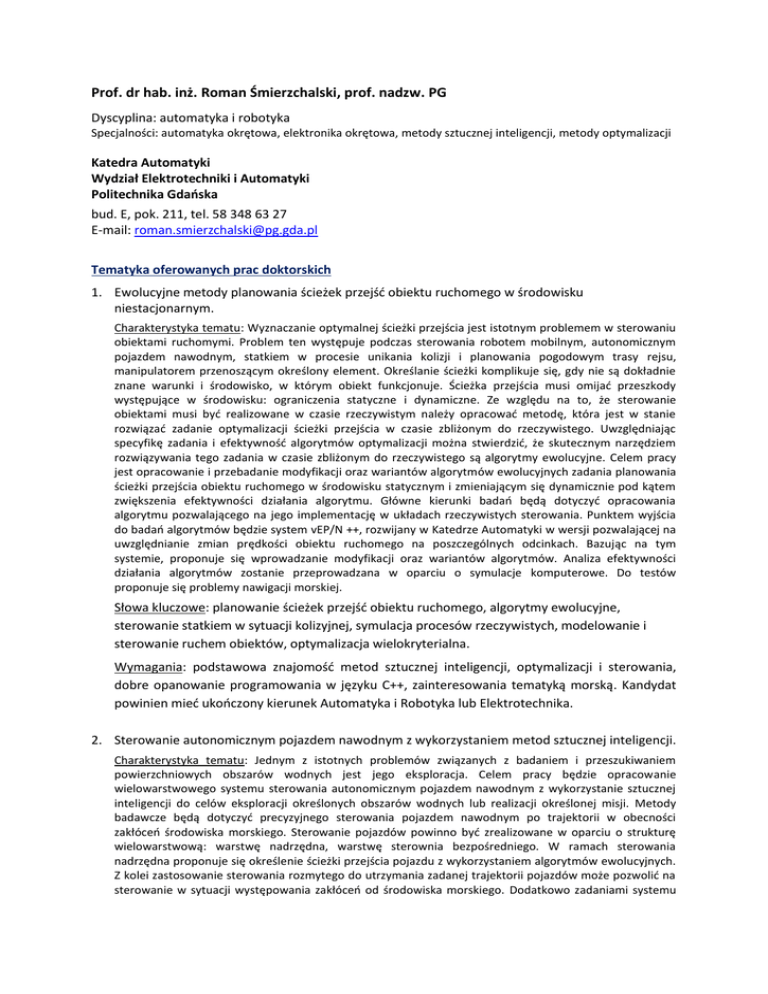 Prof. dr hab. inż. Roman Śmierzchalski, prof. nadzw. PG Dyscyplina: automatyka i robotyka Specjalności: automatyka okrętowa, elektronika okrętowa, metody sztucznej inteligencji, metody optymalizacji Katedra Automatyki Wydział Elektrotechniki i Automatyki Politechnika Gdańska bud. E, pok. 211, tel. 58 348 63 27 E-mail: [email protected] Tematyka oferowanych prac doktorskich 1. Ewolucyjne metody planowania ścieżek przejść obiektu ruchomego w środowisku niestacjonarnym. Charakterystyka tematu: Wyznaczanie optymalnej ścieżki przejścia jest istotnym problemem w sterowaniu obiektami ruchomymi. Problem ten występuje podczas sterowania robotem mobilnym, autonomicznym pojazdem nawodnym, statkiem w procesie unikania kolizji i planowania pogodowym trasy rejsu, manipulatorem przenoszącym określony element. Określanie ścieżki komplikuje się, gdy nie są dokładnie znane warunki i środowisko, w którym obiekt funkcjonuje. Ścieżka przejścia musi omijać przeszkody występujące w środowisku: ograniczenia statyczne i dynamiczne. Ze względu na to, że sterowanie obiektami musi być realizowane w czasie rzeczywistym należy opracować metodę, która jest w stanie rozwiązać zadanie optymalizacji ścieżki przejścia w czasie zbliżonym do rzeczywistego. Uwzględniając specyfikę zadania i efektywność algorytmów optymalizacji można stwierdzić, że skutecznym narzędziem rozwiązywania tego zadania w czasie zbliżonym do rzeczywistego są algorytmy ewolucyjne. Celem pracy jest opracowanie i przebadanie modyfikacji oraz wariantów algorytmów ewolucyjnych zadania planowania ścieżki przejścia obiektu ruchomego w środowisku statycznym i zmieniającym się dynamicznie pod kątem zwiększenia efektywności działania algorytmu. Główne kierunki badań będą dotyczyć opracowania algorytmu pozwalającego na jego implementację w układach rzeczywistych sterowania. Punktem wyjścia do badań algorytmów będzie system vEP/N ++, rozwijany w Katedrze Automatyki w wersji pozwalającej na uwzględnianie zmian prędkości obiektu ruchomego na poszczególnych odcinkach. Bazując na tym systemie, proponuje się wprowadzanie modyfikacji oraz wariantów algorytmów. Analiza efektywności działania algorytmów zostanie przeprowadzana w oparciu o symulacje komputerowe. Do testów proponuje się problemy nawigacji morskiej. Słowa kluczowe: planowanie ścieżek przejść obiektu ruchomego, algorytmy ewolucyjne, sterowanie statkiem w sytuacji kolizyjnej, symulacja procesów rzeczywistych, modelowanie i sterowanie ruchem obiektów, optymalizacja wielokryterialna. Wymagania: podstawowa znajomość metod sztucznej inteligencji, optymalizacji i sterowania, dobre opanowanie programowania w języku C++, zainteresowania tematyką morską. Kandydat powinien mieć ukończony kierunek Automatyka i Robotyka lub Elektrotechnika. 2. Sterowanie autonomicznym pojazdem nawodnym z wykorzystaniem metod sztucznej inteligencji. Charakterystyka tematu: Jednym z istotnych problemów związanych z badaniem i przeszukiwaniem powierzchniowych obszarów wodnych jest jego eksploracja. Celem pracy będzie opracowanie wielowarstwowego systemu sterowania autonomicznym pojazdem nawodnym z wykorzystanie sztucznej inteligencji do celów eksploracji określonych obszarów wodnych lub realizacji określonej misji. Metody badawcze będą dotyczyć precyzyjnego sterowania pojazdem nawodnym po trajektorii w obecności zakłóceń środowiska morskiego. Sterowanie pojazdów powinno być zrealizowane w oparciu o strukturę wielowarstwową: warstwę nadrzędna, warstwę sterownia bezpośredniego. W ramach sterowania nadrzędna proponuje się określenie ścieżki przejścia pojazdu z wykorzystaniem algorytmów ewolucyjnych. Z kolei zastosowanie sterowania rozmytego do utrzymania zadanej trajektorii pojazdów może pozwolić na sterowanie w sytuacji występowania zakłóceń od środowiska morskiego. Dodatkowo zadaniami systemu będzie utrzymanie zadanej pozycji, nadążanie za zadaną trajektorią przy jak najmniejszym zużyciu energii. Obiektem sterowania będzie pojazd nawodny o określonej dynamice, wyposażony w urządzenia pomiarowe nawigacyjne i elementy wykonawcze. Słowa kluczowe: modelowanie i sterowanie pojazdem nawodnym, logika rozmyta, algorytmy ewolucyjne, wielowarstwowa struktura sterowania. Wymagania: podstawowa znajomość zagadnień modelowania i sterowania, metod sztucznej inteligencji, zainteresowanie tematyką morską. Umiejętność oprogramowania w C++ i MatLab. Kandydat powinien mieć ukończony kierunek Automatyka i Robotyka lub Elektrotechnika. 3. Zarządzanie mocą w systemie elektroenergetycznym statków z dynamicznym pozycjonowaniem. Charakterystyka tematu: Statki z systemem DP znacznie upraszczają zadania i operacje wykonywane na morzu, szczególnie przy wydobyciu roby naftowej. Funkcje, jakie realizują te statki, są w stanie wyeliminować pracę holowników, a także charakteryzują się szybką reaktywnością na zmiany warunków pogodowych lub parametrów pracy. Przynosi to wszechstronność wykorzystania tego typu statków. Wadą systemów DP jest wysoki poziom złożoności rozwiązań i tym samym wrażliwość na awarie poszczególnych urządzeń, wchodzących w skład systemu DP. Za przykład może posłużyć zanik energii elektrycznej, brak napędu, a więc awaria steru strumieniowego, awaria urządzeń sterujących czy układów automatyki i pomiarowych. Aby podnieść poziom bezpieczeństwa pracy i dyspozycyjności systemów DP, nowoczesne rozwiązania rozbudowane są o dodatkowe urządzenia nadmiarowe. Dynamiczne pozycjonowanie generuje również duże zapotrzebowanie na moc. W zależności od wielkości, typu budowane statki mają zapotrzebowanie na moc rzędu kilkudziesięciu MW. Głównym odbiorcą energii są stery strumieniowe, których moc mieści się w przedziale 10 – 50 MW. Celem pracy będzie analiza systemu elektroenergetycznego statku DP, pod kątem bezpieczeństwa za