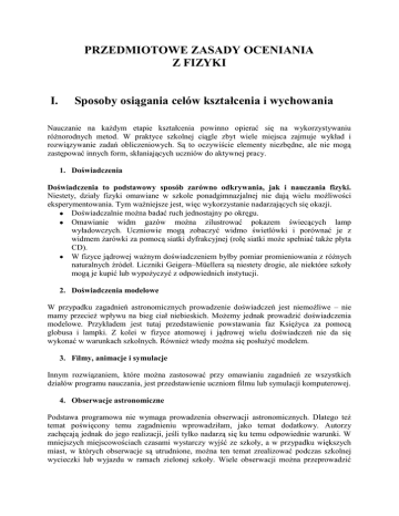 PRZEDMIOTOWE ZASADY OCENIANIA Z FIZYKI I. Sposoby osiągania celów kształcenia i wychowania Nauczanie na każdym etapie kształcenia powinno opierać się na wykorzystywaniu różnorodnych metod. W praktyce szkolnej ciągle zbyt wiele miejsca zajmuje wykład i rozwiązywanie zadań obliczeniowych. Są to oczywiście elementy niezbędne, ale nie mogą zastępować innych form, skłaniających uczniów do aktywnej pracy. 1. Doświadczenia Doświadczenia to podstawowy sposób zarówno odkrywania, jak i nauczania fizyki. Niestety, działy fizyki omawiane w szkole ponadgimnazjalnej nie dają wielu możliwości eksperymentowania. Tym ważniejsze jest, więc wykorzystanie nadarzających się okazji. Doświadczalnie można badać ruch jednostajny po okręgu. Omawianie widm gazów można zilustrować pokazem świecących lamp wyładowczych. Uczniowie mogą zobaczyć widmo świetlówki i porównać je z widmem żarówki za pomocą siatki dyfrakcyjnej (rolę siatki może spełniać także płyta CD). W fizyce jądrowej ważnym doświadczeniem byłby pomiar promieniowania z różnych naturalnych źródeł. Liczniki Geigera–Müellera są niestety drogie, ale niektóre szkoły mogą je kupić lub wypożyczyć z odpowiednich instytucji. 2. Doświadczenia modelowe W przypadku zagadnień astronomicznych prowadzenie doświadczeń jest niemożliwe – nie mamy przecież wpływu na bieg ciał niebieskich. Możemy jednak prowadzić doświadczenia modelowe. Przykładem jest tutaj przedstawienie powstawania faz Księżyca za pomocą globusa i lampki. Z kolei w fizyce atomowej i jądrowej wielu doświadczeń nie da się wykonać w warunkach szkolnych. Również wtedy można się posłużyć modelem. 3. Filmy, animacje i symulacje Innym rozwiązaniem, które można zastosować przy omawianiu zagadnień ze wszystkich działów programu nauczania, jest przedstawienie uczniom filmu lub symulacji komputerowej. 4. Obserwacje astronomiczne Podstawa programowa nie wymaga prowadzenia obserwacji astronomicznych. Dlatego też temat poświęcony temu zagadnieniu wprowadziłam, jako temat dodatkowy. Autorzy zachęcają jednak do jego realizacji, jeśli tylko nadarzą się ku temu odpowiednie warunki. W mniejszych miejscowościach czasami wystarczy wyjść ze szkoły, a w przypadku większych miast, w których obserwacje są utrudnione, można ten temat zrealizować podczas szkolnej wycieczki lub wyjazdu w ramach zielonej szkoły. Wiele obserwacji można przeprowadzić gołym okiem lub za pomocą najprostszych, niedrogich przyrządów, takich jak mała luneta czy lornetka. Obserwacje astronomiczne pozwalają zainteresować przedmiotem także uczniów, których zniechęciły do niego dotychczasowe trudności w nauce. Pozwalają się one wykazać aktywnością szerszej grupie uczniów. 5. Rozwiązywanie zadań obliczeniowych Zgodnie z Podstawą programową uczniowie powinni rozwiązywać proste zadania obliczeniowe. Określenie „proste” nie jest jednoznaczne, ale niemal niemożliwe jest podanie jednoznacznego kryterium dla wszystkich typów szkół i wszystkich uczniów. Można je rozumieć następująco: zadania powinny być na tyle proste, aby służyły zrozumieniu oraz utrwalaniu pojęć i praw fizyki, i jednocześnie nie stanowiły dla ucznia głównej trudności w nauce fizyki. W przypadku trudniejszych zadań uczniowie nie muszą rozwiązywać całego zadania na symbolach literowych i wyprowadzać ostatecznego wzoru, przedstawiającego szukane, jako funkcję danych. Dla wielu uczniów taki sposób jest zbyt trudny. Zamiast tego można po kolei obliczyć wartości liczbowe potrzebnych wielkości. Wyjaśnić to można na przykładzie typu zadań, który jako obowiązkowy wprowadza Podstawa programowa: obliczanie prędkości elektronu wybitego z metalu przez foton o danej długości fali. Zamiast wyprowadzać ogólny wzór, który dla wielu uczniów jest bardzo skomplikowany, można obliczyć po kolei wartości liczbowe: częstotliwość fotonu, jego energię, energię wybitego elektronu i wreszcie jego prędkość. Gdy pracujemy z uczniami o zróżnicowanym poziomie, możemy przedstawić różne sposoby rozwiązywania zadań. Wówczas uczniowie szczególnie uzdolnieni i zainteresowani przygotują się lepiej do nauki w zakresie rozszerzonym, a pozostali opanują umiejętność rozwiązywania zadań w wystarczającym dla nich zakresie. Szczegółowe trudności matematyczne W zadaniach obliczeniowych możemy wykorzystywać wyłącznie umiejętności z Podstawy programowej matematyki dla gimnazjum. Stwarza to trzy trudniejsze problemy: 1. Notacja wykładnicza – potrzebna jest do obliczeń we wszystkich działach. Zgodnie z Podstawą programową matematyki dla gimnazjum jest ona obowiązkowa na trzecim etapie kształcenia. Jednak dla ułatwienia w podręczniku przypomniane zostały zasady wykonywania działań w notacji wykładniczej. 2. Paralaksa – w ogólnym przypadku obliczenia dotyczące paralaksy wymagają znajomości trygonometrii, której zagadnienia zgodnie z Podstawą programową matematyki są obecnie omawiane dopiero na czwartym etapie kształcenia. Jednak przy niewielkich kątach można założyć, że odległość do gwiazdy jest odwrotnie proporcjonalna do kąta paralaksy. Takie założenie opiera się na przybliżeniu sinx ≈ x, z którego korzystamy przecież nawet w opisie ruchu wahadła (w zakresie rozszerzonym), gdy mamy do czynienia z kątami rzędu 10 °. Tymczasem kąt paralaksy heliocentrycznej stanowi ułamek sekundy. Pojęcie sekundy kątowej zostało przypomniane w podręczniku. 3. Czas połowicznego rozpadu – w ogólnym przypadku do rozwiązywania zadań potrzebne są potęgi o wykładniku ułamkowym i logarytmy (nieobecne w podstawie programowej matematyki w gimnazjum). Aby nie rezygnować z realistycznych zadań, w których czas nie jest wielokrotnością T1/2, możemy posłużyć się metodą graficzną, tzn. odczytywać informacje z wykresu zamieszczonego w podręczniku przedstawi