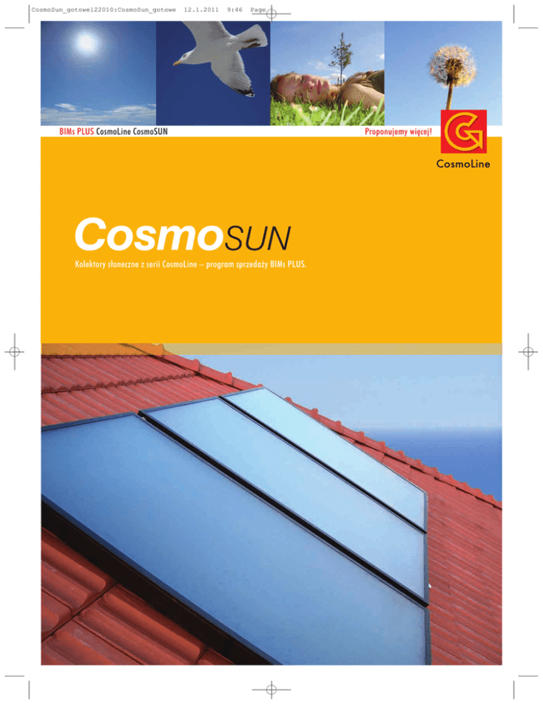 CosmoSun_gotowe122010:CosmoSun_gotowe 12.1.2011 9:46 Page 1 BIMs PLUS CosmoLine CosmoSUN Kolektory słoneczne z serii CosmoLine – program sprzeda˝y BIMs PLUS. Proponujemy wi´cej! CosmoSun_gotowe122010:CosmoSun_gotowe 10.1.2011 11:09 Page 2 Spis treÊci Wst´p Promieniowanie słoneczne . . . . . . . . . . . . . . . . . . . . . . . . . . . . . . . . . . . . . . . . . . . . . . . . . . . . . . . . . . . . . . . . . . . . . . . . . . . . . . . . . . . . . . . . . . . . . . . . . .3 Zasada działania instalacji solarnej . . . . . . . . . . . . . . . . . . . . . . . . . . . . . . . . . . . . . . . . . . . . . . . . . . . . . . . . . . . . . . . . . . . . . . . . . . . . . . . . . . . . . . . . . . . .4 Zasady skutecznego wykorzystania promieniowania słonecznego . . . . . . . . . . . . . . . . . . . . . . . . . . . . . . . . . . . . . . . . . . . . . . . . . . . . . . . . . . . . . . . . . . . . . . .5 Zastosowanie instalacji solarnych . . . . . . . . . . . . . . . . . . . . . . . . . . . . . . . . . . . . . . . . . . . . . . . . . . . . . . . . . . . . . . . . . . . . . . . . . . . . . . . . . . . . . . . . . . . . . .6 Dane techniczne Elementy składowe instalacji solarnych . . . . . . . . . . . . . . . . . . . . . . . . . . . . . . . . . . . . . . . . . . . . . . . . . . . . . . . . . . . . . . . . . . . . . . . . . . . . . . . . . . . . . . . . . .7 Kolektor słoneczny CosmoSUN Basic – zasada działania . . . . . . . . . . . . . . . . . . . . . . . . . . . . . . . . . . . . . . . . . . . . . . . . . . . . . . . . . . . . . . . . . . . . . . . . . . . . .8 Kolektor słoneczny CosmoSUN Basic – budowa, elementy składowe . . . . . . . . . . . . . . . . . . . . . . . . . . . . . . . . . . . . . . . . . . . . . . . . . . . . . . . . . . . . . . . . . . . . .9 Kolektor słoneczny CosmoSUN Basic – dane techniczne . . . . . . . . . . . . . . . . . . . . . . . . . . . . . . . . . . . . . . . . . . . . . . . . . . . . . . . . . . . . . . . . . . . . . . . . . . . . .13 Kolektor słoneczny CosmoSUN Basic – warianty połàczeƒ hydraulicznych . . . . . . . . . . . . . . . . . . . . . . . . . . . . . . . . . . . . . . . . . . . . . . . . . . . . . . . . . . . . . . . .15 Regulatory solarne serii RSS . . . . . . . . . . . . . . . . . . . . . . . . . . . . . . . . . . . . . . . . . . . . . . . . . . . . . . . . . . . . . . . . . . . . . . . . . . . . . . . . . . . . . . . . . . . . . . . .16 Regulatory solarne serii PS . . . . . . . . . . . . . . . . . . . . . . . . . . . . . . . . . . . . . . . . . . . . . . . . . . . . . . . . . . . . . . . . . . . . . . . . . . . . . . . . . . . . . . . . . . . . . . . . . .18 Grupy pompowe GPS i Single . . . . . . . . . . . . . . . . . . . . . . . . . . . . . . . . . . . . . . . . . . . . . . . . . . . . . . . . . . . . . . . . . . . . . . . . . . . . . . . . . . . . . . . . . . . . . . .19 Naczynia przeponowe serii Solar M . . . . . . . . . . . . . . . . . . . . . . . . . . . . . . . . . . . . . . . . . . . . . . . . . . . . . . . . . . . . . . . . . . . . . . . . . . . . . . . . . . . . . . . . . . . .21 Podgrzewacze solarne c.w.u. Fish 200-1500 S1 . . . . . . . . . . . . . . . . . . . . . . . . . . . . . . . . . . . . . . . . . . . . . . . . . . . . . . . . . . . . . . . . . . . . . . . . . . . . . . . . . .22 Podgrzewacze solarne c.w.u. Fish 200-1500 S2 . . . . . . . . . . . . . . . . . . . . . . . . . . . . . . . . . . . . . . . . . . . . . . . . . . . . . . . . . . . . . . . . . . . . . . . . . . . . . . . . . .24 Zbiorniki multiwalentne c.w.u./c.o. Fish 600-1500 S3 . . . . . . . . . . . . . . . . . . . . . . . . . . . . . . . . . . . . . . . . . . . . . . . . . . . . . . . . . . . . . . . . . . . . . . . . . . . . .26 Zbiorniki buforowe Fish 500-2000 S4/5 . . . . . . . . . . . . . . . . . . . . . . . . . . . . . . . . . . . . . . . . . . . . . . . . . . . . . . . . . . . . . . . . . . . . . . . . . . . . . . . . . . . . . . . .28 Grza∏ki elektryczne do podgrzewaczy i zbiorników Fish . . . . . . . . . . . . . . . . . . . . . . . . . . . . . . . . . . . . . . . . . . . . . . . . . . . . . . . . . . . . . . . . . . . . . . . . . . . . . .30 System monta˝owy . . . . . . . . . . . . . . . . . . . . . . . . . . . . . . . . . . . . . . . . . . . . . . . . . . . . . . . . . . . . . . . . . . . . . . . . . . . . . . . . . . . . . . . . . . . . . . . . . . . . . . .31 System połàczeƒ . . . . . . . . . . . . . . . . . . . . . . . . . . . . . . . . . . . . . . . . . . . . . . . . . . . . . . . . . . . . . . . . . . . . . . . . . . . . . . . . . . . . . . . . . . . . . . . . . . . . . . . . .32 Przewody elastyczne Sunflex . . . . . . . . . . . . . . . . . . . . . . . . . . . . . . . . . . . . . . . . . . . . . . . . . . . . . . . . . . . . . . . . . . . . . . . . . . . . . . . . . . . . . . . . . . . . . . . .33 Zestawy po∏àczeniowe Sunflex . . . . . . . . . . . . . . . . . . . . . . . . . . . . . . . . . . . . . . . . . . . . . . . . . . . . . . . . . . . . . . . . . . . . . . . . . . . . . . . . . . . . . . . . . . . . . . .34 NoÊnik ciepła . . . . . . . . . . . . . . . . . . . . . . . . . . . . . . . . . . . . . . . . . . . . . . . . . . . . . . . . . . . . . . . . . . . . . . . . . . . . . . . . . . . . . . . . . . . . . . . . . . . . . . . . . . .35 Urzàdzenia do napełniania/odpowietrzania instalacji solarnej . . . . . . . . . . . . . . . . . . . . . . . . . . . . . . . . . . . . . . . . . . . . . . . . . . . . . . . . . . . . . . . . . . . . . . . .36 Wytyczne projektowe Projektowanie instalacji solarnych . . . . . . . . . . . . . . . . . . . . . . . . . . . . . . . . . . . . . . . . . . . . . . . . . . . . . . . . . . . . . . . . . . . . . . . . . . . . . . . . . . . . . . . . . . . .37 Wybrane przykłady schematów hydraulicznych instalacji solarnej . . . . . . . . . . . . . . . . . . . . . . . . . . . . . . . . . . . . . . . . . . . . . . . . . . . . . . . . . . . . . . . . . . . . . .38 Dobór pojemnoÊci podgrzewacza solarnego . . . . .
