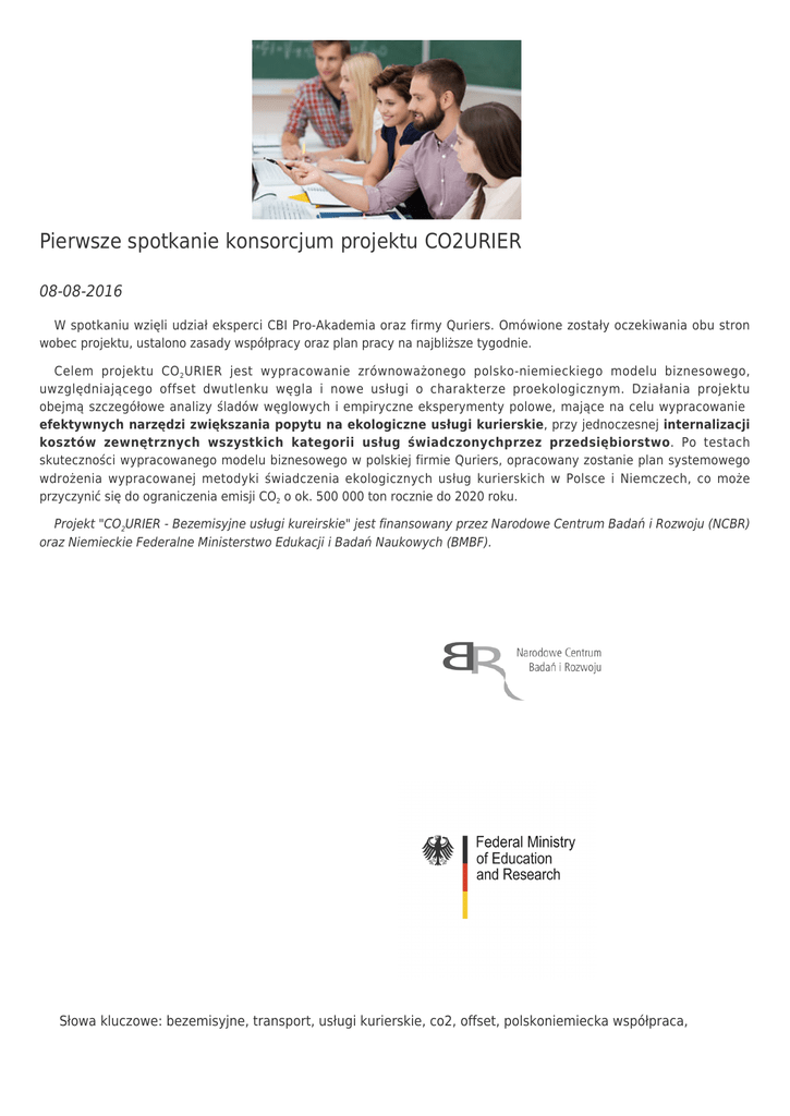 Pierwsze spotkanie konsorcjum projektu CO2URIER 08-08-2016 W spotkaniu wzięli udział eksperci CBI Pro-Akademia oraz firmy Quriers. Omówione zostały oczekiwania obu stron wobec projektu, ustalono zasady współpracy oraz plan pracy na najbliższe tygodnie. Celem projektu CO 2 URIER jest wypracowanie zrównoważonego polsko-niemieckiego modelu biznesowego, uwzględniającego offset dwutlenku węgla i nowe usługi o charakterze proekologicznym. Działania projektu obejmą szczegółowe analizy śladów węglowych i empiryczne eksperymenty polowe, mające na celu wypracowanie efektywnych narzędzi zwiększania popytu na ekologiczne usługi kurierskie, przy jednoczesnej internalizacji kosztów zewnętrznych wszystkich kategorii usług świadczonychprzez przedsiębiorstwo. Po testach skuteczności wypracowanego modelu biznesowego w polskiej firmie Quriers, opracowany zostanie plan systemowego wdrożenia wypracowanej metodyki świadczenia ekologicznych usług kurierskich w Polsce i Niemczech, co może przyczynić się do ograniczenia emisji CO2 o ok. 500 000 ton rocznie do 2020 roku. Projekt "CO2URIER - Bezemisyjne usługi kureirskie" jest finansowany przez Narodowe Centrum Badań i Rozwoju (NCBR) oraz Niemieckie Federalne Ministerstwo Edukacji i Badań Naukowych (BMBF). Słowa kluczowe: bezemisyjne, transport, usługi kurierskie, co2, offset, polskoniemiecka współpraca, polska, niemcy, ncbr, stair Strona CBI Pro-Akademia używa ciasteczek (cookies), dzięki którym nasz serwis może działać lepiej. Zobacz