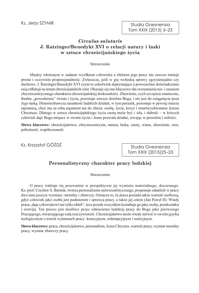 Ks. Jerzy SZYMIK Studia Gnesnensia Tom XXIX (2015) 5–23 Circulus salutaris J. Ratzinger/Benedykt XVI o relacji natury i łaski w sztuce chrześcijańskiego życia Streszczenie Między włożonym w zadanie wysiłkiem człowieka a efektem jego pracy nie zawsze istnieje prosta i oczywista proporcjonalność. Zwłaszcza, jeśli w grę wchodzą sprawy egzystencjalne czy duchowe. J. Ratzinger/Benedykt XVI czyni to cokolwiek deprymujące a powszechne doświadczenie osią refleksji na temat chrześcijańskich cnót. Okazuje się ono kluczowe dla zrozumienia teo- i zarazem chrystocentrycznego charakteru chrześcijańskiej doskonałości. Zbawienie, czyli szczęście ostateczne, finalne „powodzenie” świata i życia, pozostaje zawsze dziełem Boga, i nie jest do osiągnięcia poza Jego łaską. Historiozbawcza zasadność ludzkich działań, w tym porażek, pozostaje w pewnej mierze tajemnicą, choć ma za sobą argument nie do zbicia: osobę, życie, krzyż i zmartwychwstanie Jezusa Chrystusa. Dlatego w sztuce chrześcijańskiego życia cnotą może być i siła, i słabość – w których człowiek daje Bogu miejsce w swoim życiu i Jemu pozwala działać, trwając w prawdzie i miłości. Słowa kluczowe: chrześcijaństwo, chrystocentryzm, natura, łaska, cnoty, wiara, zbawienie, etos, pobożność, współczesność. Ks. Krzysztof GÓŹDŹ Studia Gnesnensia Tom XXIX (2015)25–33 Personalistyczny charakter pracy ludzkiej Streszczenie O pracy traktuje się przeważnie w perspektywie jej wymiaru materialnego, doczesnego. Ks. prof. Czesław S. Bartnik, twórca personalizmu uniwersalistycznego, proponuje odnaleźć w pracy dwa inne jeszcze wymiary: moralny i zbawczy. Oznacza to, że praca posiada także wartość osobową, gdyż człowiek jako osoba jest podmiotem i sprawcą pracy, a także jej celem (Jan Paweł II). Wtedy praca „daje człowiekowi nie tylko chleb”, lecz przede wszystkim kształtuje go jako osobę, przekształca i rozwija. Ten proces jest możliwy przez odniesienie ludzkiej pracy do Boga jako pierwszego Pracującego, stwarzającego całą rzeczywistość. Chrześcijaństwo może wtedy mówić w swoim języku teologicznym o trzech wymiarach pracy: kreacyjnym, redempcyjnym i soteryjnym. Słowa kluczowe: praca, chrześcijaństwo, personalizm, Jezus Chrystus, wartość pracy, wymiar moralny pracy, wymiar zbawczy pracy. Ks. Bogdan FERDEK Studia Gnesnensia Tom XXIX (2015) 35–46 Modlitwa o uzdrowienie w świetle katolickiej dogmatyki Streszczenie W Polsce pojawiło się ostatnio nowe zjawisko, którym jest coraz większa liczba grup modlitewnych łączących charyzmat uzdrawiania z celebracjami liturgicznymi. Z duszpasterskiego punktu widzenia Msze połączone z modlitwami o uzdrowienie można by uznać za „sukces”. Na ten „sukces” należałoby jednak spojrzeć w świetle katolickiej dogmatyki. Z jakimi zatem prawdami katolickiej wiary musi się liczyć modlitwa o uzdrowienie łączona z charyzmatem uzdrowienia? Na modlitwę o uzdrowienie trzeba jednak patrzeć po katolicku, czyli całościowo, nie w oderwaniu, lecz w związku z całością prawd wiary. Skoro choroba i zdrowie wpisane są w najważniejsze bieguny historii zbawienia – upadek Adama i odkupienie dokonane przez Nowego Adama, to modlitwa o uzdrowienie musi uwzględniać całe lex credendi. Jeżeli katolicy przejmują zielonoświątkowe formy modlitwy o uzdrowienie, to muszą dokonywać ich reinterpretacji w świetle katolickiego lex credendi – od trynitologii do eschatologii. Nie mogą natomiast przyjmować zielonoświątkowych form modlitwy o uzdrowienie wraz ze stojącą za nimi zielonoświątkową teologią. Katolickie lex orandi dotyczące łaski uzdrawiania w jednym Duchu musi wyrażać katolickie lex credendi. Słowa kluczowe: modlitwa o uzdrowienie, celebracje liturgiczne, choroba, uzdrowienie, dogmat. Bp Henryk WEJMAN Studia Gnesnensia Tom XXIX (2015) 47–56 Miłosierny wymiar zadań duszpasterskich w świetle bulli papieża Franciszka Misericordiae vultus Streszczenie Zasadnicza treść artykułu koncentruje się na wielowymiarowości posługi duszpastersko-katechetycznej w kontekście zbliżającego się roku miłosierdzia, oficjalnie ogłoszonego przez papieża Franciszka opublikowaniem bulli Misericordiae vultus. Właśnie ta bulla stała się bazą dla refleksji nad tak określonym celem. Jego urzeczywistnienie nie mogło więc nie rozpocząć się od określenia natury miłosierdzia Bożego. Podjęcie tego kroku w refleksji było o tyle zasadne, że to właśnie miłosierdzie Boże tkwi u źródła istnienia człowieka i stanowi rdzeń jego egzystowania na ziemi. Odsłonięcie natury tegoż miłosierdzia umożliwiło z kolei ukazanie podstawy powinności okazywania przez nas miłosierdzia drugiemu człowiekowi. Tę powinność papież Franciszek ujął w zwięzłym stwierdzeniu w analizowanej bulli: Jesteśmy wezwani do życia miłosierdziem, ponieważ to nam zostało najpierw udzielone miłosierdzie przez Boga (MV 9). Prezentacja postawy miłosierdzia, czyli jego udzielenie przez Boga człowiekowi i odpowiedź na nie ze strony człowieka, dała sposobność do ukazania implikacji pastoralnych, wskazywanych przez papieża Franciszka w bulli. Pierwszą spośród nich winno być medytowanie słowa Bożego, drugą świadczenie miłosierdzia innym poprzez niesądzenie ich, przebaczanie przewinień i czynne wsparcie w potrzebie, a trzecią przepowiadanie miłosierdzia Bożego. Te trzy formy okazywania miłosierdzia bliźnim stanowią – według papieża – najwłaściwszy sposób przeżycia roku miłosierdzia, a zarazem odnowienia relacji interpersonalnych i oddanie chwały Bogu. Słowa kluczowe: Bulla papieża Franciszka Misericordiae vultus, miłosierdzie, medytowanie słowa Bożego, świadczenie miłosierdzia, przepowiadanie miłosierdzia Bożego, duszpasterstwo, posługa duszpastersko-katechetyczna. Ks. Jarosław MOSKAŁYK Studia Gnesnensia Tom XXIX (2015) 57–67 Wyzwolenie ukrytych pr