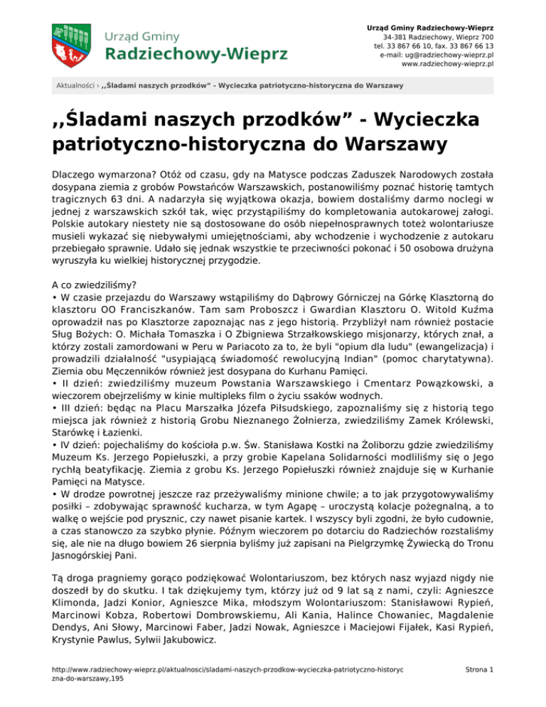 Urząd Gminy Radziechowy-Wieprz 34-381 Radziechowy, Wieprz 700 tel. 33 867 66 10, fax. 33 867 66 13 e-mail: [email protected] www.radziechowy-wieprz.pl Aktualności › ,,Śladami naszych przodków” - Wycieczka patriotyczno-historyczna do Warszawy ,,Śladami naszych przodków” - Wycieczka patriotyczno-historyczna do Warszawy Dlaczego wymarzona? Otóż od czasu, gdy na Matysce podczas Zaduszek Narodowych została dosypana ziemia z grobów Powstańców Warszawskich, postanowiliśmy poznać historię tamtych tragicznych 63 dni. A nadarzyła się wyjątkowa okazja, bowiem dostaliśmy darmo noclegi w jednej z warszawskich szkół tak, więc przystąpiliśmy do kompletowania autokarowej załogi. Polskie autokary niestety nie są dostosowane do osób niepełnosprawnych toteż wolontariusze musieli wykazać się niebywałymi umiejętnościami, aby wchodzenie i wychodzenie z autokaru przebiegało sprawnie. Udało się jednak wszystkie te przeciwności pokonać i 50 osobowa drużyna wyruszyła ku wielkiej historycznej przygodzie. A co zwiedziliśmy? • W czasie przejazdu do Warszawy wstąpiliśmy do Dąbrowy Górniczej na Górkę Klasztorną do klasztoru OO Franciszkanów. Tam sam Proboszcz i Gwardian Klasztoru O. Witold Kuźma oprowadził nas po Klasztorze zapoznając nas z jego historią. Przybliżył nam również postacie Sług Bożych: O. Michała Tomaszka i O Zbigniewa Strzałkowskiego misjonarzy, których znał, a którzy zostali zamordowani w Peru w Pariacoto za to, że byli "opium dla ludu" (ewangelizacja) i prowadzili działalność "usypiającą świadomość rewolucyjną Indian" (pomoc charytatywna). Ziemia obu Męczenników również jest dosypana do Kurhanu Pamięci. • II dzień: zwiedziliśmy muzeum Powstania Warszawskiego i Cmentarz Powązkowski, a wieczorem obejrzeliśmy w kinie multipleks film o życiu ssaków wodnych. • III dzień: będąc na Placu Marszałka Józefa Piłsudskiego, zapoznaliśmy się z historią tego miejsca jak również z historią Grobu Nieznanego Żołnierza, zwiedziliśmy Zamek Królewski, Starówkę i Łazienki. • IV dzień: pojechaliśmy do kościoła p.w. Św. Stanisława Kostki na Żoliborzu gdzie zwiedziliśmy Muzeum Ks. Jerzego Popiełuszki, a przy grobie Kapelana Solidarności modliliśmy się o Jego rychłą beatyfikację. Ziemia z grobu Ks. Jerzego Popiełuszki również znajduje się w Kurhanie Pamięci na Matysce. • W drodze powrotnej jeszcze raz przeżywaliśmy minione chwile; a to jak przygotowywaliśmy posiłki – zdobywając sprawność kucharza, w tym Agapę – uroczystą kolacje pożegnalną, a to walkę o wejście pod prysznic, czy nawet pisanie kartek. I wszyscy byli zgodni, że było cudownie, a czas stanowczo za szybko płynie. Późnym wieczorem po dotarciu do Radziechów rozstaliśmy się, ale nie na długo bowiem 26 sierpnia byliśmy już zapisani na Pielgrzymkę Żywiecką do Tronu Jasnogórskiej Pani. Tą droga pragniemy gorąco podziękować Wolontariuszom, bez których nasz wyjazd nigdy nie doszedł by do skutku. I tak dziękujemy tym, którzy już od 9 lat są z nami, czyli: Agnieszce Klimonda, Jadzi Konior, Agnieszce Mika, młodszym Wolontariuszom: Stanisławowi Rypień, Marcinowi Kobza, Robertowi Dombrowskiemu, Ali Kania, Halince Chowaniec, Magdalenie Dendys, Ani Słowy, Marcinowi Faber, Jadzi Nowak, Agnieszce i Maciejowi Fijałek, Kasi Rypień, Krystynie Pawlus, Sylwii Jakubowicz. http://www.radziechowy-wieprz.pl/aktualnosci/sladami-naszych-przodkow-wycieczka-patriotyczno-historyc zna-do-warszawy,195 Strona 1 Urząd Gminy Radziechowy-Wieprz 34-381 Radziechowy, Wieprz 700 tel. 33 867 66 10, fax. 33 867 66 13 e-mail: [email protected] www.radziechowy-wieprz.pl Aktualności › ,,Śladami naszych przodków” - Wycieczka patriotyczno-historyczna do Warszawy Jadwiga Klimonda http://www.radziechowy-wieprz.pl/aktualnosci/sladami-naszych-przodkow-wycieczka-patriotyczno-historyc zna-do-warszawy,195 Strona 2
