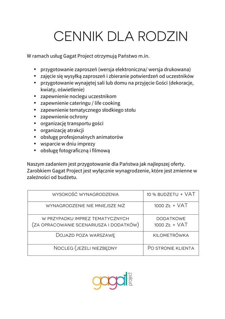 CENNIK DLA RODZIN W ramach usług Gagat Project otrzymują Państwo m.in. • przygotowanie zaproszeń (wersja elektroniczna/ wersja drukowana) • zajęcie się wysyłką zaproszeń i zbieranie potwierdzeń od uczestników • przygotowanie wynajętej sali lub domu na przyjęcie Gości (dekoracje, kwiaty, oświetlenie) • zapewnienie noclegu uczestnikom • zapewnienie cateringu / life cooking • zapewnienie tematycznego słodkiego stołu • zapewnienie ochrony • organizację transportu gości • organizację atrakcji • obsługę profesjonalnych animatorów • wsparcie w dniu imprezy • obsługę fotograficzną i filmową Naszym zadaniem jest przygotowanie dla Państwa jak najlepszej oferty. Zarobkiem Gagat Project jest wyłącznie wynagrodzenie, które jest zmienne w zależności od budżetu. wysokość wynagrodzenia 10 % budżetu + VAT wynagrodzenie nie mniejsze niż 1000 zł + VAT w przypadku imprez tematycznych (za opracowanie scenariusza i dodatków) dodatkowe 1000 zł + VAT Dojazd poza warszawę kilometrówka Nocleg (jeżeli niezbędny Po stronie klienta