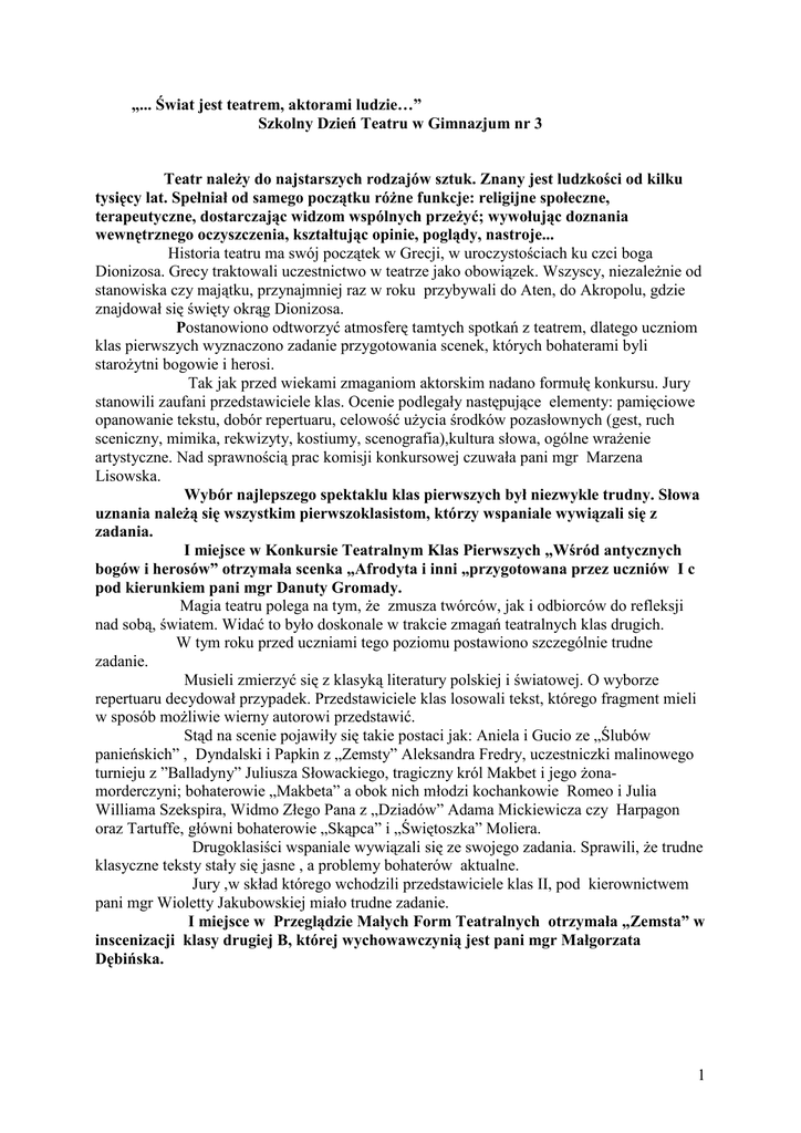 „... Świat jest teatrem, aktorami ludzie…” Szkolny Dzień Teatru w Gimnazjum nr 3 Teatr naleŜy do najstarszych rodzajów sztuk. Znany jest ludzkości od kilku tysięcy lat. Spełniał od samego początku róŜne funkcje: religijne społeczne, terapeutyczne, dostarczając widzom wspólnych przeŜyć; wywołując doznania wewnętrznego oczyszczenia, kształtując opinie, poglądy, nastroje... Historia teatru ma swój początek w Grecji, w uroczystościach ku czci boga Dionizosa. Grecy traktowali uczestnictwo w teatrze jako obowiązek. Wszyscy, niezaleŜnie od stanowiska czy majątku, przynajmniej raz w roku przybywali do Aten, do Akropolu, gdzie znajdował się święty okrąg Dionizosa. Postanowiono odtworzyć atmosferę tamtych spotkań z teatrem, dlatego uczniom klas pierwszych wyznaczono zadanie przygotowania scenek, których bohaterami byli staroŜytni bogowie i herosi. Tak jak przed wiekami zmaganiom aktorskim nadano formułę konkursu. Jury stanowili zaufani przedstawiciele klas. Ocenie podlegały następujące elementy: pamięciowe opanowanie tekstu, dobór repertuaru, celowość uŜycia środków pozasłownych (gest, ruch sceniczny, mimika, rekwizyty, kostiumy, scenografia),kultura słowa, ogólne wraŜenie artystyczne. Nad sprawnością prac komisji konkursowej czuwała pani mgr Marzena Lisowska. Wybór najlepszego spektaklu klas pierwszych był niezwykle trudny. Słowa uznania naleŜą się wszystkim pierwszoklasistom, którzy wspaniale wywiązali się z zadania. I miejsce w Konkursie Teatralnym Klas Pierwszych „Wśród antycznych bogów i herosów” otrzymała scenka „Afrodyta i inni „przygotowana przez uczniów I c pod kierunkiem pani mgr Danuty Gromady. Magia teatru polega na tym, Ŝe zmusza twórców, jak i odbiorców do refleksji nad sobą, światem. Widać to było doskonale w trakcie zmagań teatralnych klas drugich. W tym roku przed uczniami tego poziomu postawiono szczególnie trudne zadanie. Musieli zmierzyć się z klasyką literatury polskiej i światowej. O wyborze repertuaru decydował przypadek. Przedstawiciele klas losowali tekst, którego fragment mieli w sposób moŜliwie wierny autorowi przedstawić. Stąd na scenie pojawiły się takie postaci jak: Aniela i Gucio ze „Ślubów panieńskich” , Dyndalski i Papkin z „Zemsty” Aleksandra Fredry, uczestniczki malinowego turnieju z ”Balladyny” Juliusza Słowackiego, tragiczny król Makbet i jego Ŝonamorderczyni; bohaterowie „Makbeta” a obok nich młodzi kochankowie Romeo i Julia Williama Szekspira, Widmo Złego Pana z „Dziadów” Adama Mickiewicza czy Harpagon oraz Tartuffe, główni bohaterowie „Skąpca” i „Świętoszka” Moliera. Drugoklasiści wspaniale wywiązali się ze swojego zadania. Sprawili, Ŝe trudne klasyczne teksty stały się jasne , a problemy bohaterów aktualne. Jury ,w skład którego wchodzili przedstawiciele klas II, pod kierownictwem pani mgr Wioletty Jakubowskiej miało trudne zadanie. I miejsce w Przeglądzie Małych Form Teatralnych otrzymała „Zemsta” w inscenizacji klasy drugiej B, której wychowawczynią jest pani mgr Małgorzata Dębińska. 1 Teatr to :aktor – drama, czyli zdarzenie - słowo. Uczniowie klas trzecich musieli podjąć trud pracy ze słowem. Zmierzyli się z niezwykle trudną rolą ... mówcy. Musieli przygotować przemówienia na temat ”Gusta współczesnych Polaków”. Oceniając oracje brano pod uwagę nie tylko ciekawą, treść, ale równieŜ piękno, czystość polszczyzny oraz umiejętność swobodnego wypowiadania się i poprawną dykcję. Jury stanowili młodsi koledzy oraz polonistki. Obradom przewodniczył mgr Sylwester Bieńkowski. Szkolny Konkurs Oratorski wygrał Piotr Odziemkowski, uczeń klasy III f, który wygłaszał autorską orację. Jedyne wyróŜnienie tego konkursu otrzymała Alicja Knop z klasy 3g. Są uczniami pani mgr Jadwigi Stankiewicz. Oboje będą reprezentować Gimnazjum nr 3 w IV Powiatowym Konkursie Oratorskim „Złotousty 2009,który odbędzie się 1 kwietnia 2009 roku. Nagrody ufundowane przez Radę Rodziców Gimnazjum nr 3 wręczał dyrektor szkoły Pan mgr Mirosław Piotrowicz podziękował organizatorkom (Danucie Gromadzie, Małgorzacie Liwosz-Rogozińskiej ,Ewie Tuziemskiej ), wszystkim uczniom oraz wychowawcom klas za to, Ŝe tak dobrze zaprezentowali się w czasie Szkolnego Dnia Teatru. Ewa Tuziemska 2