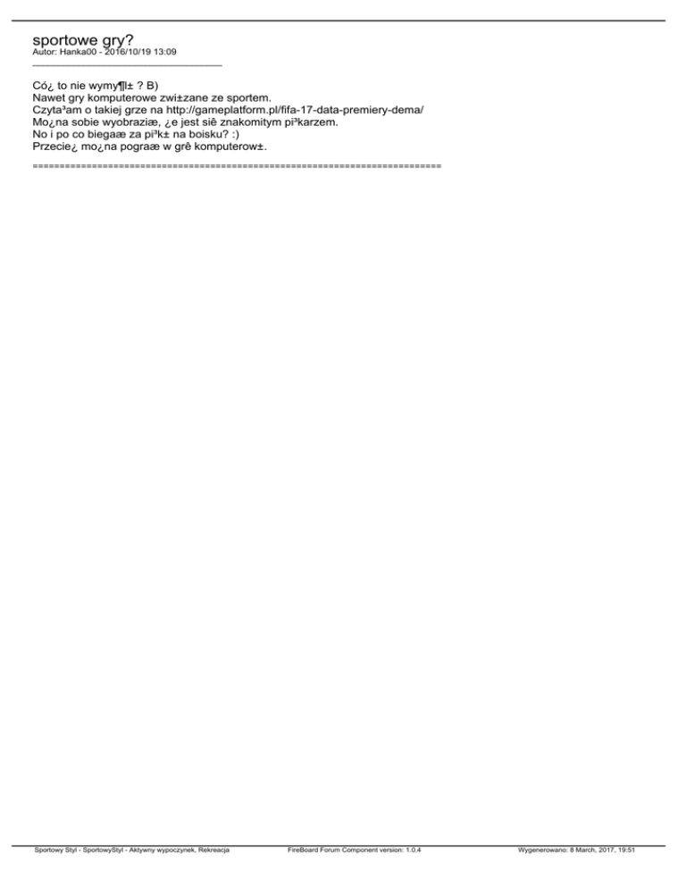 sportowe gry? Autor: Hanka00 - 2016/10/19 13:09 _____________________________________ Có¿ to nie wymy¶l± ? B) Nawet gry komputerowe zwi±zane ze sportem. Czyta³am o takiej grze na http://gameplatform.pl/fifa-17-data-premiery-dema/ Mo¿na sobie wyobraziæ, ¿e jest siê znakomitym pi³karzem. No i po co biegaæ za pi³k± na boisku? :) Przecie¿ mo¿na pograæ w grê komputerow±. ============================================================================ Sportowy Styl - SportowyStyl - Aktywny wypoczynek, Rekreacja FireBoard Forum Component version: 1.0.4 Wygenerowano: 8 March, 2017, 19:51