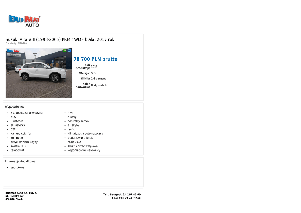 Suzuki Vitara II (1998-2005) PRM 4WD - biała, 2017 rok Kod oferty: BMA-960 78 700 PLN brutto Rok 2017 produkcji: Wersja: SUV Silnik: 1.6 benzyna Kolor Biały metallic nadwozia: Wyposażenie: - 7 x poduszka powietrzna ABS Bluetooth el. lusterka ESP kamera cofania komputer przyciemniane szyby światła LED tempomat - 4x4 alufelgi centralny zamek el. szyby Isofix klimatyzacja automatyczna podgrzewane fotele radio / CD światła przeciwmgłowe wspomaganie kierownicy Informacje dodatkowe: - zabytkowy Budmat Auto Sp. z o. o. ul. Bielska 67 09-400 Płock Tel.: Peugeot: 24 267 47 60 Fax: +48 24 2674723