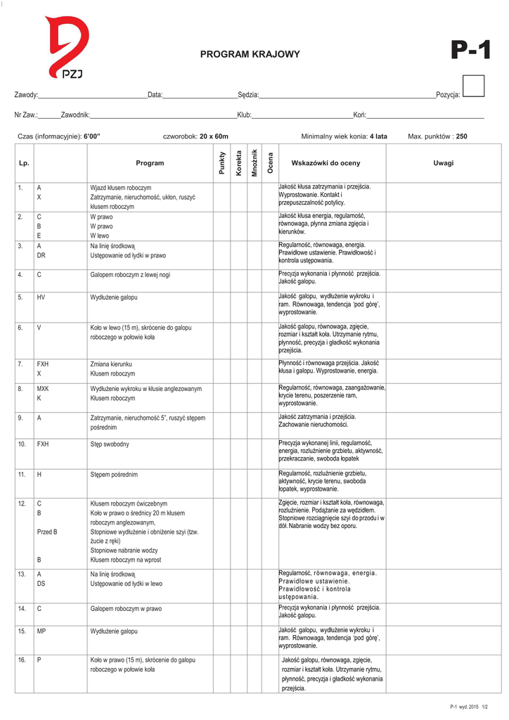 P-1 PROGRAM KRAJOWY Zawody: Sędzia: Zawodnik: Pozycja: Klub: Ocena Program Minimalny wiek konia: 4 lata Mnożnik Lp. Koń: czworobok: 20 x 60m Korekta Czas (informacyjnie): 6’00” Punkty Nr Zaw.: Data: Wskazówki do oceny Jakość kłusa zatrzymania i przejścia. Wyprostowanie. Kontakt i przepuszczalność potylicy. C B E A DR Wjazd kłusem roboczym Zatrzymanie, nieruchomość, ukłon, ruszyć kłusem roboczym W prawo W prawo W lewo Na linię środkową Ustępowanie od łydki w prawo 4. C Galopem roboczym z lewej nogi Precyzja wykonania i płynność przejścia. Jakość galopu. 5. HV Wydłużenie galopu Jakość galopu, wydłużenie wykroku i ram. Równowaga, tendencja ‘pod górę’, wyprostowanie. 6. V Koło w lewo (15 m), skrócenie do galopu roboczego w połowie koła Jakość galopu, równowaga, zgięcie, rozmiar i kształt koła. Utrzymanie rytmu, płynność, precyzja i gładkość wykonania przejścia. 7. FXH X Zmiana kierunku Kłusem roboczym Płynność i równowaga przejścia. Jakość kłusa i galopu. Wyprostowanie, energia. 8. MXK K Wydłużenie wykroku w kłusie anglezowanym Kłusem roboczym Regularność, równowaga, zaangażowanie, krycie terenu, poszerzenie ram, wyprostowanie. 9. A Zatrzymanie, nieruchomość 5”, ruszyć stępem pośrednim Jakość zatrzymania i przejścia. Zachowanie nieruchomości. 10. FXH Stęp swobodny Precyzja wykonanej linii, regularność, energia, rozluźnienie grzbietu, aktywność, przekraczanie, swoboda łopatek 11. H Stępem pośrednim Regularność, rozluźnienie grzbietu, aktywność, krycie terenu, swoboda łopatek, wyprostowanie. 12. C B Zgięcie, rozmiar i kształt koła, równowaga, rozluźnienie. Podążanie za wędzidłem. Stopniowe rozciągnięcie szyi do przodu i w dół. Nabranie wodzy bez oporu. B Kłusem roboczym ćwiczebnym Koło w prawo o średnicy 20 m kłusem roboczym anglezowanym, Stopniowe wydłużenie i obniżenie szyi (tzw. żucie z ręki) Stopniowe nabranie wodzy Kłusem roboczym na wprost 13. A DS Na linię środkową Ustępowanie od łydki w lewo Regularność, równowaga, energia. Prawidłowe ustawienie. Prawidłowość i kontrola ustępowania. 14. C Galopem roboczym w prawo Precyzja wykonania i płynność przejścia. Jakość galopu. 15. MP Wydłużenie galopu Jakość galopu, wydłużenie wykroku i ram. Równowaga, tendencja ‘pod górę’, wyprostowanie. 16. P Koło w prawo (15 m), skrócenie do galopu roboczego w połowie koła 1. A X 2. 3. Przed B Max. punktów : 250 Uwagi Jakość kłusa energia, regularność, równowaga, płynna zmiana zgięcia i kierunków. Regularność, równowaga, energia. Prawidłowe ustawienie. Prawidłowość i kontrola ustępowania. Jakość galopu, równowaga, zgięcie, rozmiar i kształt koła. Utrzymanie rytmu, płynność, precyzja i gładkość wykonania przejścia. P-1 wyd. 2015 1/2 17. KXM X Zmiana kierunku Kłusem roboczym 18. HXF F Wydłużenie wykroku w kłusie anglezowanym Kłusem roboczym 19. A X Na linię środkową Zatrzymanie, nieruchomość, ukłon Płynność i równowaga przejścia. Jakość kłusa i galopu. Wyprostowanie, energia. Regularność, równowaga, zaangażowanie, krycie terenu, poszerzenie ram, wyprostowanie. Jakość kłusa, wyprostowanie i równowaga w zatrzymaniu, kontakt i przepuszczalność potylicy. Opuścić czworobok stępem na długiej wodzy w A Oceny Ogólne Chody (swoboda i regularność) Impuls (dążność do ruchu naprzód, elastyczność kroków, rozluźnienie grzbietu, zaangażowanie zadu) Posłuszeństwo (uwaga i zaufanie, harmonia, lekkość i łatwość wykonania, wyprostowanie, przyjęcie kiełzna i lekkość przodu) x2 Postawa i dosiad jeźdźca; poprawność i skuteczność pomocy x2 Błędy w przebiegu lub wykonaniu programu: 1-sza pomyłka - 2 pkt. 2-ga pomyłka - 4 pkt. 3-cia pomyłka - eliminacja Ogólne uwagi: Inne błędy (2 pkt): - wjazd z batem w obszar wokół czworoboku lub - wjazd z batem na czworobok lub - nie wjechanie na czworobok w ciągu 45 sekund po sygnale lub - wjazd na czworobok przed sygnałem Wynik końcowy [%] Organizator (adres) Podpis Sędziego: WYDANIE PZJ 2015 P-1 wyd. 2015 2/2