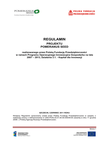 REGULAMIN PROJEKTU POMERANUS SEED realizowanego przez Polską Fundację Przedsiębiorczości w ramach Programu Operacyjnego Innowacyjna Gospodarka na lata 2007 – 2013, Działania 3.1. - Kapitał dla Innowacji SZCZECIN, CZERWIEC 2011 ROKU Niniejszy Regulamin opracowany został przez Polską Fundację Przedsiębiorczości w związku z realizacją umowy o dofinansowanie nr UDA-POIG.03.01.00-00-005/09-00 zawartej w dniu 17 grudnia 2009r. z Polską Agencją Rozwoju Przedsiębiorczości. Strona 1 §1. DEFINICJE Sformułowania użyte w niniejszym Regulaminie mają następujące znaczenie: 1. Projekt – projekt POMERANUS SEED, realizowany przez Polską Fundację Przedsiębiorczości, na podstawie umowy o dofinansowanie nr UDA-POIG.03.01.00-00005/09-00, zawartej w dniu 17 grudnia 2009r. z Polską Agencją Rozwoju Przedsiębiorczości. 2. PFP – Polska Fundacja Przedsiębiorczości z siedzibą w Szczecinie, przy ul. Monte Cassino 32, kod pocztowy 70-466, realizująca projekt POMERANUS SEED. 3. PARP – Polska Agencja Rozwoju Przedsiębiorczości - Instytucja Wdrażająca / Instytucja Pośrednicząca II stopnia. 4. Projektodawca – osoba fizyczna nie prowadząca działalności gospodarczej, osoba fizyczna prowadząca działalność gospodarczą, osoba prawna lub jednostka organizacyjna nie posiadająca osobowości prawnej, której ustawa przyznaje zdolność prawną, a także grupy tych osób, które złożyły Wniosek o wsparcie dla Innowacyjnego Projektu. 5. Innowacyjny Projekt – projekt zgłoszony przez Projektodawcę we Wniosku. 6. Wniosek – wniosek zgłoszenia Innowacyjnego Projektu wypełniony i podpisany na obowiązującym formularzu, dostępnym na Stronie Internetowej Projektu. 7. Strona Internetowa Projektu – www.pomeranusseed.pl 8. Umowa o Zachowaniu Poufności – umowa podpisywana pomiędzy Projektodawcą a PFP, określająca obowiązki stron dotyczące zachowania poufności informacji uzyskanych przez obie strony w toku realizacji Projektu. 9. Etap Preinkubacji – etap realizacji Projektu, obejmujący wielopłaszczyznowe doradztwo i analizę wyselekcjonowanych Innowacyjnych Projektów pod kątem oceny szans ich komercjalizacji i zasadności utworzenia przez PFP z Projektodawcą i ewentualnie z innymi inwestorami, spółki kapitałowej oraz przygotowanie materiałów i dokumentów, w tym biznes planu, niezbędnych do wprowadzenia Innowacyjnego Projektu na rynek. 10. Umowa o Preinkubację – umowa podpisywana pomiędzy Projektodawcą a PFP, po podjęciu przez Zarząd PFP decyzji o zakwalifikowaniu Innowacyjnego Projektu do Etapu Preinkubacji, określająca prawa i obowiązki stron podczas realizacji tego etapu. 11. Zespół Weryfikacyjny – zespół powołany przez Zarząd PFP, przygotowujący rekomendacje dotyczące zakwalifikowania, bądź nie, poszczególnych Innowacyjnych Projektów, do Etapu Preinkubacji. 12. Etap Inwestycyjny – etap realizacji Projektu, obejmujący działania podjęte w celu powołania z Projektodawcą i ewentualnie z innymi inwestorami spółki prawa handlowego i objęcia w niej akcji / udziałów przez PFP, kontrolę nad realizacją planu biznesowego przez spółkę oraz Wyjście z Inwestycji przez PFP. 13. Raport Oceniający Zasadność Inwestycji – raport przygotowany przez PFP na zakończenie Etapu Preinkubacji, stanowiący podstawę do podjęcia decyzji w sprawie wejścia kapitałowego PFP do spółki, tworzonej na bazie Innowacyjnego Projektu. 14. Umowa Inwestycyjna – umowa zawierana pomiędzy Projektodawcą a PFP i ewentualnie innymi inwestorami w ramach realizacji Etapu Inwestycyjnego, określająca Strona 2 warunki Wejścia Kapitałowego, relacje inwestorskie w nowotworzonej spółce i warunki Wyjścia z Inwestycji przez PFP. 15. Wejście Kapitałowe – dokonywanie inwestycji w spółkę powstałą w wyniku wyłonienia Innowacyjnego Projektu w ramach Etapu Preinkubacji, przez nabywanie lub obejmowanie udziałów lub akcji. 16. Wyjście z Inwestycji – dokonywanie dezinwestycji ze spółki utworzonej na bazie Innowacyjnego Projektu poprzez poszukiwanie najkorzystniejszej finansowo formy wycofania udziału kapitałowego PFP, obejmujący upublicznienie spółki, sprzedaż udziałów / akcji, umorzenie udziałów / akcji lub likwidację spółki. 17. Zespół Inwestycyjny – zespół powołany przez Zarząd PFP, do zadań którego należy przygotowanie rekomendacji odnośnie Wejścia Kapitałowego do spółki tworzonej na bazie Innowacyjnego Projektu, wspólnie z Projektodawcą i ewentualnie innymi inwestorami. 18. Mikro, małe lub średnie przedsiębiorstwo – przedsiębiorstwo spełniające wymogi określone w definicji zawartej w Załączniku I do Rozporządzenia Komisji Europejskiej (WE) nr 800/2008 z dnia 6 sierpnia 2008r., uznającej niektóre rodzaje pomocy za zgodne ze wspólnym rynkiem w zastosowaniu art. 87 i 88 Traktatu – ogólne rozporządzenie w sprawie wyłączeń blokowych. §2. POSTANOWIENIA OGÓLNE 1. Regulamin określa zasady udzielania przez Polską Fundację Przedsiębiorczości wsparcia w postaci sfinansowania Etapu Preinkubacji oraz Etapu Inwestycyjnego, w ramach realizacji projektu pod nazwą POMERANUS SEED, współfinansowanego ze środków Programu Operacyjnego Innowacyjna Gospodarka na lata 2007 – 2013, Działanie 3.1. Kapitał dla Innowacji. 2. Wsparcie w postaci Wejścia Kapitałowego udzielane w ramach realizacji Projektu skierowane zostać może wyłącznie do mikro-, małych i średnich przedsiębiorstw. 3. Projekt realizowany jest na obszarze województw: Zachodniopomorskiego, Pomorskiego, Kujawsko-Pomorskiego, Wielkopolskiego, Lubuskiego, Dolnośląskiego, co oznacza, że siedziba spółki, utworzonej w ramach realizacji Projektu znajdować się będzie na obszarze w/w województw. 4. Innowacyjne Projekty przekazywane PFP winny być wolne od wad prawnych i roszczeń osób trzecich. W zakresie objętym Innowacyjnym Projektem, Projektodawca nie może naruszać praw autorskich (w tym praw zależnych), 