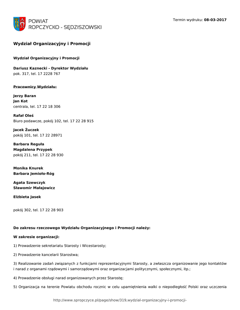 Termin wydruku: 08-03-2017 Wydział Organizacyjny i Promocji Wydział Organizacyjny i Promocji Dariusz Kaznecki - Dyrektor Wydziału pok. 317, tel. 17 2228 767 Pracownicy Wydziału: Jerzy Baran Jan Kot centrala, tel. 17 22 18 306 Rafał Oleś Biuro podawcze, pokój 102, tel. 17 22 28 915 Jacek Żuczek pokój 101, tel. 17 22 28971 Barbara Reguła Magdalena Przypek pokój 211, tel. 17 22 28 930 Monika Knurek Barbara Jemioło-Róg Agata Szewczyk Sławomir Małajowicz Elżbieta Jasek pokój 302, tel. 17 22 28 903 Do zakresu rzeczowego Wydziału Organizacyjnego i Promocji należy: W zakresie organizacji: 1) Prowadzenie sekretariatu Starosty i Wicestarosty; 2) Prowadzenie kancelarii Starostwa; 3) Realizowanie zadań związanych z funkcjami reprezentacyjnymi Starosty, a zwłaszcza organizowanie jego kontaktów i narad z organami rządowymi i samorządowymi oraz organizacjami politycznymi, społecznymi, itp.; 4) Prowadzenie obsługi narad organizowanych przez Starostę; 5) Organizacja na terenie Powiatu obchodu rocznic w celu upamiętnienia walki o niepodległość Polski oraz uczczenia http://www.spropczyce.pl/page/show/319,wydzial-organizacyjny-i-promocji- pamięci ofiar wojny i okresu wojennego; 6) Współpraca z organizacjami pozarządowymi działającymi na terenie Powiatu Ropczycko-Sędziszowskiego; 7) Prowadzenie spraw wynikających ze sprawowania nadzoru nad działalnością fundacji; 8) Wykonywanie zadań z zakresu sprawowania nadzoru nad działalnością stowarzyszeń oraz wykonywanie czynności urzędowych niezbędnych do podjęcia działalności przez stowarzyszenie zwykłe. 9) Prowadzenie zbioru dokumentów związanych z przynależnością Powiatu do związków; 10) Prowadzenie biblioteki Starostwa; 11) Prenumerata i rozdzielnictwo wydawnictw urzędowych i prasy; 12) Administrowanie strukturą podmiotowej strony Biuletynu Informacji Publicznej Starostwa; 13) Prowadzenie archiwum Starostwa. 14) Redagowanie strony www.spropczyce.pl W zakresie promocji: 1) Promowanie potencjału społecznego, gospodarczego, kulturalnego i turystycznego Powiatu poprzez inicjowanie konferencji, seminariów, szkoleń, spotkań i innych form prezentacji historii, kultury i dorobku materialnego; 2) Bieżąca współpraca z mediami i monitoring publikacji prasowych dotyczących powiatu, organizowanie obsługi medialnej ważnych przedsięwzięć powiatowych o charakterze gospodarczym, kulturalnym, sportowym; 3) Organizowanie konferencji prasowych i spotkań środowiskowych z władzami Powiatu; 4) Współpraca z telewizją miejską; 5) Archiwizacja publikacji na temat Powiatu; 6) Analizowanie wszelkich publikacji, w tym prasowych, radiowych, telewizyjnych i internetowych ጀ związanych ze sferą promocji oraz archiwizowanie tych publikacji; 7) Opracowywanie i rozpowszechnianie w gminach Powiatu różnorodnych materiałów informacyjnych i publikacji, w tym o Unii Europejskiej; 8) Organizowanie konferencji, seminariów, szkoleń, spotkań dla różnorodnych grup społecznych o tematyce dotyczącej Unii Europejskiej o promocji Powiatu w krajach Unii Europejskiej; 9) Przygotowywanie udziału Powiatu w targach i innych przedsięwzięciach o charakterze promocyjnym; 10) Opracowywanie koncepcji turystycznego i rekreacyjnego zagospodarowania Powiatu oraz wykreowanie produktu turystycznego; 11) Inicjowanie, organizowanie i koordynowanie procesów adaptacyjnych i integracyjnych Powiatu ze strukturami Unii Europejskiej; 12) Współdziałanie w Wydziałem Edukacji i Sportu w zakresie włączenia elementów promocyjnych Powiatu do imprez artystycznych, kulturalnych i sportowych przygotowywanych przez wydział. http://www.spropczyce.pl/page/show/319,wydzial-organizacyjny-i-promocji- 13) Współpraca w samorządem województwa i samorządami gminnymi w Powiecie oraz z organizacjami pozarządowymi w zakresie dotyczącym promocji Powiatu; 14) Podejmowanie i prowadzenie działań w zakresie wspierania rozwoju małej przedsiębiorczości na obszarze Powiatu, współpraca z Powiatowym Urzędem Pracy i lokalnymi stowarzyszeniami gospodarczymi w działaniach z zakresu partnerstwa lokalnego, współorganizowanie warsztatów lokalnego ożywienia gospodarczego; W zakresie spraw organizacyjno-gospodarczych: 1) Administrowanie budynkami Starostwa; 2) Załatwianie całokształtu spraw związanych z pieczęciami urzędowymi, nagłówkowymi i tablicami; 3) Nadzór nad utrzymaniem czystości i porządku w pomieszczeniach biurowych i sanitarnych w budynku Starostwa; 4) Zaopatrzenie w meble i sprzęt biurowy; 5) Prowadzenie spraw związanych z zaopatrzeniem materiałowo-technicznym oraz konserwacją wyposażenia Starostwa; 6) Prowadzenie i koordynacja spraw z zakresu ubezpieczeń mienia i nieruchomości Starostwa i powiatowych jednostek organizacyjnych; 7) Prowadzenie i koordynacja spraw z zakresu dostaw energii dla starostwa i powiatowych jednostek organizacyjnych. publikacja: 20-08-2015 , aktualizacja: 06-10-2016, autor: Wydział WOiP Monika Świder http://www.spropczyce.pl/page/show/319,wydzial-organizacyjny-i-promocji-