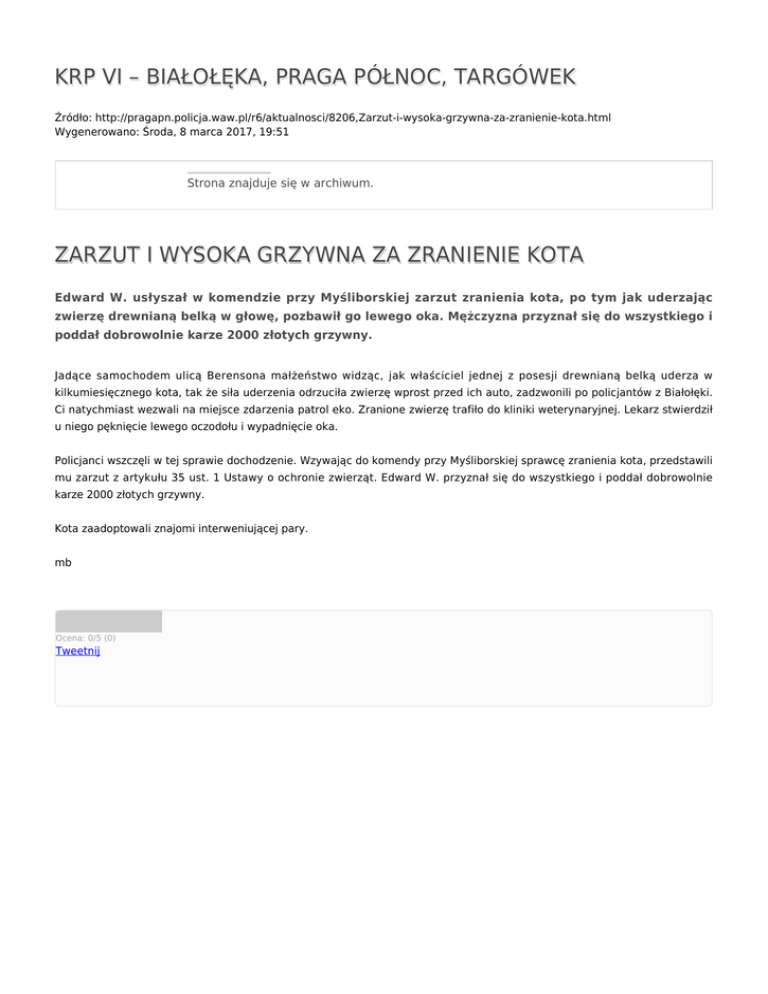 KRP VI – BIAŁOŁĘKA, PRAGA PÓŁNOC, TARGÓWEK Źródło: http://pragapn.policja.waw.pl/r6/aktualnosci/8206,Zarzut-i-wysoka-grzywna-za-zranienie-kota.html Wygenerowano: Środa, 8 marca 2017, 19:51 Strona znajduje się w archiwum. ZARZUT I WYSOKA GRZYWNA ZA ZRANIENIE KOTA Edward W. usłyszał w komendzie przy Myśliborskiej zarzut zranienia kota, po tym jak uderzając zwierzę drewnianą belką w głowę, pozbawił go lewego oka. Mężczyzna przyznał się do wszystkiego i poddał dobrowolnie karze 2000 złotych grzywny. Jadące samochodem ulicą Berensona małżeństwo widząc, jak właściciel jednej z posesji drewnianą belką uderza w kilkumiesięcznego kota, tak że siła uderzenia odrzuciła zwierzę wprost przed ich auto, zadzwonili po policjantów z Białołęki. Ci natychmiast wezwali na miejsce zdarzenia patrol eko. Zranione zwierzę trafiło do kliniki weterynaryjnej. Lekarz stwierdził u niego pęknięcie lewego oczodołu i wypadnięcie oka. Policjanci wszczęli w tej sprawie dochodzenie. Wzywając do komendy przy Myśliborskiej sprawcę zranienia kota, przedstawili mu zarzut z artykułu 35 ust. 1 Ustawy o ochronie zwierząt. Edward W. przyznał się do wszystkiego i poddał dobrowolnie karze 2000 złotych grzywny. Kota zaadoptowali znajomi interweniującej pary. mb Ocena: 0/5 (0) Tweetnij