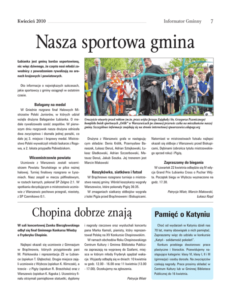 Kwiecień 2010 Informator Gminny 7 Nasza sportowa gmina Łubianka jest gminą bardzo usportowioną, nic więc dziwnego, że często nasi młodzi zawodnicy z powodzeniem rywalizują na arenach krajowych i powiatowych. Oto informacje o największych sukcesach, jakie sportowcy z gminy osiągnęli w ostatnim czasie. Bałagany na medal W Gnieźnie rozgrano finał Halowych Mistrzostw Polski Juniorów, w których udział wzięła drużyna Bałaganów Łubianka. O medale rywalizowało sześć zespołów. W pierwszym dniu rozgrywek nasza drużyna odniosła dwa zwycięstwa i doznała jednej porażki, co dało jej 3. miejsce i brązowy medal. Mistrzostwo Polski wywalczyli młodzi laskarze z Rogowa, a 2. lokata przypadła Pobiedziskom. Wicemistrzowie powiatu Uczniowie z Warszewic zostałi wicemistrzem Powiatu Toruńskiego w piłce nożnej halowej. Turniej finałowy rozegrano w Łysomiach. Nasz zespół w meczu półfinałowym, w rzutach karnych, pokonał SP Zelgno 2:1. W spotkaniu decydującym o mistrzostwie uczniowie z Warszewic pechowo przegrali, niestety, z SP Czernikowo 0:1. Uroczyście otwarty przed rokiem (m.in. przez wójta Jerzego Zająkałę i ks. Grzegorza Pszenicznego) kompleks boisk sportowych „Orlik” w Warszewicach po zimowej przerwie czeka na mieszkańców naszej gminy. Szczegółowe informacje znajdują się na stronie internetowej spwarszewice.edupage.org Drużyna z Warszewic grała w następującym składzie: Denis Królik, Przemysław Banaszek, Łukasz Deruś, Adrian Sztejkowski, Łukasz Gładkowski, Adrian Szczerbowski, Mateusz Deruś, Jakub Soszka. Jej trenerem jest Marcin Makowski Koszykówka, siatkówa i futsal W Brąchnowe rozegrano turnieje o mistrzostwo naszej gminy. Wśród koszykarzy wygrały Warszewice, które pokonały Pigżę 36:35. W zmaganiach siatkarzy oldbojów wygrała z kolei Pigża przed Brąchnowem i Biskupicami. Chopina dobrze znają W sali koncertowej Zamku Bierzgłowskiego odbył się finał Gminnego Konkursu Wiedzy o Fryderyku Chopinie. Najlepsi okazali się uczniowie z Gimnazjum w Brąchnowie, których przygotowała pani M. Piórkowska i reprezentacja ZS w Łubiance (opiekun T. Głębocka). Drugie miejsce zajęli uczniowie z Wybcza (opiekun K. Klimczak), a trzecie - z Pigży (opiekun R. Brzezińska) oraz z Warszewic (opiekun K. Kępska ). Uczestnicy finału otrzymali pamiątkowe statuetki, dyplomy i nagrody rzeczowe oraz wysłuchali koncertu pana Marka Kamoli, pianisty, który reprezentował Polskę na XV Konkursie Chopinowskim. W ramach obchodów Roku Chopinowskiego Centrum Kultury i Gminna Biblioteka Publiczna zapraszają na wyprawę do Szafarni, miejsca w którym młody Fryderyk spędzał wakacje. Wyjazdy odbędą się w dniach: 10 kwietnia w godz. 12.00 - 16.00 oraz 11 kwietnia (13.00 - 17.00). Oczekujemy na zgłoszenia. Patrycja Wiatr Natomiast w mistrzostwach futsalu najlepsi okazali się oldboje z Warszewic przed Biskupicami, Dębinami (obrońca tytułu mistrzowskiego sprzed roku) i Pigżą. Zapraszamy do biegania W czwartek 22 kwietnia odbędzie się IV edycja Grand Prix Łubianka Cross o Puchar Wójta. Początek biegu w Wybczu wyznaczono na godz. 17.30. Patrycja Wiatr, Marcin Makowski, Łukasz Rząd Pamięć o Katyniu Choć od wydarzeń w Katyniu dzieli nas 70 lat, mamy obowiązek o nich pamiętać. Zapraszamy więc do udziału w konkursie „Katyń - solidarność pokoleń”. Konkurs przebiega dwutorowo: prace plastyczne i literackie. Przewidujemy następujące kategorie: klasy VI, klasy I, II i III (gimnazja) i osoby dorosłe. Na zwycięzców czekają nagrody. Prace prosimy składać w Centrum Kultury lub w Gminnej Bibliotece Publicznej do 16 kwietnia.