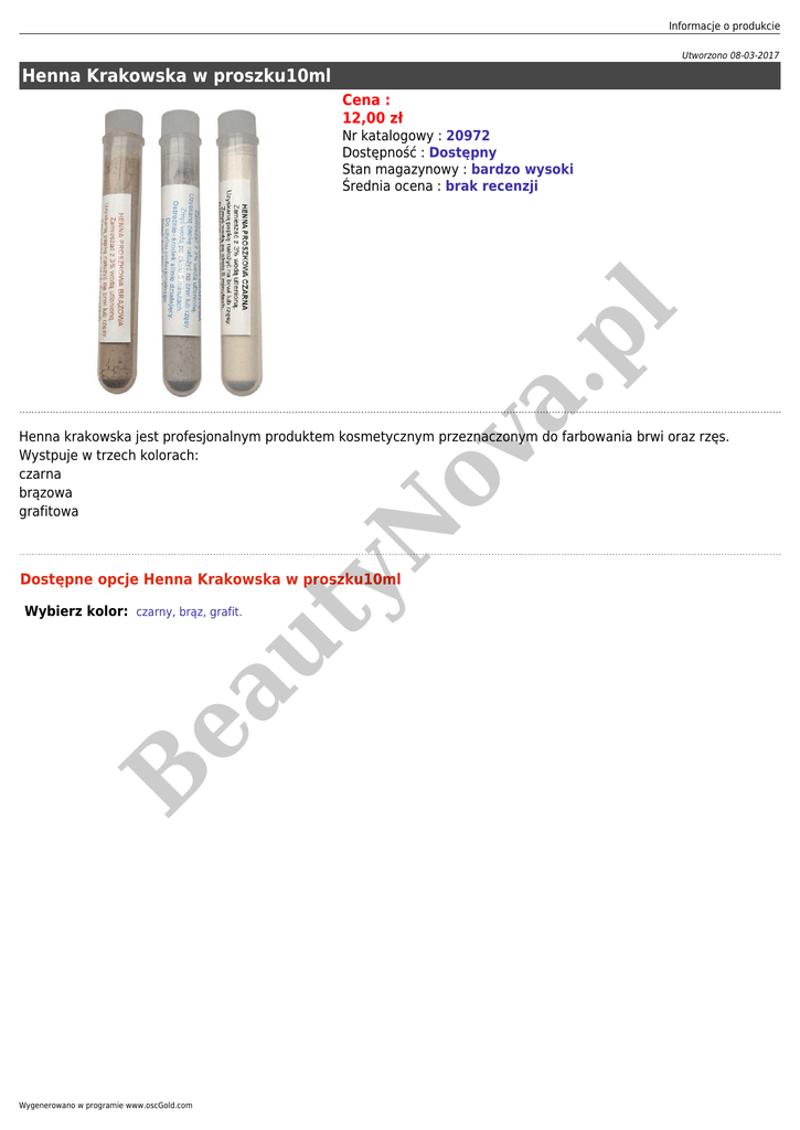 Informacje o produkcie Utworzono 08-03-2017 Henna Krakowska w proszku10ml Cena : 12,00 zł a. pl Nr katalogowy : 20972 Dostępność : Dostępny Stan magazynowy : bardzo wysoki Średnia ocena : brak recenzji yN ov Henna krakowska jest profesjonalnym produktem kosmetycznym przeznaczonym do farbowania brwi oraz rzęs. Wystpuje w trzech kolorach: czarna brązowa grafitowa Dostępne opcje Henna Krakowska w proszku10ml B ea ut Wybierz kolor: czarny, brąz, grafit. Wygenerowano w programie www.oscGold.com