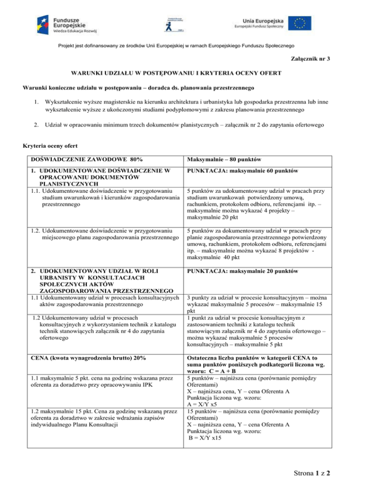 Projekt jest dofinansowany ze środków Unii Europejskiej w ramach Europejskiego Funduszu Społecznego Załącznik nr 3 WARUNKI UDZIAŁU W POSTĘPOWANIU I KRYTERIA OCENY OFERT Warunki konieczne udziału w postępowaniu – doradca ds. planowania przestrzennego 1. Wykształcenie wyższe magisterskie na kierunku architektura i urbanistyka lub gospodarka przestrzenna lub inne wykształcenie wyższe z ukończonymi studiami podyplomowymi z zakresu planowania przestrzennego 2. Udział w opracowaniu minimum trzech dokumentów planistycznych – załącznik nr 2 do zapytania ofertowego Kryteria oceny ofert DOŚWIADCZENIE ZAWODOWE 80% Maksymalnie – 80 punktów 1. UDOKUMENTOWANE DOŚWIADCZENIE W OPRACOWANIU DOKUMENTÓW PLANISTYCZNYCH 1.1. Udokumentowane doświadczenie w przygotowaniu studium uwarunkowań i kierunków zagospodarowania przestrzennego PUNKTACJA: maksymalnie 60 punktów 1.2. Udokumentowane doświadczenie w przygotowaniu miejscowego planu zagospodarowania przestrzennego 5 punktów za dokumentowany udział w pracach przy planie zagospodarowania przestrzennego potwierdzony umową, rachunkiem, protokołem odbioru, referencjami itp. – maksymalnie można wykazać 8 projektów maksymalnie 40 pkt 2. UDOKUMENTOWANY UDZIAŁ W ROLI URBANISTY W KONSULTACJACH SPOŁECZNYCH AKTÓW ZAGOSPODAROWANIA PRZESTRZENNEGO 1.1 Udokumentowany udział w procesach konsultacyjnych aktów zagospodarowania przestrzennego PUNKTACJA: maksymalnie 20 punktów 1.2 Udokumentowany udział w procesach konsultacyjnych z wykorzystaniem technik z katalogu technik stanowiących załącznik nr 4 do zapytania ofertowego CENA (kwota wynagrodzenia brutto) 20% 1.1 maksymalnie 5 pkt. cena na godzinę wskazana przez oferenta za doradztwo przy opracowywaniu IPK 1.2 maksymalnie 15 pkt. Cena za godzinę wskazaną przez oferenta za doradztwo w zakresie wdrażania zapisów indywidualnego Planu Konsultacji 5 punktów za udokumentowany udział w pracach przy studium uwarunkowań potwierdzony umową, rachunkiem, protokołem odbioru, referencjami itp. – maksymalnie można wykazać 4 projekty – maksymalnie 20 pkt 3 punkty za udział w procesie konsultacyjnym – można wykazać maksymalnie 5 procesów – maksymalnie 15 pkt 1 punkt za udział w procesie konsultacyjnym z zastosowaniem techniki z katalogu technik stanowiącym załącznik nr 4 do zapytania ofertowego – można wykazać maksymalnie 5 procesów konsultacyjnych – maksymalnie 5 pkt Ostateczna liczba punktów w kategorii CENA to suma punktów poniższych podkategorii liczona wg. wzoru: C = A + B 5 punktów – najniższa cena (porównanie pomiędzy Oferentami) X – najniższa cena, Y – cena Oferenta A Punktacja liczona wg. wzoru: A = X/Y x5 15 punktów – najniższa cena (porównanie pomiędzy Oferentami) X – najniższa cena, Y – cena Oferenta A Punktacja liczona wg. wzoru: B = X/Y x15 Strona 1 z 2 Projekt jest dofinansowany ze środków Unii Europejskiej w ramach Europejskiego Funduszu Społecznego Ostateczna punktacja zostanie przyznana wg. wzoru: K= X + C Gdzie: K – uzyskana całkowita liczba punktów X – liczba punktów uzyskana w kategorii doświadczenie zawodowe C - liczba punktów uzyskana w kategorii cena Strona 2 z 2