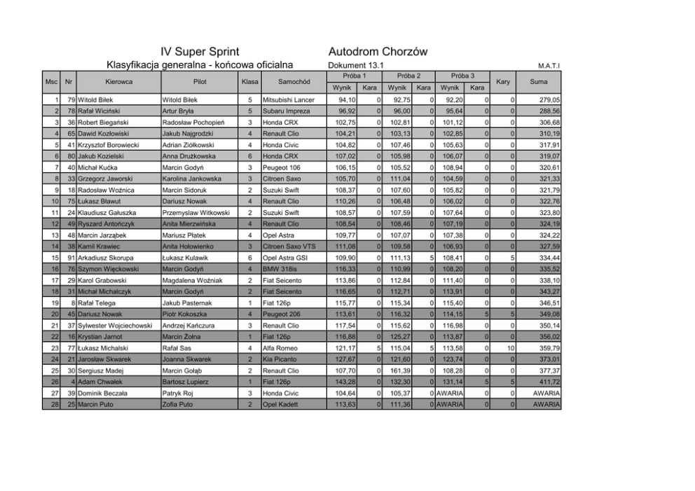 IV Super Sprint Autodrom Chorzów Klasyfikacja generalna - końcowa oficialna Msc Nr Kierowca Pilot Klasa 5 Samochód Mitsubishi Lancer Dokument 13.1 Próba 1 Wynik 94,10 M.A.T.I Próba 2 Kara Wynik 0 92,75 Próba 3 Kara 0 Wynik 92,20 Kary Kara 0 Suma 1 79 Witold Biłek Witold Biłek 0 279,05 2 78 Rafał Wiciński Artur Bryła 5 Subaru Impreza 96,92 0 96,00 0 95,64 0 0 288,56 3 36 Robert Biegański Radosław Pochopień 3 Honda CRX 102,75 0 102,81 0 101,12 0 0 306,68 4 65 Dawid Kozłowiski Jakub Najgrodzki 4 Renault Clio 104,21 0 103,13 0 102,85 0 0 310,19 5 41 Krzysztof Borowiecki Adrian Ziółkowski 4 Honda Civic 104,82 0 107,46 0 105,63 0 0 317,91 6 80 Jakub Kozielski Anna Drużkowska 6 Honda CRX 107,02 0 105,98 0 106,07 0 0 319,07 7 40 Michał Kućka Marcin Godyń 3 Peugeot 106 106,15 0 105,52 0 108,94 0 0 320,61 8 33 Grzegorz Jaworski Karolina Jankowska 3 Citroen Saxo 105,70 0 111,04 0 104,59 0 0 321,33 18 Radosław Woźnica Marcin Sidoruk 2 Suzuki Swift 108,37 0 107,60 0 105,82 0 0 321,79 10 9 75 Łukasz Bławut Dariusz Nowak 4 Renault Clio 110,26 0 106,48 0 106,02 0 0 322,76 11 24 Klaudiusz Gałuszka Przemyslaw Witkowski 2 Suzuki Swift 108,57 0 107,59 0 107,64 0 0 323,80 12 49 Ryszard Antończyk Anita Mierzwińska 4 Renault Clio 108,54 0 108,46 0 107,19 0 0 324,19 13 48 Marcin Jarząbek Mariusz Płatek 4 Opel Astra 109,77 0 107,07 0 107,38 0 0 324,22 14 38 Kamil Krawiec Anita Hołowienko 3 Citroen Saxo VTS 111,08 0 109,58 0 106,93 0 0 327,59 15 91 Arkadiusz Skorupa Łukasz Kulawik 6 Opel Astra GSI 109,90 0 111,13 5 108,41 0 5 334,44 16 76 Szymon Więckowski Marcin Godyń 4 BMW 318is 116,33 0 110,99 0 108,20 0 0 335,52 17 29 Karol Grabowski Magdalena Woźniak 2 Fiat Seicento 113,86 0 112,84 0 111,40 0 0 338,10 18 31 Michał Michalczyk Marcin Godyń 2 Fiat Seicento 116,65 0 112,71 0 113,91 0 0 343,27 Jakub Pasternak 1 Fiat 126p 115,77 0 115,34 0 115,40 0 0 346,51 Piotr Kokoszka 4 Peugeot 206 113,61 0 116,32 0 114,15 5 5 349,08 19 8 Rafał Telega 20 45 Dariusz Nowak 21 37 Sylwester Wojciechowski Andrzej Kańczura 3 Renault Clio 117,54 0 115,62 0 116,98 0 0 350,14 22 16 Krystian Jarnot Marcin Żołna 1 Fiat 126p 116,88 0 125,27 0 113,87 0 0 356,02 23 77 Łukasz Michalski Rafał Sas 4 Alfa Romeo 121,17 5 115,04 5 113,58 0 10 359,79 24 21 Jarosław Skwarek Joanna Skwarek 2 Kia Picanto 127,67 0 121,60 0 123,74 0 0 373,01 25 30 Sergiusz Madej 26 4 Adam Chwałek Marcin Gołąb 2 Renault Clio 107,70 0 161,39 0 108,28 0 0 377,37 Bartosz Lupierz 1 Fiat 126p 143,28 0 132,30 0 131,14 5 5 411,72 27 39 Dominik Beczała Patryk Roj 3 Honda Civic 104,64 0 105,37 0 AWARIA 0 0 AWARIA 28 25 Marcin Puto Zofia Puto 2 Opel Kadett 113,63 0 111,36 0 AWARIA 0 0 AWARIA