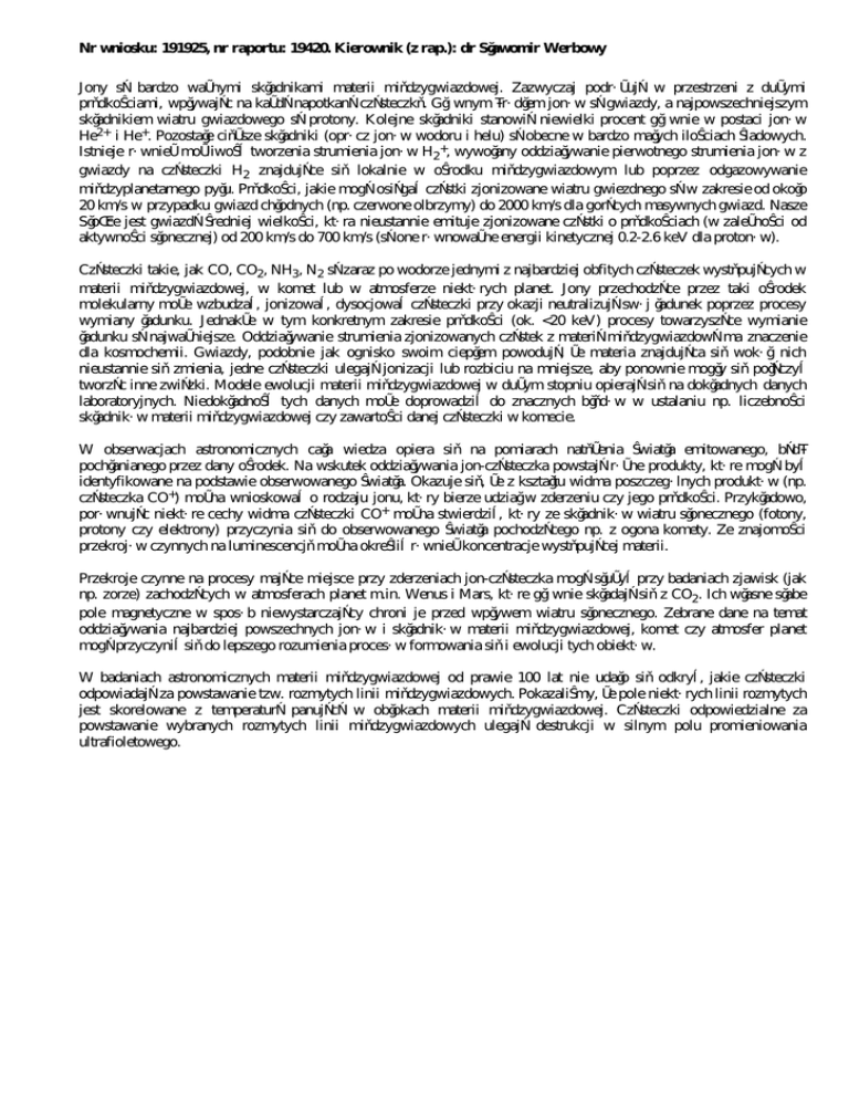 Nr wniosku: 191925, nr raportu: 19420. Kierownik (z rap.): dr