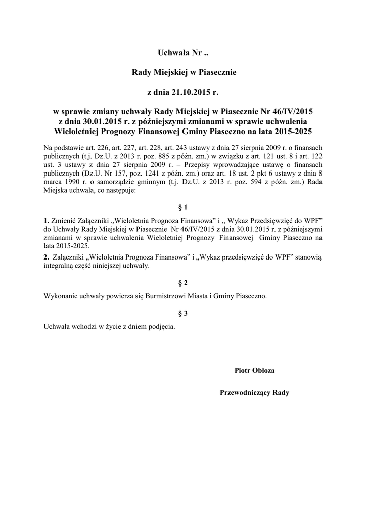 Uchwała Nr .. Rady Miejskiej w Piasecznie z dnia 21.10.2015 r. w sprawie zmiany uchwały Rady Miejskiej w Piasecznie Nr 46/IV/2015 z dnia 30.01.2015 r. z późniejszymi zmianami w sprawie uchwalenia Wieloletniej Prognozy Finansowej Gminy Piaseczno na lata 2015-2025 Na podstawie art. 226, art. 227, art. 228, art. 243 ustawy z dnia 27 sierpnia 2009 r. o finansach publicznych (t.j. Dz.U. z 2013 r. poz. 885 z późn. zm.) w związku z art. 121 ust. 8 i art. 122 ust. 3 ustawy z dnia 27 sierpnia 2009 r. – Przepisy wprowadzające ustawę o finansach publicznych (Dz.U. Nr 157, poz. 1241 z późn. zm.) oraz art. 18 ust. 2 pkt 6 ustawy z dnia 8 marca 1990 r. o samorządzie gminnym (t.j. Dz.U. z 2013 r. poz. 594 z późn. zm.) Rada Miejska uchwala, co następuje: §1 1. Zmienić Załączniki „Wieloletnia Prognoza Finansowa” i „ Wykaz Przedsięwzięć do WPF” do Uchwały Rady Miejskiej w Piasecznie .Nr 46/IV/2015 z dnia 30.01.2015 r. z późniejszymi zmianami w sprawie uchwalenia Wieloletniej Prognozy. Finansowej Gminy Piaseczno na lata 2015-2025. 2. .Załączniki „Wieloletnia Prognoza Finansowa” i „Wykaz przedsięwzięć do WPF” stanowią integralną część niniejszej uchwały. §2 Wykonanie uchwały powierza się Burmistrzowi Miasta i Gminy Piaseczno. §3 Uchwała wchodzi w życie z dniem podjęcia. Piotr Obłoza Przewodniczący Rady Objaśnienia przyjętych wartości W Uchwale Rady Miejskiej w Piasecznie Nr 46/IV/2015 z dnia 30.01.2015 r. z późniejszymi zmianami w sprawie uchwalenia Wieloletniej Prognozy Finansowej Gminy Piaseczno na lata 2015-2025 zmienia się Załączniki „Wieloletnia Prognoza Finansowa” i „Wykaz przedsięwzięć do WPF”. W załączniku „Wieloletnia Prognoza Finansowa” zmienia się: Zwiększa się dochody bieżące na rok 2015 o kwotę 2 719 555 zł Zwiększa się dochody z Dotacji celowych otrzymanych z budżetu państwa na realizację zadań bieżących z zakresu administracji rządowej oraz innych zadań zleconych gminie ustawami o kwotę 64 378 zł Zwiększa się dochody z Dotacji celowych przekazanych do budżetu państwa na realizację zadań bieżących gmin z zakresu edukacyjnej opieki wychowawczej finansowanych w całości przez budżet państwa w ramach programów rządowych o kwotę 70 992 zł Zwiększa się dochody z Dotacji celowych otrzymanych z budżetu państwa na realizację zadań bieżących z zakresu administracji rządowej oraz innych zadań zleconych gminie ustawami o kwotę 2 469 513 zł Zwiększa się dochody z Dotacji celowych otrzymanych z budżetu państwa na realizację zadań bieżących z zakresu administracji rządowej oraz innych zadań zleconych gminie ustawami o kwotę 18 348 zł Zwiększa się dochody z Dotacji celowych otrzymanych z budżetu państwa na realizację własnych zadań bieżących gmin o kwotę 117 934 zł Zwiększa się dochody z Gospodarki Komunalnej i ochrony środowiska o kwotę 23 390 zł Zmniejsza się dochody z Gospodarki Komunalnej i ochrony środowiska o kwotę 45 000 zł Zmniejsza się dochody majątkowe na rok 2015 o kwotę 55 204 zł Zwiększa się dochody z Dotacji celowych otrzymanych z budżetu państwa na realizację inwestycji i zakupów inwestycyjnych własnych gmin o kwotę 14 788 zł Zmniejsza się dochody z Gospodarki mieszkaniowej o kwotę 69 992 zł Zwiększa się wydatki bieżące na rok 2015 o kwotę 2 559 763 zł Zwiększa się wydatki przeznaczone na Urzędy naczelnych organów władzy państwowej, kontroli i ochrony prawa oraz sądownictwa o kwotę 64 378 zł Zwiększa się wydatki przeznaczone na Edukacyjną opiekę wychowawczą o kwotę 70 992 zł Zwiększa się wydatki przeznaczone na Gospodarkę mieszkaniową o kwotę 16 000 zł Zmniejsza się wydatki przeznaczone na Gospodarkę mieszkaniową o kwotę 16 000 zł Zwiększa się wydatki przeznaczone na Oświatę i wychowanie o kwotę 69 157 zł Zmniejsza się wydatki przeznaczone na Oświatę i wychowanie o kwotę 69 157 zł Zwiększa się wydatki przeznaczone na Gospodarkę komunalną i ochronę środowiska o kwotę 35 000 zł Zmniejsza się wydatki przeznaczone na Gospodarkę komunalną i ochronę środowiska o kwotę 35 000 zł Zwiększa się wydatki przeznaczone na Pomoc społeczną o kwotę 2 487 861 zł Zwiększa się wydatki przeznaczone na Gospodarkę mieszkaniową o kwotę 16 100 zł Zmniejsza się wydatki przeznaczone na Gospodarkę mieszkaniową o kwotę 16 100 zł Zwiększa się wydatki przeznaczone na Gospodarkę komunalną i ochronę środowiska o kwotę 5 000 zł Zmniejsza się wydatki przeznaczone na Gospodarkę komunalną i ochronę środowiska o kwotę 5 000 zł Zwiększa się wydatki przeznaczone na Ochronę zdrowia o kwotę 82 000 zł Zmniejsza się wydatki przeznaczone na Ochronę zdrowia o kwotę 82 000 zł Zwiększa się wydatki przeznaczone na Oświatę i wychowanie o kwotę 36 933 zł Zmniejsza się wydatki przeznaczone na Administrację publiczną o kwotę 740 zł Zmniejsza się wydatki przeznaczone na Oświatę i wychowanie o kwotę 36 933 zł Zmniejsza się wydatki przeznaczone na Oświatę i wychowanie o kwotę 37 200 zł Zmniejsza się wydatki przeznaczone na Gospodarkę mieszkaniową o kwotę 20 000 zł Zmniejsza się wydatki przeznaczone na Oświatę i wychowanie o kwotę 16 000 zł Zmniejsza się wydatki przeznaczone na Ochronę zdrowia o kwotę 3 500 zł Zwiększa się wydatki przeznaczone na Kulturę i ochronę dziedzictwa narodowego o kwotę 110 000 zł Zmniejsza się wydatki przeznaczone na Administrację publiczną o kwotę 23 880 zł Zwiększa się wydatki przeznaczone na Gospodarkę komunalną i ochronę środowiska o kwotę 42 900 zł Zmniejsza się wydatki przeznaczone na Gospodarkę komunalną i ochronę środowiska o kwotę 32 900 zł Zwiększa się wydatki przeznaczone na Transport i łączność o kwotę 116 200 zł Zwiększa się wydatki przeznaczone na Gospodarkę komunalną i ochronę środowiska o kwotę 3 000 zł Zmniejsza się wydatki przeznaczone na Transport i ł