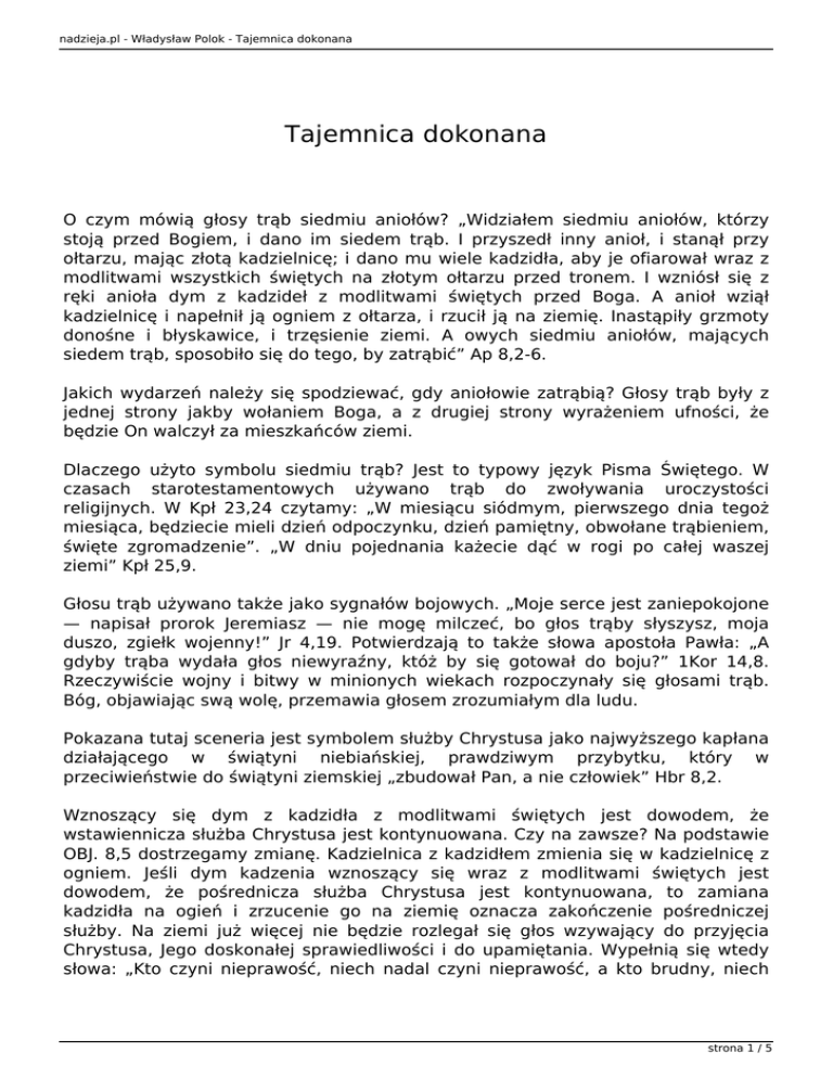 nadzieja.pl - Władysław Polok - Tajemnica dokonana Tajemnica dokonana O czym mówią głosy trąb siedmiu aniołów? „Widziałem siedmiu aniołów, którzy stoją przed Bogiem, i dano im siedem trąb. I przyszedł inny anioł, i stanął przy ołtarzu, mając złotą kadzielnicę; i dano mu wiele kadzidła, aby je ofiarował wraz z modlitwami wszystkich świętych na złotym ołtarzu przed tronem. I wzniósł się z ręki anioła dym z kadzideł z modlitwami świętych przed Boga. A anioł wziął kadzielnicę i napełnił ją ogniem z ołtarza, i rzucił ją na ziemię. Inastąpiły grzmoty donośne i błyskawice, i trzęsienie ziemi. A owych siedmiu aniołów, mających siedem trąb, sposobiło się do tego, by zatrąbić” Ap 8,2-6. Jakich wydarzeń należy się spodziewać, gdy aniołowie zatrąbią? Głosy trąb były z jednej strony jakby wołaniem Boga, a z drugiej strony wyrażeniem ufności, że będzie On walczył za mieszkańców ziemi. Dlaczego użyto symbolu siedmiu trąb? Jest to typowy język Pisma Świętego. W czasach starotestamentowych używano trąb do zwoływania uroczystości religijnych. W Kpł 23,24 czytamy: „W miesiącu siódmym, pierwszego dnia tegoż miesiąca, będziecie mieli dzień odpoczynku, dzień pamiętny, obwołane trąbieniem, święte zgromadzenie”. „W dniu pojednania każecie dąć w rogi po całej waszej ziemi” Kpł 25,9. Głosu trąb używano także jako sygnałów bojowych. „Moje serce jest zaniepokojone — napisał prorok Jeremiasz — nie mogę milczeć, bo głos trąby słyszysz, moja duszo, zgiełk wojenny!” Jr 4,19. Potwierdzają to także słowa apostoła Pawła: „A gdyby trąba wydała głos niewyraźny, któż by się gotował do boju?” 1Kor 14,8. Rzeczywiście wojny i bitwy w minionych wiekach rozpoczynały się głosami trąb. Bóg, objawiając swą wolę, przemawia głosem zrozumiałym dla ludu. Pokazana tutaj sceneria jest symbolem służby Chrystusa jako najwyższego kapłana działającego w świątyni niebiańskiej, prawdziwym przybytku, który w przeciwieństwie do świątyni ziemskiej „zbudował Pan, a nie człowiek” Hbr 8,2. Wznoszący się dym z kadzidła z modlitwami świętych jest dowodem, że wstawiennicza służba Chrystusa jest kontynuowana. Czy na zawsze? Na podstawie OBJ. 8,5 dostrzegamy zmianę. Kadzielnica z kadzidłem zmienia się w kadzielnicę z ogniem. Jeśli dym kadzenia wznoszący się wraz z modlitwami świętych jest dowodem, że pośrednicza służba Chrystusa jest kontynuowana, to zamiana kadzidła na ogień i zrzucenie go na ziemię oznacza zakończenie pośredniczej służby. Na ziemi już więcej nie będzie rozlegał się głos wzywający do przyjęcia Chrystusa, Jego doskonałej sprawiedliwości i do upamiętania. Wypełnią się wtedy słowa: „Kto czyni nieprawość, niech nadal czyni nieprawość, a kto brudny, niech strona 1 / 5 nadzieja.pl - Władysław Polok - Tajemnica dokonana nadal się brudzi, lecz kto sprawiedliwy, niech nadal czyni sprawiedliwość, a kto święty, niech nadal się uświęca. Oto przyjdę wkrótce, a zapłata moja jest ze mną, by oddać każdemu według jego uczynku” Ap 22,11-12. Kiedy się to stanie? Wydarzenia zapowiedziane przez głosy trąb mają dać odpowiedź. W Ap 10,7 czytamy: „W dniach, kiedy siódmy anioł się odezwie i zacznie trąbić, dokona się tajemnica Boża, jak to zwiastował sługom swoim, prorokom”. Kiedy siódmy anioł zacznie trąbić? Co jest Bożą tajemnicą, która wtedy będzie dokonana? „Zatrąbił siódmy anioł; i odezwały się w niebie potężne głosy mówiące: Panowanie nad światem przypadło w udziale Panu naszemu i Pomazańcowi jego i królować będzie na wieki wieków. A dwudziestu czterech starszych, którzy siedzą na tronach swoich przed Bogiem, upadło na oblicza swoje i oddało pokłon Bogu, mówiąc: Dziękujemy ci, Panie, Boże Wszechmogący, który jesteś i byłeś, że przejąłeś potężną władzę swoją i zacząłeś panować; i popadły w gniew narody, lecz i twój gniew rozgorzał, i nastał czas sądu nad umarłymi, i oddawanie zapłaty sługom twoim prorokom i świętym, i tym, którzy się boją imienia twego, małym i wielkim, oraz wytracenia tych, którzy niszczą ziemię. I otworzyła się świątynia Boża, która jest w niebie, i ukazała się Skrzynia Przymierza jego w świątyni jego; i zaczęło się błyskać i głośno grzmieć, i przyszło trzęsienie ziemi, i spadł wielki grad” Ap 11,15-19. Głosy sześciu poprzednich trąb zapowiadały gniew narodów, klęski polityczne, zniszczenia w niektórych rejonach świata przypominające jakby przeszedł grad zmieszany z ogniem (zob. Ap 8,7), co doprowadziło do upadku cesarstwa zachodniorzymskiego, a później także wschodniorzymskiego. Były to także sądy, które miały wstrząsnąć zeświecczonym chrześcijaństwem, w coraz większym stopniu zapierającym się pierwotnych zasad i misji. Trąba siódma zapowiada nadejście sądu ostatecznego z jego konsekwencjami w stosunku do rozgniewanych narodów, które niszczą ziemię, tym razem już w skali globalnej. Dzisiaj już nie ma lokalnej cywilizacji — greckiej, rzymskiej czy bizantyjskiej. Współczesna, tzw. zachodnia cywilizacja, zbudowana na gruzach cywilizacji grecko-rzymskiej, opanowała całą ziemię. Jej centrum coraz bardziej przesuwa się na półkulę zachodnią. I tej cywilizacji grozi zagłada w skali globalnej. Bóg stworzył naszą ziemię na mieszkanie dla wiecznie żyjących szczęśliwych istot ludzkich. Człowiek przez grzech, zerwanie łączności ze swoim Stwórcą, zniszczył to pierwsze królestwo Boże. Świat stał się miejscem zła, bólu i cierpień. Nasza stara ziemia, przeorana pługiem rewolucji i wojen, zroszona potem i krwią, z coraz większym trudem utrzymuje życie na swojej powierzchni, staje się wielkim cmentarzem, morzem łez i krwi. Jest skażona, zniszczona i coraz mniej nadająca się do życia. Mimo szczerego wysiłku wi