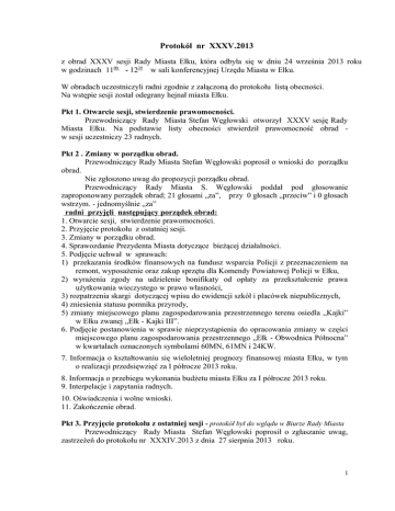 Protokół nr XXXV.2013 z obrad XXXV sesji Rady Miasta Ełku, która odbyła się w dniu 24 września 2013 roku w godzinach 1100 - 1239 w sali konferencyjnej Urzędu Miasta w Ełku. W obradach uczestniczyli radni zgodnie z załączoną do protokołu listą obecności. Na wstępie sesji został odegrany hejnał miasta Ełku. Pkt 1. Otwarcie sesji, stwierdzenie prawomocności. Przewodniczący Rady Miasta Stefan Węgłowski otworzył XXXV sesję Rady Miasta Ełku. Na podstawie listy obecności stwierdził prawomocność obrad w sesji uczestniczy 23 radnych. Pkt 2 . Zmiany w porządku obrad. Przewodniczący Rady Miasta Stefan Węgłowski poprosił o wnioski do porządku obrad. Nie zgłoszono uwag do propozycji porządku obrad. Przewodniczący Rady Miasta S. Węgłowski poddał pod głosowanie zaproponowany porządek obrad; 21 głosami „za”, przy 0 głosach „przeciw” i 0 głosach wstrzym. - jednomyślnie „za” radni przyjęli następujący porządek obrad: 1. Otwarcie sesji, stwierdzenie prawomocności. 2. Przyjęcie protokołu z ostatniej sesji. 3. Zmiany w porządku obrad. 4. Sprawozdanie Prezydenta Miasta dotyczące bieżącej działalności. 5. Podjęcie uchwał w sprawach: 1) przekazania środków finansowych na fundusz wsparcia Policji z przeznaczeniem na remont, wyposażenie oraz zakup sprzętu dla Komendy Powiatowej Policji w Ełku, 2) wyrażenia zgody na udzielenie bonifikaty od opłaty za przekształcenie prawa użytkowania wieczystego w prawo własności, 3) rozpatrzenia skargi dotyczącej wpisu do ewidencji szkół i placówek niepublicznych, 4) zniesienia statusu pomnika przyrody, 5) zmiany miejscowego planu zagospodarowania przestrzennego terenu osiedla „Kajki” w Ełku zwanej „Ełk - Kajki III”. 6. Podjęcie postanowienia w sprawie nieprzystąpienia do opracowania zmiany w części miejscowego planu zagospodarowania przestrzennego „Ełk - Obwodnica Północna” w kwartałach oznaczonych symbolami 60MN, 61MN i 24KW. 7. Informacja o kształtowaniu się wieloletniej prognozy finansowej miasta Ełku, w tym o realizacji przedsięwzięć za I półrocze 2013 roku. 8. Informacja o przebiegu wykonania budżetu miasta Ełku za I półrocze 2013 roku. 9. Interpelacje i zapytania radnych. 10. Oświadczenia i wolne wnioski. 11. Zakończenie obrad. Pkt 3. Przyjęcie protokołu z ostatniej sesji - protokół był do wglądu w Biurze Rady Miasta Przewodniczący Rady Miasta Stefan Węgłowski poprosił o zgłaszanie uwag, zastrzeżeń do protokołu nr XXXIV.2013 z dnia 27 sierpnia 2013 roku. 1 W związku z brakiem zastrzeżeń Przewodniczący Rady Miasta Stefan Węgłowski stwierdził, że protokół nr XXXIV.2013 z dnia 27 sierpnia 2013 roku został przyjęty jednomyślnie bez uwag. Pkt 4. Informacja Prezydenta Miasta dotycząca bieżącej działalności. Sprawozdanie z działalności Prezydenta Miasta Ełku w okresie od dnia 27 sierpnia 2013 r. do dnia 20 września 2013 r., w załączeniu do protokołu. Prezydent Miasta Tomasz Andrukiewicz w uzupełnieniu informacji, którą radni otrzymali na piśmie przedstawił działania jakie były dokonywane w ostatnim okresie międzysesyjnym, między innymi poinformował: − podpisane zostały umowa na: > przebudowę ulicy Wawelskiej – na odcinku od ulicy Mickiewicza w kierunku budynków TP S.A. Na realizację tego zamówienia planowano kwotę 715.543,53 zł. Umowę podpisano na kwotę 607.238,27 zł, > przeprowadzenie diagnozy i delimitacji ełckiego obszaru funkcjonalnego w ramach projektu - przygotowanie dokumentów strategicznych dla ełckiego obszaru funkcjonalnego województwa warmińsko-mazurskiego. Na realizację tego zamówienia planowano kwotę 80.577,50 zł. Umowę podpisano na kwotę 80.000,00 zł, − Dokonano wyboru najkorzystniejszej oferty na: > opracowanie zmiany miejscowego planu zagospodarowania przestrzennego Ełk - Brama Mazur, zwanej Ełk - Brama Mazur II , > dostawę zestawów komputerowych z oprogramowaniem, telefonu, urządzenia wielofunkcyjnego i zestawu do wideokonferencji w ramach projektu „Biuro Wspierania Przedsiębiorczości” współfinansowanego ze środków Unii Europejskiej z Programu Współpracy Transgranicznej Litwa-Polska-Rosja 2007-2013, − Postępowania, w których dokonano otwarcia ofert i trwa ocena ofert pod względem formalno-prawnym na: > opracowanie kompleksowej dokumentacji projektowo-kosztorysowej dla zadania: Przebudowa Miejskiego Przedszkola Perełka im. Jana Brzechwy w Ełku przy ul. Armii Krajowej 4, > opracowanie projektu miejscowego planu zagospodarowania przestrzennego zwanego EŁK – OSIEDLE GRUNWALDZKIE, > naprawę dachu na budynku Techno-Parku w Ełku przy ul. Podmiejskiej 5 w ramach zastępczej naprawy gwarancyjnej, > wykonanie oznakowania pionowego, dostawa i montaż gabloty zewnętrznej oraz podświetlanego dwustronnego kasetonu do lokalu Informacji Turystycznej w Ełku w ramach projektu Modernizacja i rozbudowa regionalnego systemu informacji turystycznej, RPO Warmia i Mazury na lata 2007-2013, > budowę szkolnego placu zabaw przy Szkole Podstawowej nr 5 im. M. Konopnickiej w Ełku, ul. Św. M.M. Kolbe 11 w ramach programu RADOSNA SZKOŁA, > wykonanie systemu informacji turystycznej w postaci wielojęzycznej strony www z wirtualnymi spacerami oraz materiałów promocyjnych w ramach projektu pn. Rozwój turystyki aktywnej płaszczyzną polsko-rosyjskiej współpracy współfinansowanego ze środków Unii Europejskiej, > budowę utwardzonych dojść i dojazdów z parkingami oraz kanalizacją deszczową i oświetleniem terenu przy ul. Świackiego „Sępa” w ramach zadania – zagospodarowanie terenów komunalnych. − Postępowania, jakie zostały ogłoszone we wrześniu 2013 roku: 2 > na „wykonanie sieci LAN, dostawa PIAP-ów i infokiosków” realizowanych w ramach projektu: „Elkman II – rozbudowa sieci szerokopasmowej aglomeracji Miasta Ełku”, > na wyposażenie laboratorium koloru – zakup sprzętu laboratoryjnego i mebli do laboratorium w ramach p