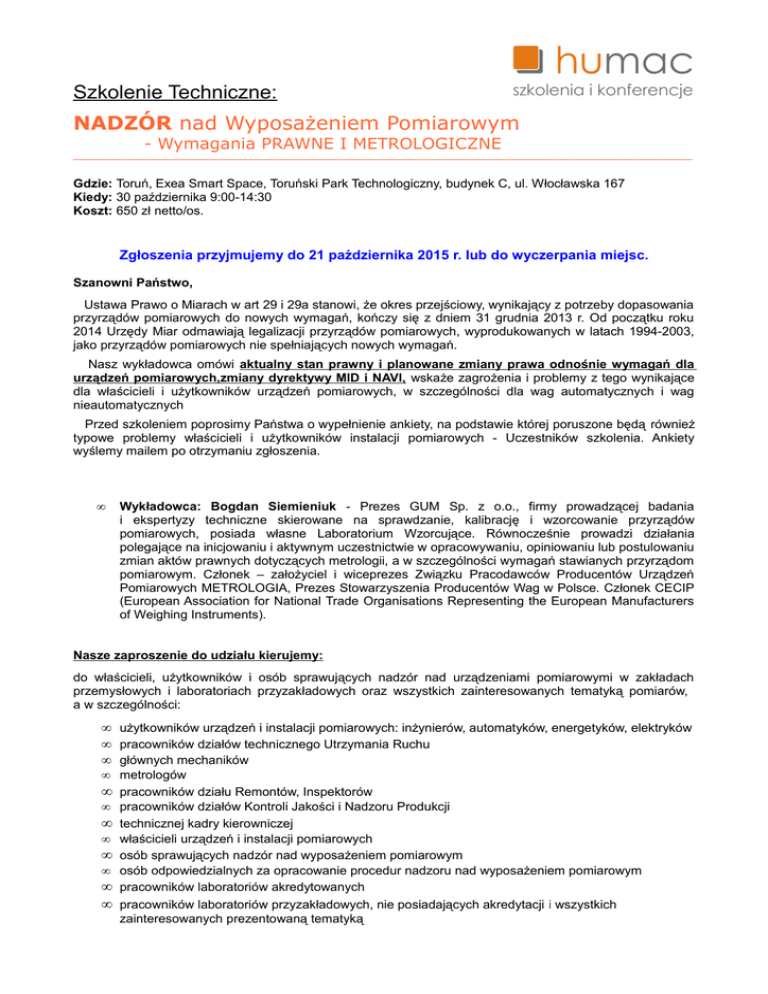 Szkolenie Techniczne: NADZÓR nad Wyposażeniem Pomiarowym - Wymagania PRAWNE I METROLOGICZNE ________________________________________________________________________________________________________________________________________________ Gdzie: Toruń, Exea Smart Space, Toruński Park Technologiczny, budynek C, ul. Włocławska 167 Kiedy: 30 października 9:00-14:30 Koszt: 650 zł netto/os. Zgłoszenia przyjmujemy do 21 października 2015 r. lub do wyczerpania miejsc. Szanowni Państwo, Ustawa Prawo o Miarach w art 29 i 29a stanowi, że okres przejściowy, wynikający z potrzeby dopasowania przyrządów pomiarowych do nowych wymagań, kończy się z dniem 31 grudnia 2013 r. Od początku roku 2014 Urzędy Miar odmawiają legalizacji przyrządów pomiarowych, wyprodukowanych w latach 1994-2003, jako przyrządów pomiarowych nie spełniających nowych wymagań. Nasz wykładowca omówi aktualny stan prawny i planowane zmiany prawa odnośnie wymagań dla urządzeń pomiarowych,zmiany dyrektywy MID i NAVI, wskaże zagrożenia i problemy z tego wynikające dla właścicieli i użytkowników urządzeń pomiarowych, w szczególności dla wag automatycznych i wag nieautomatycznych Przed szkoleniem poprosimy Państwa o wypełnienie ankiety, na podstawie której poruszone będą również typowe problemy właścicieli i użytkowników instalacji pomiarowych - Uczestników szkolenia. Ankiety wyślemy mailem po otrzymaniu zgłoszenia. • Wykładowca: Bogdan Siemieniuk - Prezes GUM Sp. z o.o., firmy prowadzącej badania i ekspertyzy techniczne skierowane na sprawdzanie, kalibrację i wzorcowanie przyrządów pomiarowych, posiada własne Laboratorium Wzorcujące. Równocześnie prowadzi działania polegające na inicjowaniu i aktywnym uczestnictwie w opracowywaniu, opiniowaniu lub postulowaniu zmian aktów prawnych dotyczących metrologii, a w szczególności wymagań stawianych przyrządom pomiarowym. Członek – założyciel i wiceprezes Związku Pracodawców Producentów Urządzeń Pomiarowych METROLOGIA, Prezes Stowarzyszenia Producentów Wag w Polsce. Członek CECIP (European Association for National Trade Organisations Representing the European Manufacturers of Weighing Instruments). Nasze zaproszenie do udziału kierujemy: do właścicieli, użytkowników i osób sprawujących nadzór nad urządzeniami pomiarowymi w zakładach przemysłowych i laboratoriach przyzakładowych oraz wszystkich zainteresowanych tematyką pomiarów, a w szczególności: • użytkowników urządzeń i instalacji pomiarowych: inżynierów, automatyków, energetyków, elektryków • pracowników działów technicznego Utrzymania Ruchu • głównych mechaników • metrologów • pracowników działu Remontów, Inspektorów • pracowników działów Kontroli Jakości i Nadzoru Produkcji • technicznej kadry kierowniczej • właścicieli urządzeń i instalacji pomiarowych • osób sprawujących nadzór nad wyposażeniem pomiarowym • osób odpowiedzialnych za opracowanie procedur nadzoru nad wyposażeniem pomiarowym • pracowników laboratoriów akredytowanych • pracowników laboratoriów przyzakładowych, nie posiadających akredytacji i wszystkich zainteresowanych prezentowaną tematyką Szkolenie Techniczne: NADZÓR nad Wyposażeniem Pomiarowym -Wymagania PRAWNE I METROLOGICZNE________________________________________________________________________________________________________________________________________________ Program Ramowy: Część I. Metrologia ogólna - pomiar, błąd pomiaru, niepewność pomiaru, zasada zgodności, spójność pomiarów - wzorce masy Sposoby nadzoru nad przyrządami pomiarowymi - ocena zgodności, moduły oceny zgodności - legalizacja pierwotna i ponowna - wzorcowanie - dyrektywy UE, Rozporządzenia Ministra Gospodarki - planowane zmiany dyrektywy MID i NAVI w roku 2016 Zasady spójności pomiarowej w metrologii prawnej i przemysłowej Zarządzanie częstotliwością sprawdzania i wzorcowania AKP Ważność dowodów kontroli metrologicznej - świadectwa legalizacji, wzory cech legalizacji - terminy ważności kontroli metrologicznej - liczniki energii elektrycznej, gazomierze, ciepłomierz Waga – przyrząd do pomiaru masy i ciężaru - podział, przeznaczenie, klasyfikacja wag - waga kontrolna Warunki techniczne, jakie powinny spełniać wagi, procedura przeważania kontrolnego wagi: - nieautomatyczne samochodowe i kolejowe - automatyczne przenośnikowe - automatyczne do ważenia w ruchu wagonów spiętych Zmiany wymagań dla urządzeń pomiarowych po 1.01.2015 r. Część II. Dyskusja i omówienie typowych problemów właścicieli i użytkowników instalacji pomiarowych na podstawie ankiet Uczestników szkolenia. Ankiety wysyłamy po otrzymaniu zgłoszenia. - Konsultacje indywidualne Część III. Zakończenie - sprawdzenie wiedzy - wręczenie certyfikatów Lunch W przerwach między wykładami Uczestnicy będą mogli skorzystać z przerw kawowych. UWAGA – ilość miejsc jest ograniczona ze względu na charakter spotkania - szkolenie. Uczestnicy szkolenia otrzymają: materiały w wersji drukowanej i elektronicznej, imienny certyfikat uczestnictwa. Cena obejmuje: uczestnictwo w szkoleniu, materiały szkoleniowe, przerwy kawowe, lunch, imienny certyfikat uczestnictwa. Szkolenie Techniczne: NADZÓR nad Wyposażeniem Pomiarowym - Wymagania PRAWNE I METROLOGICZNE- ________________________________________________________________________________________________________________________________________________ Gdzie: Toruń, Exea Smart Space, Toruński Park Technologiczny, budynek C, ul. Włocławska 167 Kiedy: 30 października 9:00-14:30 Koszt: 650 zł Zgłoszenia przyjmujemy do 21 października 2015, lub do wyczerpania miejsc. ■ Zgłaszam udział przedstawicieli Firmy: NAZWA FIRMY /do faktury/:.............................................................................................................................. adres:.................................................
