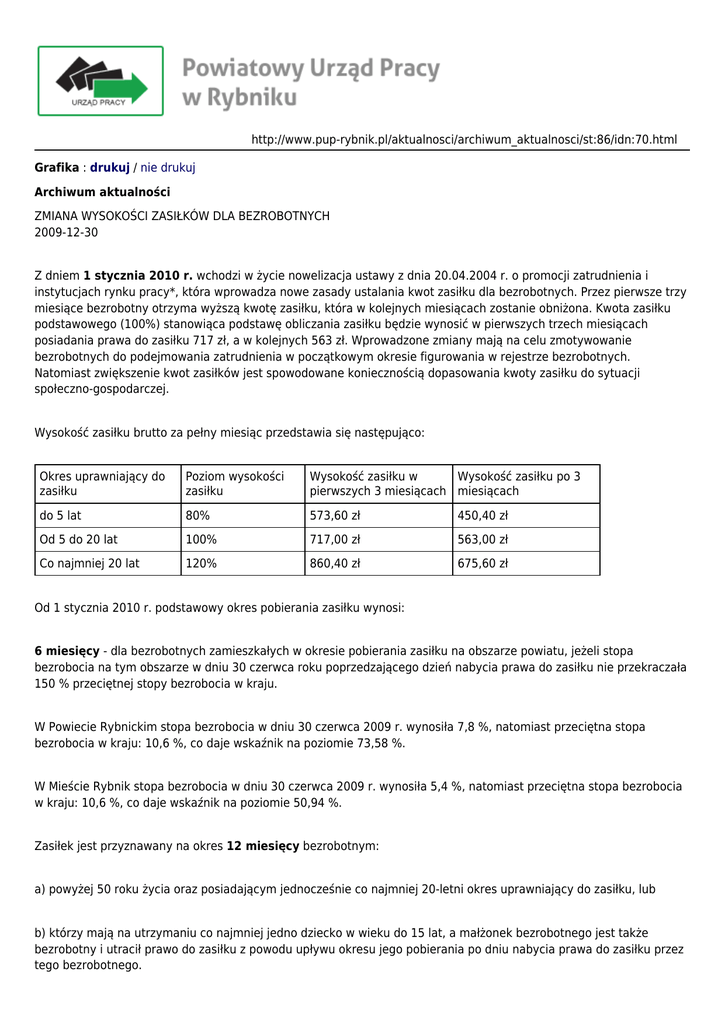 http://www.pup-rybnik.pl/aktualnosci/archiwum_aktualnosci/st:86/idn:70.html Grafika : drukuj / nie drukuj Archiwum aktualności ZMIANA WYSOKOŚCI ZASIŁKÓW DLA BEZROBOTNYCH 2009-12-30 Z dniem 1 stycznia 2010 r. wchodzi w życie nowelizacja ustawy z dnia 20.04.2004 r. o promocji zatrudnienia i instytucjach rynku pracy*, która wprowadza nowe zasady ustalania kwot zasiłku dla bezrobotnych. Przez pierwsze trzy miesiące bezrobotny otrzyma wyższą kwotę zasiłku, która w kolejnych miesiącach zostanie obniżona. Kwota zasiłku podstawowego (100%) stanowiąca podstawę obliczania zasiłku będzie wynosić w pierwszych trzech miesiącach posiadania prawa do zasiłku 717 zł, a w kolejnych 563 zł. Wprowadzone zmiany mają na celu zmotywowanie bezrobotnych do podejmowania zatrudnienia w początkowym okresie figurowania w rejestrze bezrobotnych. Natomiast zwiększenie kwot zasiłków jest spowodowane koniecznością dopasowania kwoty zasiłku do sytuacji społeczno-gospodarczej. Wysokość zasiłku brutto za pełny miesiąc przedstawia się następująco: Okres uprawniający do zasiłku Poziom wysokości zasiłku Wysokość zasiłku w Wysokość zasiłku po 3 pierwszych 3 miesiącach miesiącach do 5 lat 80% 573,60 zł 450,40 zł Od 5 do 20 lat 100% 717,00 zł 563,00 zł Co najmniej 20 lat 120% 860,40 zł 675,60 zł Od 1 stycznia 2010 r. podstawowy okres pobierania zasiłku wynosi: 6 miesięcy - dla bezrobotnych zamieszkałych w okresie pobierania zasiłku na obszarze powiatu, jeżeli stopa bezrobocia na tym obszarze w dniu 30 czerwca roku poprzedzającego dzień nabycia prawa do zasiłku nie przekraczała 150 % przeciętnej stopy bezrobocia w kraju. W Powiecie Rybnickim stopa bezrobocia w dniu 30 czerwca 2009 r. wynosiła 7,8 %, natomiast przeciętna stopa bezrobocia w kraju: 10,6 %, co daje wskaźnik na poziomie 73,58 %. W Mieście Rybnik stopa bezrobocia w dniu 30 czerwca 2009 r. wynosiła 5,4 %, natomiast przeciętna stopa bezrobocia w kraju: 10,6 %, co daje wskaźnik na poziomie 50,94 %. Zasiłek jest przyznawany na okres 12 miesięcy bezrobotnym: a) powyżej 50 roku życia oraz posiadającym jednocześnie co najmniej 20-letni okres uprawniający do zasiłku, lub b) którzy mają na utrzymaniu co najmniej jedno dziecko w wieku do 15 lat, a małżonek bezrobotnego jest także bezrobotny i utracił prawo do zasiłku z powodu upływu okresu jego pobierania po dniu nabycia prawa do zasiłku przez tego bezrobotnego. Nowa wysokość zasiłków przysługiwać będzie bezrobotnym, którzy nabędą prawo do zasiłku po dniu 1 stycznia 2010 r. Zasiłki dla bezrobotnych przyznane przed dniem 1 stycznia 2010 r. będą wypłacane w wysokości wynikającej z dotychczasowych przepisów. * art. 1 pkt 49 ustawy z dnia 19.12.2008 r. o zmianie ustawy o promocji zatrudnienia i instytucjach rynku pracy oraz o zmianie niektórych innych ustaw (Dz. U. z 2009 r. Nr 6 poz. 33). wszystkie wiadomości ›
