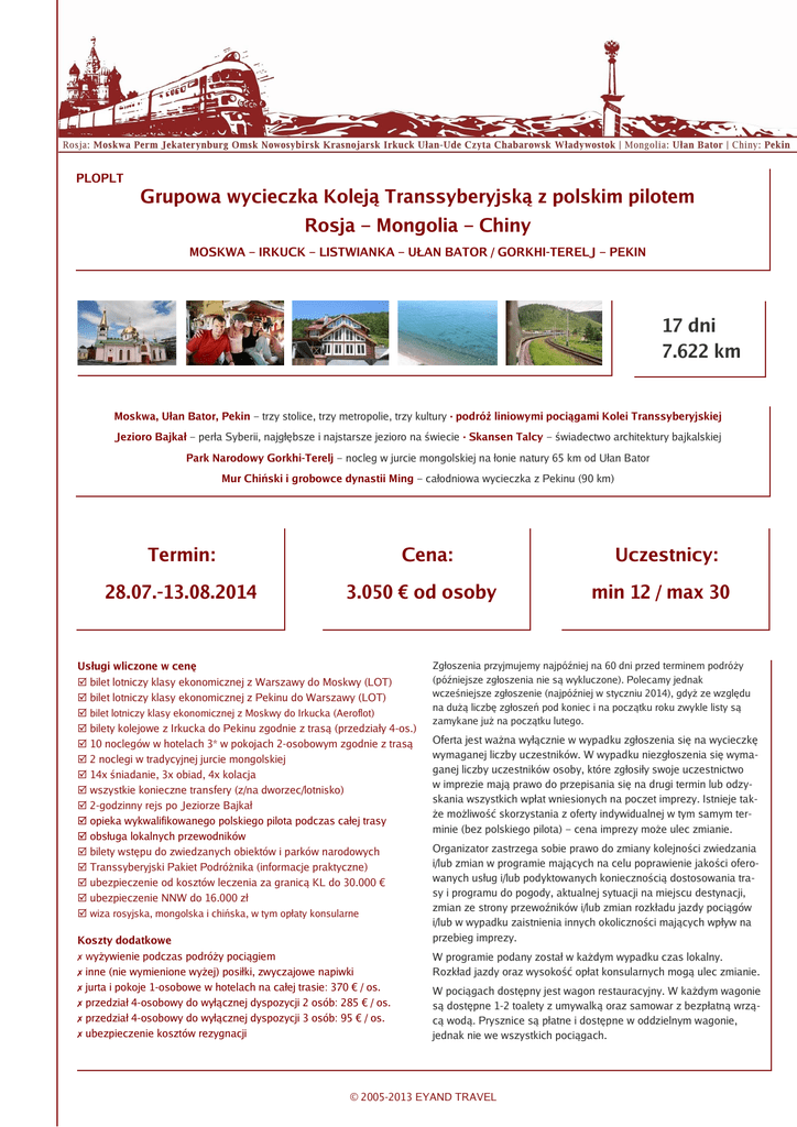 PLOPLT Grupowa wycieczka Koleją Transsyberyjską z polskim pilotem Rosja – Mongolia – Chiny MOSKWA – IRKUCK – LISTWIANKA – UŁAN BATOR / GORKHI-TERELJ – PEKIN 17 dni 7.622 km Moskwa, Ułan Bator, Pekin – trzy stolice, trzy metropolie, trzy kultury · podróż liniowymi pociągami Kolei Transsyberyjskiej Jezioro Bajkał – perła Syberii, najgłębsze i najstarsze jezioro na świecie · Skansen Talcy – świadectwo architektury bajkalskiej Park Narodowy Gorkhi-Terelj – nocleg w jurcie mongolskiej na łonie natury 65 km od Ułan Bator Mur Chiński i grobowce dynastii Ming – całodniowa wycieczka z Pekinu (90 km) Termin: 28.07.-13.08.2014 Cena: 3.050 € od osoby Usługi wliczone w cenę ☑ bilet lotniczy klasy ekonomicznej z Warszawy do Moskwy (LOT) ☑ bilet lotniczy klasy ekonomicznej z Pekinu do Warszawy (LOT) ☑ bilet lotniczy klasy ekonomicznej z Moskwy do Irkucka (Aeroflot) ☑ bilety kolejowe z Irkucka do Pekinu zgodnie z trasą (przedziały 4-os.) ☑ 10 noclegów w hotelach 3* w pokojach 2-osobowym zgodnie z trasą ☑ 2 noclegi w tradycyjnej jurcie mongolskiej ☑ 14x śniadanie, 3x obiad, 4x kolacja ☑ wszystkie konieczne transfery (z/na dworzec/lotnisko) ☑ 2-godzinny rejs po Jeziorze Bajkał ☑ opieka wykwalifikowanego polskiego pilota podczas całej trasy ☑ obsługa lokalnych przewodników ☑ bilety wstępu do zwiedzanych obiektów i parków narodowych ☑ Transsyberyjski Pakiet Podróżnika (informacje praktyczne) ☑ ubezpieczenie od kosztów leczenia za granicą KL do 30.000 € ☑ ubezpieczenie NNW do 16.000 zł ☑ wiza rosyjska, mongolska i chińska, w tym opłaty konsularne Koszty dodatkowe ✗ wyżywienie podczas podróży pociągiem ✗ inne (nie wymienione wyżej) posiłki, zwyczajowe napiwki ✗ jurta i pokoje 1-osobowe w hotelach na całej trasie: 370 € / os. ✗ przedział 4-osobowy do wyłącznej dyspozycji 2 osób: 285 € / os. ✗ przedział 4-osobowy do wyłącznej dyspozycji 3 osób: 95 € / os. ✗ ubezpieczenie kosztów rezygnacji Uczestnicy: min 12 / max 30 Zgłoszenia przyjmujemy najpóźniej na 60 dni przed terminem podróży (późniejsze zgłoszenia nie są wykluczone). Polecamy jednak wcześniejsze zgłoszenie (najpóźniej w styczniu 2014), gdyż ze względu na dużą liczbę zgłoszeń pod koniec i na początku roku zwykle listy są zamykane już na początku lutego. Oferta jest ważna wyłącznie w wypadku zgłoszenia się na wycieczkę wymaganej liczby uczestników. W wypadku niezgłoszenia się wymaganej liczby uczestników osoby, które zgłosiły swoje uczestnictwo w imprezie mają prawo do przepisania się na drugi termin lub odzyskania wszystkich wpłat wniesionych na poczet imprezy. Istnieje także możliwość skorzystania z oferty indywidualnej w tym samym terminie (bez polskiego pilota) – cena imprezy może ulec zmianie. Organizator zastrzega sobie prawo do zmiany kolejności zwiedzania i/lub zmian w programie mających na celu poprawienie jakości oferowanych usług i/lub podyktowanych koniecznością dostosowania trasy i programu do pogody, aktualnej sytuacji na miejscu destynacji, zmian ze strony przewoźników i/lub zmian rozkładu jazdy pociągów i/lub w wypadku zaistnienia innych okoliczności mających wpływ na przebieg imprezy. W programie podany został w każdym wypadku czas lokalny. Rozkład jazdy oraz wysokość opłat konsularnych mogą ulec zmianie. W pociągach dostępny jest wagon restauracyjny. W każdym wagonie są dostępne 1-2 toalety z umywalką oraz samowar z bezpłatną wrzącą wodą. Prysznice są płatne i dostępne w oddzielnym wagonie, jednak nie we wszystkich pociągach. © 2005-2013 EYAND TRAVEL Zapraszamy Państwa na wycieczkę liniowymi pociągami Kolei Transsyberyjskiej do Pekinu. Zastąpienie przejazdu pociągiem lotem na trasie Moskwa Irkuck pozwoliło na rozszerzenie programu o dodatkowe dni w Moskwie, Listwiance nad Bajkałem, Ułan Bator i Pekinie. Ta zmiana nie powoduje utraty walorów przejazdu Koleją Transsyberyjską, gdyż przejazd koleją następuje na najciekawszym i najbardziej urozmaiconym krajobrazowo odcinku trasy pomiędzy Irkuckiem a Pekinem. Trasa prowadzi zatem około 200 km wzdłuż Jeziora Bajkał, następnie przez piękną i ciekawą rosyjską Republikę Buriacji i niemalże niezaludnione mongolskie stepy. Podczas całej trasy towarzyszy Państwu wykwalifikowany polski pilot. W pociągu będzie okazja do zawarcia nowych ciekawych znajomości, zapoznania się z inną kulturą i zrobienia pięknych zdjęć. Na peronach stacji pośrednich będą Państwo mieli okazję spróbowania świeżych regionalnych przysmaków. Podczas podróży przewidziane są postoje w wybranych ciekawych miejscowościach na trasie: Irkucku i Ułan Bator oraz pobyt na łonie natury – nad Jeziorem Bajkał w miejscowości Listwianka i w mongolskim Parku Narodowym Terelj połączony z noclegiem w tradycyjnej jurcie mongolskiej. W Listwiance będzie możliwość skosztowania bajkalskiego specjału – wędzonej ryby omul i skorzystania z tradycyjnej sauny rosyjskiej – banji. W programie przewidziany jest ponadto 2-godzinny rejs po Jeziorze Bajkał oraz całodniowa wycieczka, podczas której zobaczą Państwo jeden z najlepiej zachowanych odcinków słynnego Muru Chińskiego. Przebieg trasy Moskwa (1) 28.07. Zbiórka na lotnisku w Warszawie po południu, lot do Moskwy. Transfer z lotniska do hotelu. Zakwaterowanie, kolacja i nocleg. (2) 29.07. Dziś zwiedzą Państwo Kreml, Plac Czerwony i okolice. W programie przewidziany jest także spacer po słynnej historycznej ulicy Arbat znanej z piosenek Bułata Okudżawy, przy której zamieszkiwał także Aleksander Puszkin. Czeka Państwa także wycieczka moskiewskim metrem, podczas której zobaczą Państwo wybrane najciekawsze stacje i przekonają się dlaczego określane są one mianem podziemnych pałaców. Po południu czas wolny. Nocleg w 3* hotelu. (3) 30.07. Czas wolny, a dla chętnych bezpłatny program fakultatywny: wyci
