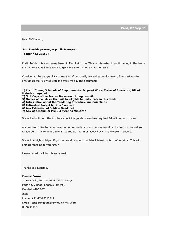 Wed, 07 Sep 11 Dear Sir\Madam, Sub: Provide passenger public transport Tender No.: 281637 Euclid Infotech is a company based in Mumbai, India. We are interested in participating in the tender mentioned above hence want to get more information about the same. Considering the geographical constraint of personally reviewing the document, I request you to provide us the following details before we buy the document: 1) List of Items, Schedule of Requirements, Scope of Work, Terms of Reference, Bill of Materials required. 2) Soft Copy of the Tender Document through email. 3) Names of countries that will be eligible to participate in this tender. 4) Information about the Tendering Procedure and Guidelines 5) Estimated Budget for this Purchase 6) Any Extension of Bidding Deadline? 7) Any Addendum or Pre Bid meeting Minutes? We will submit our offer for the same if the goods or services required fall within our purview. Also we would like to be informed of future tenders from your organization. Hence, we request you to add our name to your bidder's list and do inform us about upcoming Projects, Tenders. We will be highly obliged if you can send us your complete & latest contact information. This will help us reaching to you faster. Please revert back to this same mail . Thanks and Regards, Manasi Pawar 1, Arch Gold, Next to MTNL Tel Exchange, Poisar, S V Road, Kandivali (West), Mumbai - 400 067 India Phone: +91-22-28013817 Email : [email protected] No.9490130 Dear Sir/Madam, we inform you, that all necessary informations and documents to passenger public transport tender, you will find on our BIP (Newsletter of Public Information) website: Link: http://bip.miastomyszkow.pl/?go=259&read=2668 Unfortunatelly, all documents are in polish language. All Informations about the Tendering Procedures and Guidelines, we present on our website: Link: http://bip.miastomyszkow.pl/?go=259 To contact us, please write: Link: http://bip.miastomyszkow.pl and http://www.miastomyszkow.pl/ Best regards, Anna Sitek Urząd Miasta Myszkowa – z-ca kierownika Wydziału Ochrony Środowiska i Gospodarki Komunalnej. 42-300 Myszków Kościuszki 26, pokój 259 tel. 34 313-26-82 wew. 163, e-mail: [email protected] Szanowny Panie/Pani, dot.: Wykonanie usługi w zakresie przewozów pasażerskich środkami komunikacji miejskiej Nr przetargu: 281637 Euclid Infotech to firma z siedzibą w Mumbai, w Indiach. Jesteśmy zainteresowani uczestnictwem w w/w przetargu, prosimy o udzielenie więcej informacji o nim. Biorąc pod uwagę geograficzne ograniczenia, aby osobiście dokonać analizy dokumentów, prosimy o przekazanie nam następujących danych: 1) 2) 3) 4) 5) 6) 7) Listę załączników, harmonogram wykonania, zakres działania, wymagane materiały Kopie dokumentów przesłane na e-mail Listę krajów, które kwalifikują się do uczestnictwa w przetargu Informacje o przetargu i wytyczne Szacunkowy budżet na tą usługę Ewentualne przedłużenie terminu przetargu Dodatkowe załączniki Przedstawimy naszą ofertę, jeśli wymogi będą zgodne z naszym zakresem usług. Chcielibyśmy być w przyszłości informowani o innych przetargach ogłaszanych przez Państwa instytucję. Dlatego prosimy o dodanie naszej firmy do listy potencjalnych oferentów oraz o informowanie nas o planowanych projektach. Będziemy zobowiązani, jeśli prześlą nam Państwo pełne dane kontaktowe. To pozwoli nam na szybsze nawiązanie kontaktu z Państwem. Proszę o przesłanie danych na ten sam adres e-mail. Dziękuję i pozdrawiam, Manasi Pawar 1, Arch Gold, Next to MTNL Tel Exchange, Poisar, S V Road, Kandivall (West), Mumbai – 400 067 Indie Tel.: +91-22-28013817 e-mail: [email protected] No.9490130 Odpowiedź Szanowny Panie/Pani, Informujemy, że wszystkie niezbędne informacje oraz dokumenty dotyczące przetargu na przewóz pasażerski środkami komunikacji miejskiej, znajdą Państwo w BiP-ie (Biuletynie Informacji Publicznej): Link: http://bip.miastomyszkow.pl/?go=259&read=2668 Niestety, wszystkie dokumenty są w języku polskim. Wszelkie informacje o przetargach, prezentujemy na naszej stronie internetowej: Link: http://bip.miastomyszkow.pl/?go=259 Nasze dane kontaktowe: Link: http://bip.miastomyszkow.pl oraz http://www.miastomyszkow.pl Pozdrawiam, Anna Sitek Urząd Miasta Myszkowa Z-ca kierownika Wydziału Ochrony Środowiska i Gospodarki Komunalnej 42-300 Myszków, Kościuszki 26, pokój 259, tel. 34 313-26-82 wew. 163