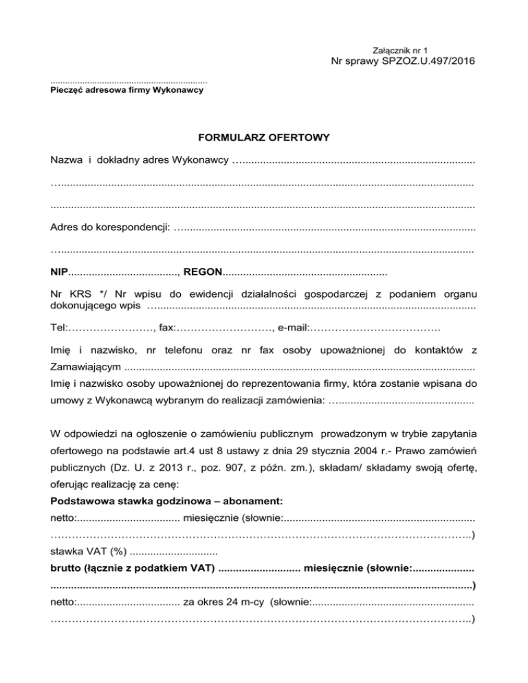 Załącznik nr 1 Nr sprawy SPZOZ.U.497/2016 ................................................................ Pieczęć adresowa firmy Wykonawcy FORMULARZ OFERTOWY Nazwa i dokładny adres Wykonawcy …............................................................................... …............................................................................................................................................ ................................................................................................................................................ Adres do korespondencji: …................................................................................................... …............................................................................................................................................ NIP....................................., REGON........................................................ Nr KRS */ Nr wpisu do ewidencji działalności gospodarczej z podaniem organu dokonującego wpis …............................................................................................................ Tel:……………………, fax:………………………, e-mail:………………………………. Imię i nazwisko, nr telefonu oraz nr fax osoby upoważnionej do kontaktów z Zamawiającym ....................................................................................................................... Imię i nazwisko osoby upoważnionej do reprezentowania firmy, która zostanie wpisana do umowy z Wykonawcą wybranym do realizacji zamówienia: ….............................................. W odpowiedzi na ogłoszenie o zamówieniu publicznym prowadzonym w trybie zapytania ofertowego na podstawie art.4 ust 8 ustawy z dnia 29 stycznia 2004 r.- Prawo zamówień publicznych (Dz. U. z 2013 r., poz. 907, z późn. zm.), składam/ składamy swoją ofertę, oferując realizację za cenę: Podstawowa stawka godzinowa – abonament: netto:................................... miesięcznie (słownie:................................................................. ………………………………………………………………………………………………………..) stawka VAT (%) .............................. brutto (łącznie z podatkiem VAT) ............................ miesięcznie (słownie:..................... ...............................................................................................................................................) netto:................................... za okres 24 m-cy (słownie:....................................................... ………………………………………………………………………………………………………..) stawka VAT (%) .............................. brutto (łącznie z podatkiem VAT) ............................ za okres 24 miesięcy (słownie:............. ...............................................................................................................................................) Stawka za nadgodziny: netto:................................... za 1 roboczogodzinę (słownie:................................................... ………………………………………………………………………………………………………..) stawka VAT (%) .............................. brutto (łącznie z podatkiem VAT) ............................ za 1 roboczogodzinę (słownie:...............................................................................................................................) netto:................................... za 20 roboczogodzin (słownie:................................................... ………………………………………………………………………………………………………..) stawka VAT (%) .............................. brutto (łącznie z podatkiem VAT) ............................ za 20 roboczogodzin (słownie:...............................................................................................................................) Cena oferty: netto:................................... (słownie:.................................................................................... ………………………………………………………………………………………………………..) stawka VAT (%) .............................. brutto (łącznie z podatkiem VAT) ............................ (słownie:........................................... ...............................................................................................................................................) 1 Oświadczamy, iż zapoznaliśmy się z warunkami ogłoszenia z dnia 18.07.2016r. i nie wnosimy do nich żadnych zastrzeżeń. 2 Oświadczamy, że dołączony do ogłoszenia projekt umowy został przez nas zaakceptowany i zobowiązujemy się, w przypadku wyboru naszej oferty do zawarcia umowy na wymienionych w projekcie warunkach i w terminie wyznaczonym przez Zamawiającego. 3 Oświadczamy, że uważamy się za związanych niniejszą ofertą przez 30 dni od dnia upływu terminu składania ofert. Warszawa, dnia .............................................................................................. ( podpis osoby uprawnionej do składania ofert )