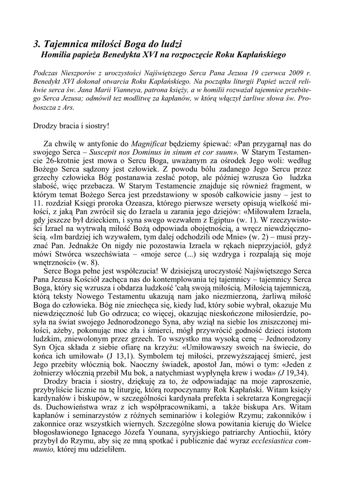 3. Tajemnica miłości Boga do ludzi Homilia papieża Benedykta XVI na rozpoczęcie Roku Kapłańskiego Podczas Nieszporów z uroczystości Najświętszego Serca Pana Jezusa 19 czerwca 2009 r. Benedykt XVI dokonał otwarcia Roku Kapłańskiego. Na początku liturgii Papież uczcił relikwie serca św. Jana Marii Vianneya, patrona księży, a w homilii rozważał tajemnice przebitego Serca Jezusa; odmówił tez modlitwę za kapłanów, w którą włączył żarliwe słowa św. Proboszcza z Ars. Drodzy bracia i siostry! Za chwilę w antyfonie do Magnificat będziemy śpiewać: «Pan przygarnął nas do swojego Serca – Suscepit nos Dominus in sinum et cor suum». W Starym Testamencie 26-krotnie jest mowa o Sercu Boga, uważanym za ośrodek Jego woli: według Bożego Serca sądzony jest człowiek. Z powodu bólu zadanego Jego Sercu przez grzechy człowieka Bóg postanawia zesłać potop, ale później wzrusza Go ludzka słabość, więc przebacza. W Starym Testamencie znajduje się również fragment, w którym temat Bożego Serca jest przedstawiony w sposób całkowicie jasny – jest to 11. rozdział Księgi proroka Ozeasza, którego pierwsze wersety opisują wielkość miłości, z jaką Pan zwrócił się do Izraela u zarania jego dziejów: «Miłowałem Izraela, gdy jeszcze był dzieckiem, i syna swego wezwałem z Egiptu» (w. 1). W rzeczywistości Izrael na wytrwałą miłość Bożą odpowiada obojętnością, a wręcz niewdzięcznością. «Im bardziej ich wzywałem, tym dalej odchodzili ode Mnie» (w. 2) – musi przyznać Pan. Jednakże On nigdy nie pozostawia Izraela w rękach nieprzyjaciół, gdyż mówi Stwórca wszechświata – «moje serce (...) się wzdryga i rozpalają się moje wnętrzności» (w. 8). Serce Boga pełne jest współczucia! W dzisiejszą uroczystość Najświętszego Serca Pana Jezusa Kościół zachęca nas do kontemplowania tej tajemnicy – tajemnicy Serca Boga, który się wzrusza i obdarza ludzkość 'całą swoją miłością. Miłością tajemniczą, którą teksty Nowego Testamentu ukazują nam jako niezmierzoną, żarliwą miłość Boga do człowieka. Bóg nie zniechęca się, kiedy lud, który sobie wybrał, okazuje Mu niewdzięczność lub Go odrzuca; co więcej, okazując nieskończone miłosierdzie, posyła na świat swojego Jednorodzonego Syna, aby wziął na siebie los zniszczonej miłości, ażeby, pokonując moc zła i śmierci, mógł przywrócić godność dzieci istotom ludzkim, zniewolonym przez grzech. To wszystko ma wysoką cenę – Jednorodzony Syn Ojca składa z siebie ofiarę na krzyżu: «Umiłowawszy swoich na świecie, do końca ich umiłował» (J 13,1). Symbolem tej miłości, przewyższającej śmierć, jest Jego przebity włócznią bok. Naoczny świadek, apostoł Jan, mówi o tym: «Jeden z żołnierzy włócznią przebił Mu bok, a natychmiast wypłynęła krew i woda» (J 19,34). Drodzy bracia i siostry, dziękuję za to, że odpowiadając na moje zaproszenie, przybyliście licznie na tę liturgię, którą rozpoczynamy Rok Kapłański. Witam księży kardynałów i biskupów, w szczególności kardynała prefekta i sekretarza Kongregacji ds. Duchowieństwa wraz z ich współpracownikami, a także biskupa Ars. Witam kapłanów i seminarzystów z różnych seminariów i kolegiów Rzymu; zakonników i zakonnice oraz wszystkich wiernych. Szczególne słowa powitania kieruję do Wielce błogosławionego Ignacego Józefa Younana, syryjskiego patriarchy Antiochii, który przybył do Rzymu, aby się ze mną spotkać i publicznie dać wyraz ecclesiastica communio, której mu udzieliłem. Tajemnica miłości Boga do ludzi. Homilia na rozpoczęcie Roku Kapłańskiego 11 Drodzy bracia i siostry, oddajmy się razem kontemplacji przebitego Serca Jezusa Ukrzyżowanego. Przed chwilą usłyszeliśmy raz jeszcze z odczytanego krótkiego fragmentu Listu św. Pawła do Efezjan, że «Bóg, będąc bogaty w miłosierdzie, przez wielką swą miłość, jaką nas umiłował, i to nas, umarłych na skutek występków, razem z Chrystusem przywrócił do życia (...) razem też wskrzesił i razem posadził na wyżynach niebieskich – w Chrystusie Jezusie» (Ef 2, 4-6). Być w Chrystusie Jezusie oznacza już zasiadać na wyżynach niebieskich. W Sercu Jezusa wyraża się sama istota chrześcijaństwa; w Chrystusie została nam objawiona i dana cała rewolucyjna nowość Ewangelii: Miłość, która nas zbawia i sprawia, że już żyjemy w wieczności Boga. Ewangelista Jan pisze: «Tak bowiem Bóg umiłował świat, że Syna swego Jednorodzonego dał, aby każdy, kto w Niego wierzy, nie zginął, ale miał życie wieczne» (3, 16). Jego Boskie Serce przyzywa zatem nasze serce; zachęca nas, abyśmy wyszli poza siebie, porzucili nasze ludzkie pewniki i zaufali Mu, a biorąc z Niego przykład, uczynili z siebie dar miłości bez zastrzeżeń. Choć prawdą jest, że wezwanie Jezusa, aby «trwać w Jego miłości» (por. J 15, 9), skierowane jest do wszystkich ochrzczonych, to w uroczystość Najświętszego Serca Pana Jezusa, będącą Dniem Modlitw o Świętość Kapłanów, to wezwanie rozbrzmiewa z większą mocą dla nas, kapłanów, a w szczególności w dzisiejszy wieczór, kiedy to uroczyście rozpoczynamy Rok Kapłański, który postanowiłem ogłosić z okazji 150. rocznicy śmierci Świętego Proboszcza z Ars. Od razu nasuwa mi się na myśl jego piękne i wzruszające stwierdzenie, przytoczone w Katechizmie Kościoła Katolickiego: «Kapłaństwo – to miłość Serca Jezusowego» (n. 1589). Jakże nie wspomnieć ze wzruszeniem, że wprost z tego Serca zrodził się dar naszego kapłaństwa? Jakże można nie pamiętać, że my, kapłani, zostaliśmy konsekrowani po to, żeby służyć, z pokorą i wiarygodnie, powszechnemu kapłaństwu wiernych? Nasza misja jest niezbędna dla Kościoła i dla świata, i wymaga pełnej wierności Chrystusowi oraz nieustającego zjednoczenia z Nim; zatem to trwanie w Jego miłości wymaga, abyśmy nie