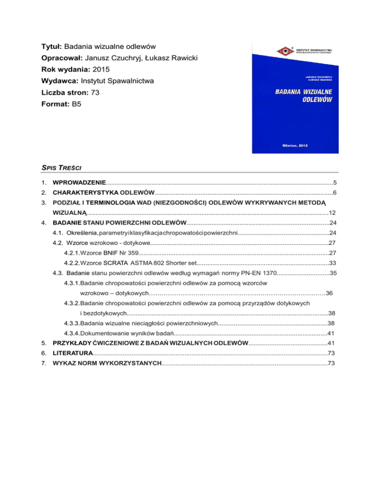 Tytuł: Badania wizualne odlewów Opracował: Janusz Czuchryj, Łukasz Rawicki Rok wydania: 2015 Wydawca: Instytut Spawalnictwa Liczba stron: 73 Format: B5 SPIS TREŚCI 1. WPROWADZENIE..................................................................................................................................5 2. CHARAKTERYSTYKA ODLEWÓW.....................................................................................................6 3. PODZIAŁ I TERMINOLOGIA WAD (NIEZGODNOŚCI) ODLEWÓW WYKRYWANYCH METODĄ WIZUALNĄ.........................................................................................................................................12 4. BADANIE STANU POWIERZCHNI ODLEWÓW.................................................................................24 4.1. Określenia, parametry i klasyfikacja chropowatości powierzchni....................................................24 4.2. Wzorce wzrokowo - dotykowe.....................................................................................................27 4.2.1.Wzorce BNIF Nr 359............................................................................................................27 4.2.2.Wzorce SCRATA ASTMA 802 Shorter set...........................................................................33 4.3. Badanie stanu powierzchni odlewów według wymagań normy PN-EN 1370..............................35 4.3.1.Badanie chropowatości powierzchni odlewów za pomocą wzorców wzrokowo – dotykowych……………………..………………………………………………….36 4.3.2.Badanie chropowatości powierzchni odlewów za pomocą przyrządów dotykowych i bezdotykowych..................................................................................................................38 4.3.3.Badania wizualne nieciągłości powierzchniowych..............................................................38 4.3.4.Dokumentowanie wyników badań.......................................................................................41 5. PRZYKŁADY ĆWICZENIOWE Z BADAŃ WIZUALNYCH ODLEWÓW.............................................41 6. LITERATURA.....................................................................................................................................73 7. WYKAZ NORM WYKORZYSTANYCH..............................................................................................73 Instytut Spawalnictwa materiały szkoleniowe WPROWADZENIE W normie PN-EN ISO 9001 zdefiniowano pojęcie specjalnych procesów produkcyjnych. Zalicza się do nich takie sposoby wytwarzania, których wynik nie może być w pełni sprawdzony przez kontrolę lub badania wyrobu oraz gdzie niedostatki przebiegu procesu wytwarzania mogą się ujawnić dopiero podczas jego eksploatacji. Wynika stąd, że procesy specjalne powinny być zawsze realizowane przez wykwalifikowany personel, natomiast parametry procesów permanentnie nadzorowane i monitorowane. Do specjalnych procesów wytwórczych zaliczono, między innymi, odlewanie (rys.1) [1]. PROCESY SPECJALNE SPAWANIE ODLEWANIE KUCIE Rys.1 Przykłady specjalnych procesów spawalniczych Odstępstwa od prawidłowej technologii odlewania mogą być przyczyną powstawania w wykonywanych wyrobach niezgodności (wad) odlewniczych. Obecność niezgodności w wyrobach powoduje z reguły obniżenie ich trwałości eksploatacyjnej. W wielu przypadkach niezgodności mogą być przyczyną poważnych awarii i dużych strat materialnych. Z tego powodu zarówno ilość jak i wielkość niezgodności w wykonywanych konstrukcjach powinna być możliwie najmniejsza. Do wykrywania oraz określania niezgodności odlewniczych stosuje się różne metody badań nieniszczących. Jednak metodę podstawową, stosowaną obowiązkowo, stanowią badania wizualne. Z tego powodu opracowano niniejszy podręcznik (poradnik), którego zawartość powinna ułatwić czytelnikowi przyswojenie informacji koniecznych do realizacji tych badań. Podręcznik stanowi uzupełnienie opracowania [2] w zakresie oceny jakości odlewów na podstawie badan wizualnych i jest przeznaczony dla operatorów badań wizualnych oraz inspektorów spawalniczych. Jako literatura uzupełniająca może być również wykorzystany podczas szkoleń międzynarodowych lub europejskich inżynierów i technologów spawalników. W opracowaniu podano charakterystykę odlewów i niezgodności w nich występujących, opisano stosowane do określania chropowatości powierzchni odlewów wzorce wzrokowo – dotykowe oraz dotykowe i bezdotykowe przyrządy, określono zasady badania chropowatości za pomocą tych środków. Opisano i podano zasady klasyfikacji niezgodności powierzchniowych odlewów za pomocą wymiarowania i wzorców do odlewów żeliwnych oraz staliwnych. W odrębnych rozdziałach określono sposób dokumentowania uzyskanych wyników badań oraz przykłady ćwiczeniowe z badań wizualnych odlewów. Dostęp do materiałów źródłowych opracowania zapewnia wykaz literatury i wykaz wykorzystanych norm. Strona 2 z 2