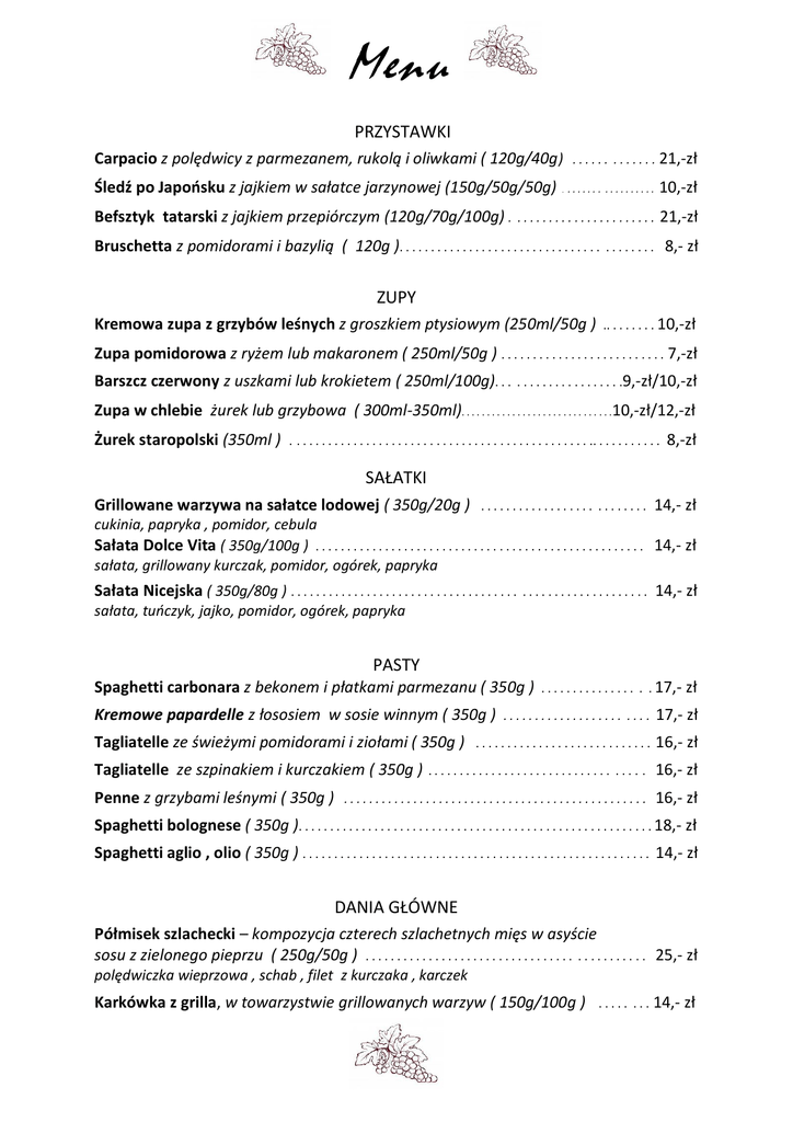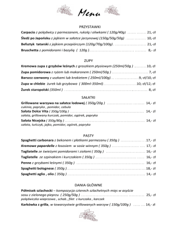 Menu PRZYSTAWKI Carpacio z polędwicy z parmezanem, rukolą i oliwkami ( 120g/40g ) Śledź po Japońsku z jajkiem w sałatce jarzynowej (150g/50g/50g) Befsztyk tatarski z jajkiem przepiórczym (120g/70g/100g) . . . . . . . . . . . . . . 21,-zł ....... .......... 10,-zł ...................... 21,-zł . Bruschetta z pomidorami i bazylią ( 120g ). . . . . . . . . . . . . . . . . . . . . . . . . . . . . . . . 8,- zł ........ ZUPY Kremowa zupa z grzybów leśnych z groszkiem ptysiowym (250ml/50g ) .. . . . . . . . 10,-zł Zupa pomidorowa z ryżem lub makaronem ( 250ml/50g ) . . . . . . . . . . . . . . . . . . . . . . . . . . 7,-zł Barszcz czerwony z uszkami lub krokietem ( 250ml/100g). . . . . . . . . . . . . . . . . . . .9,-zł/10,-zł Zupa w chlebie żurek lub grzybowa ( 300ml-350ml). . . . . . . . . . . . . . . . . . . . . . . . . . . . . .10,-zł/12,-zł Żurek staropolski (350ml ) . . . . . . . . . . . . . . . . . . . . . . . . . . . . . . . . . . . . . . . . . . . . . . . .. . . . . . . . . . . 8,-zł SAŁATKI Grillowane warzywa na sałatce lodowej ( 350g/20g ) .................. ........ 14,- zł cukinia, papryka , pomidor, cebula Sałata Dolce Vita ( 350g/100g ) . . . . . . . . . . . . . . . . . . . . . . . . . . . . . . . . . . . . . . . . . . . . . . . . . . . . 14,- zł sałata, grillowany kurczak, pomidor, ogórek, papryka Sałata Nicejska ( 350g/80g ) . . . . . . . . . . . . . . . . . . . . . . . . . . . . . . . . . . . . .................... 14,- zł sałata, tuńczyk, jajko, pomidor, ogórek, papryka PASTY Spaghetti carbonara z bekonem i płatkami parmezanu ( 350g ) Kremowe papardelle z łososiem w sosie winnym ( 350g ) Tagliatelle ze świeżymi pomidorami i ziołami ( 350g ) Tagliatelle ze szpinakiem i kurczakiem ( 350g ) Penne z grzybami leśnymi ( 350g ) . . . . . . . . . . . . . . . . . 17,- zł ................... .... 17,- zł ............................ 16,- zł ............................. .... . 16,- zł ................................................ 16,- zł Spaghetti bolognese ( 350g ). . . . . . . . . . . . . . . . . . . . . . . . . . . . . . . . . . . . . . . . . . . . . . . . . . . . . . . . 18,- zł Spaghetti aglio , olio ( 350g ) . . . . . . . . . . . . . . . . . . . . . . . . . . . . . . . . . . . . . . . . . . . . . . . . . . . . . . . 14,- zł DANIA GŁÓWNE Półmisek szlachecki – kompozycja czterech szlachetnych mięs w asyście sosu z zielonego pieprzu ( 250g/50g ) . . . . . . . . . . . . . . . . . . . . . . . . . . . . . . . . . . . . . . . . . . . . 25,- zł polędwiczka wieprzowa , schab , filet z kurczaka , karczek Karkówka z grilla, w towarzystwie grillowanych warzyw ( 150g/100g ) ..... ... 14,- zł Wieprzowy przekładaniec z bekonem i pomidorami ( 150g/100g/50g ) . .. . . . . . . 15,- zł Polędwica wołowa z grilla z sosem z zielonego pieprzu ( 180g/20g ) .. ....... 30,- zł Wachlarz z polędwiczki wieprzowej na sosie kurkowym ( 150g/100g ) . ......... 19,- zł Bryzol z polędwicy z pieczarkami ( 150g/50g ) . . . . . . . . . . . . . . . . . . . . . . . . . . . . . . . . . . . . 27,- zł Grilowana pierś z kurczaka ( 160g ) . . . . . . . . . . . . . . . . . . . . . . . . . . . . . . . . . . . . . . . . . . . . . . . 13,- zł T – Bon Stek ( 300g ) . . . . . . . . . . . . . . . . . . . . . . . . . . . . . . . . . . . . . . . . . . . . . . . . . . . . . . . . . . . . . . . . 39,- zł RYBY Łosoś z grilla lub na parze w kremowym sosie winnym (160g/60g ) Filet z mintaja w chrupiącej panierce ( 150g ) Pstrąg złocisty) z warzywami ( w/w 100 g ) . . . . . . . . . . . . . 22,- ..................................... zł 12,- zł . . . . . . . . . . . . . . . . . . . . . . . . . . . . . . . . . . . . . . . 8,- zł PIEROGI Misa pierogów według własnej kompozycji ( 10 szt. ) . . . . . . . . . . . . . . . . . . . . . . . . . . . . . 12,- zł do wyboru ruskie , z mięsem , kapusta – grzyby , szpinak – kurczak . DODATKI Półksiężyce z ziemniaków . . . . . zł Kapusta zasmażana z grzybami . . 5,- zł Ziemniaczane talarki . . . . . . . . . . . . 5,- zł Kompozycja warzyw na parze . . . . 5,- zł Ziemniaki . . . . . . . . . . . . . . . . . . . . . . . . 4,- zł Kompozycja surówek . . . . . . . . . . . . . 5,- zł Pieczywo Dufinki Frytki . . . 5,- . . . . . . . . .. . . . . . . . . . . . . . . . 2,- zł Szpinak . . . . . . . . . . . . . . . . . . . . . . . . . . 6, -zł Sos czosnkowy ** . . . . . . . . . . . . . . . . 2,- zł 5,- zł Ketchup , musztarda ** . . . . . . . . . . 2,- zł ........................... . . . . . . . . . . . . . . . . . . . . . . . . . . . 5,- Ryż . . . . . . . . . . . . . . . . . . . . . . . . . . . . . . . 5,- zł Dodatek masło **. . . porcja 150g ** porcja 50g zł . . . . . . . . . . . . . . 1,-zł DESERY Bakaliowa impresja (3 gałki lodów, bakalie, bita śmietana, polewa czekoladowa) Maliny na gorąco z lodami waniliowymi i bitą śmietaną ( 100g/3 gałki ) . . . 10,- ....... zł 12,- zł Lody z owocami i bitą śmietaną (3 gałki lodów , owoce 100g ) . . . . . . . . . . . . . . . . . . . 12,- zł Szarlotka na ciepło z gałką lodów waniliowych ( 100g ) Smacznego ! ........... ... ........... 10,- zł