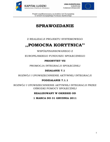 SPRAWOZDANIE Z REALIZACJI PROJEKTU SYSTEMOWEGO ,,POMOCNA KORYTNICA’’ WSPÓŁFINANSOWANEGO Z EUROPEJSKIEGO FUNDUSZU SPOŁECZNEGO PRIORYTET VII PROMOCJA INTEGRACJI SPOŁECZNEJ DZIAŁANIE 7.1 ROZWÓJ I UPOWSZECHNIENIE AKTYWNEJ INTEGRACJI PODZIAŁANIE 7.1.1 ROZWÓJ I UPOWSZECHNIENIE AKTYWNEJ INTEGRACJI PRZEZ OŚRODKI POMOCY SPOŁECZNEJ REALIZOWANY W OKRESIE OD 1 MARCA DO 31 GRUDNIA 2011 1 1. INFORMACJE WSTEPNE Gminny Ośrodek Pomocy Społecznej w Korytnicy podjął się realizacji projektu systemowego ,,Pomocna Korytnica’’, który trwał od 1 marca 2011r. do 31 grudnia 2011r. Projekt miał na celu poprawę aktywizacji społecznej, zawodowej, edukacyjnej i zdrowotnej osób bezrobotnych, w tym długotrwale bezrobotnych oraz nieaktywnych zawodowo, które zamieszkują teren Gminy Korytnica. W ramach projektu w miesiącu marcu 2011r. przystąpiono do rekrutacji uczestników i wyłoniono za pomocą ankiet rekrutacyjnych 12 Beneficjentów Ostatecznych, oraz 3 osoby rezerwowe. Dnia 18 kwietnia 2011r. odbyło się spotkanie z uczestnikami dotyczące podpisania kontraktów socjalnych, oraz podpisania innych stosownych dokumentów. W miesiącu lipcu jedna uczestniczka zrezygnowała z udziału w projekcie z powodu podjęcia pracy, dlatego też na jej miejsce weszła osoba z listy rezerwowej. W ramach projektu podjęto się następujących działań: kurs prawa jazdy kat. B, kurs prawa jazdy kat. C, kurs obsługi wózków jezdniowych z napędem silnikowym komputerowy, w transporcie kurs obsługi wewnątrzzakładowym kas fiskalnych, kurs (wózki widłowe), fryzjerstwo, kurs warsztaty z psychologiem i doradcą zawodowym, badania z medycyny pracy, wycieczka w Góry Świętokrzyskie, oraz spotkanie integracyjno – podsumowujące projekt. 2. KURS PRAWA JAZDY KAT. B Kurs prawa jazdy kat. B rozpoczęło oraz ukończyło 4 uczestników i trwał on od 1 sierpnia 2011r. do 24 października 2011r. Kurs objął 30 godzin wiedzy teoretycznej i 30 godzin wiedzy praktycznej, niezbędnej do prawidłowego użytkowania samochodów osobowych. Kurs został przeprowadzony przez osobę wykwalifikowaną. Uczestnicy zostali zaopatrzeni w niezbędne materiały i pomoce, które pomogły im przystąpić do egzaminu państwowego, który odbył się w miesiącu listopadzie 2011r. i zakończył kurs. 3. KURS PRAWA JAZDY KAT. C W kursie prawa jazdy kat. C wziął udział 1 uczestnik i trwał on od 27 lipca 2011r. do 14 października 2011r. Kurs objął 20 godzin wiedzy teoretycznej i 30 godzin wiedzy praktycznej, niezbędnej do prawidłowego użytkowania samochodów ciężarowych. Kurs został przeprowadzony przez osobę wykwalifikowaną. Uczestnik został zaopatrzony w niezbędne materiały i pomoce, które pomogły mu przystąpić 2 do egzaminu państwowego, który odbył się w miesiącu listopadzie 2011r. i zakończył kurs. 4. KURS OBSŁUGI WÓZKÓW WIDŁOWYCH Kurs obsługi wózków widłowych ( inaczej zwanym kursem obsługi wózków jezdniowych z napędem silnikowym w transporcie wewnątrzzakładowym) odbył się w okresie od 16 sierpnia 2011r. do 6 września 2011r. Objął on 54 godziny zajęć teoretycznych i 20 godzin jazdy praktycznej. Wzięło w nim udział 10 uczestników projektu. Kurs bardzo pomógł uczestnikom, którzy podnieśli swoje kwalifikacje, oraz rozwinęli zainteresowania niezbędne w aktywnym poszukiwaniu zatrudnienia. 5. KURS OBSŁUGI KAS FISKLANYCH Kurs obsługi kas fiskalnych został zorganizowany dla 7 uczestniczek projektu i objął 15 godzin zajęć teoretycznych i praktycznych. Odbył się w dniach 12 – 13 października 2011r. Podczas kursu zaznajomiono się z wszystkimi aspektami pracy na kasie fiskalnej, oraz w praktyce można było sprawdzić swoje umiejętności. Kurs z pewnością przyda się osobom wiążącym nadzieje z pracą w przemyśle spożywczym. 6. KURS FRYZJERSTWO Od 9 listopada 2011r. do 5 grudnia 2011r. odbył się kurs fryzjerski dla 7 uczestniczek, który objął 120 godzin teorii i praktyki. Uczestniczki miały okazję poznać wiele sposobów pracy fryzjerki. Kurs z pewnością rozwinął zainteresowania oraz podniósł kwalifikacje. 7. WARSZTATY Z DORADCĄ ZAWODOWYM W dniach 9 sierpnia 2011r. oraz 7 i 9 września 2011r. odbyły się warsztaty z doradcą zawodowym. Udział wzięli wszyscy Beneficjenci Ostateczni projektu. Zajęcia objęły 8 godzin warsztatów grupowych, podczas których uczestnicy mogli wspólnie porozmawiać o najważniejszych kwestiach możliwości podjęcia pracy, oraz 12 godzin konsultacji indywidualnych ( 1 godzina na uczestnika), w ramach których można było omówić poszczególne przypadki uczestników. Zajęcia z pewnością 3 spełniły cel szczegółowy projektu poprzez zwiększenie umiejętności społeczno zawodowych. 8. WARSZTATY Z PSYCHOLOGIEM W dniach 12, 13 oraz 23 września 2011r.. odbyły się warsztaty z psychologiem. Udział wzięli wszyscy Beneficjenci Ostateczni projektu. Zajęcia objęły 8 godzin warsztatów grupowych, podczas których uczestnicy mogli wspólnie porozmawiać problemach z jakimi muszą się borykać, oraz 12 godzin konsultacji indywidualnych (1 godzina na uczestnika), w ramach których można było omówić poszczególne przypadki uczestników. Zajęcia z pewnością spełniły cel szczegółowy projektu poprzez zwiększenie umiejętności społecznych. 9.BADANIA Z MEDYCYNY PRACY W ramach projektu systemowego ,,Pomocna Korytnica’’ zostały zorganizowane badania z medycyny pracy, które były dostosowane do kursów, w których brał udział indywidualny uczestnik. Dzięki badaniom został spełniony cel szczegółowy projektu, dlatego też zdiagnozowano stan zdrowia wszystkich uczestników projektu w kontekście zatrudnienia. 10.WYJAZD INTEGRACYJNY W GÓRY ŚWIĘTOKRZYSKIE W dniach 6-7 października 2011r. odbył się wyjazd integracyjny w Góry Świętokrzyskie dla 12 uczestników i zespołu projektowego. W ramach wycieczki można było zobaczyć: Dąb Bartek, Jaskinię Raj, zamek w Chęcinach, skansen w Tok