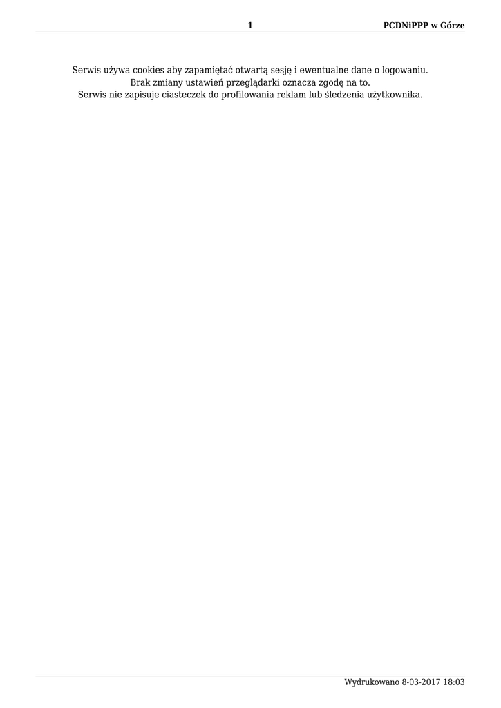 1 PCDNiPPP w Górze Serwis używa cookies aby zapamiętać otwartą sesję i ewentualne dane o logowaniu. Brak zmiany ustawień przeglądarki oznacza zgodę na to. Serwis nie zapisuje ciasteczek do profilowania reklam lub śledzenia użytkownika. Wydrukowano 8-03-2017 18:03