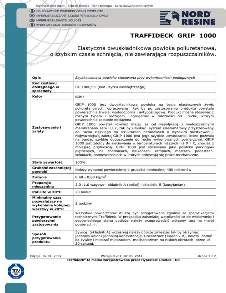 Technical data sheet - Scheda tecnica - Fiche tecnique - Karta danych technicznych LIQUID-APPLIED WATERPROOFING PRODUCTS IMPERMEABILIZZANTI LIQUIDI PER EDILIZIA CIVILE IMPERMÉABILISANTS LIQUIDES HYDROIZOLACJE TARASÓW I BUDYNKÓW TRAFFIDECK GRIP 1000 Elastyczna dwuskładnikowa powłoka poliuretanowa, o szybkim czasie schnięcia, nie zawierająca rozpuszczalników. Opis Szybkoschnąca powłoka stosowana przy wykończeniach podłogowych Kod zestawu dostępnego w sprzedaży HG 1000/15 (kod użytku wewnętrznego) Kolor szary Zastosowanie i zalety GRIP 1000 jest dwuskładnikową powłoką na bazie elastycznych żywic poliuretanowych, opracowaną tak by po zastosowaniu produktu powstała powierzchnia trwała, wodoodporna i antypoślizgowa. Produkt można stosować z różnym typem i rodzajem agregatów w zależności od ruchu, którym powierzchnia zostanie obciążona. GRIP 1000 powstał również mając za cel współpracę z wodoszczelnymi membranami serii FLEX, tak by uzyskać system elastomerowy przystosowany do ruchu ciężkiego na strukturach betonowych o wysokim mostkowaniu. Najważniejszą zaletą GRIP 1000 jest jego szybkie utwardzanie, które pozwala na bardzo szybkie dopuszczenie do ruchu wykonywanych powierzchni. GRIP 1000 jest zdolny do sieciowania w temperaturach niższych niż 0 ° C, chociaż z mniejszą prędkością. GRIP 1000 jest stosowany jako powłoka parkingów piętrowych, na chodnikach, balkonach, rampach, mostach, podestach, schodach, pomieszczeniach w których odbywają się prace mechaniczne. Stała zawartość 100% Grubość zaschniętej powłoki Należy wykonać powierzchnię o grubości minimalnej 400 mikronów Zużycie 0,40 - 0,80 kg/m2 Proporcje mieszanina 2,0 :1,0 wagowo- składnik A (poliol) i składnik B (izocyjanian) Pot-life w 20°C 20 minut Minimalny czas pozwalający na wykonanie kolejnej warstwy w 20°C 2 godziny Przygotowanie powierzchni zastosowania Sposób przygotowania produktu Edycja: 02.04. 2007 Wszystkie powierzchnie muszą być przygotowane zgodnie ze specyfikacjami technicznymi Traffideck. W przypadku zaistniałej wątpliwości co do właściwości i odpowiedniego stanu podłoża należy przeprowadzić wstępny test na małej powierzchni. Żywicę (składnik A) wcześniej należy dobrze zmieszać tak by otrzymać jednolity kolor i jednolitą konsystencję. Utwardzacz (składnik B), należy dodać do żywicy i mieszać mieszadłem mechanicznym na niskich obrotach przez 1520 sekund. Wersja PL/01.-07.03. 2014 Traffideck® to marka zarejestrowana przez Hyperlast Limited - UK strona 1 z 2 Technical data sheet - Scheda tecnica - Fiche tecnique - Karta danych technicznych LIQUID-APPLIED WATERPROOFING PRODUCTS IMPERMEABILIZZANTI LIQUIDI PER EDILIZIA CIVILE IMPERMÉABILISANTS LIQUIDES HYDROIZOLACJE TARASÓW I BUDYNKÓW TRAFFIDECK GRIP 1000 Elastyczna dwuskładnikowa powłoka poliuretanowa, o szybkim czasie schnięcia, nie zawierająca rozpuszczalników. Sposób nakładania Dane techniczne Właściwości zaschniętej powłoki Opakowanie Magazynowanie Zdatność do użycia Mieszaninę (A + B) należy bezpośrednio rozprowadzić po powierzchni przy pomocy gumowej listwy, a także pacy zębatej. W ciągu 10 minut, powierzchnie wykonane żywicą poziomującą obsypać piaskiem kwarcowym. W przypadku powierzchni pochyłych (rampy) należy dłużej zaczekać by nie rozregulować grubości powierzchni. Skłdanik A Składnik B Wygląd Żółta ciecz Brązowa ciecz Lepkość w 25°C 700 - 1200 cPs 70-190 cPs Gęstość w 25°C 0,98-1,00 kg/dm3 1,20-1,22 kg/dm3 Trwardość Shore D 45 Wytrzymałość na rozciąganie 12,0 MPa Wydłużenie przy zerwaniu 80 % Gęstość (A+B) 1,10 kg/dm3 Przyczepność do betonu 3,0 MPa z podkładem Odmierzony zestaw o wadze 15 kg (A+B) Składnik A: wiaderko 10 kg, Składnik B: pojemnik 5 kg W szczelnych oryginalnych opakowaniach w temperaturze +4 ° do +35 ° C. Opakowania powinny być przechowywane w najwyższych temperaturach. Co najmniej 12 miesięcy przechowywania w oryginalnych zamkniętych opakowaniach. Informacje związane z bezpieczeństwem i zdrowiem Przez zastosowaniem produktu należy zapoznać się z kartą bezpieczeństwa. Informacje dodatkowe ------- Edycja: 02.04. 2007 Wersja PL/01.-07.03. 2014 Traffideck® to marka zarejestrowana przez Hyperlast Limited - UK strona 2 z 2