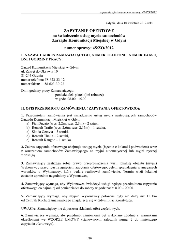 zapytanie ofertowe-numer sprawy: 45/ZO/2012 Gdynia, dnia 10 kwietnia 2012 roku ZAPYTANIE OFERTOWE na świadczenie usług mycia samochodów Zarządu Komunikacji Miejskiej w Gdyni numer sprawy: 45/ZO/2012 I. NAZWA I ADRES ZAMAWIAJĄCEGO, NUMER TELEFONU, NUMER FAKSU, DNI I GODZINY PRACY: Zarząd Komunikacji Miejskiej w Gdyni ul. Zakręt do Oksywia 10 81-244 Gdynia numer telefonu: 58-623-33-12 numer faksu: 58-623-30-22 Dni i godziny pracy Zamawiającego: poniedziałek-piątek (dni robocze) w godz. 08.00– 15.00 II. OPIS PRZEDMIOTU ZAMÓWIENIA ( ZAPYTANIA OFERTOWEGO): 1. Przedmiotem zamówienia jest świadczenie usług mycia następujących samochodów Zarządu Komunikacji Miejskiej w Gdyni: a) Fiat Ducato (wys. 2,2m; szer. 2,3m) – 2 sztuki, b) Renault Trafic (wys. 2,6m; szer. 2,15m) – 1 sztuka, c) Skoda Octavia – 3 sztuki, d) Renault Thalia – 2 sztuki, e) Renault Kangoo – 1 sztuka. 2. Zakres zapytania ofertowego obejmuje usługę mycia (łącznie z kołami i podwoziem) wraz z osuszeniem samochodów Zamawiającego na myjni automatycznej lub myjni ręcznej z obsługą. 3. Zamawiający zastrzega sobie prawo przeprowadzenia wizji lokalnej obiektu (myjni) Wykonawcy przed rozstrzygnięciem zapytania ofertowego, celem sprawdzenia wymaganych warunków u Wykonawcy, który będzie realizował zamówienie. Termin wizji lokalnej zostanie uprzednio uzgodniony z Wykonawcą. 4. Zamawiający wymaga, aby Wykonawca świadczył usługi będące przedmiotem zapytania ofertowego co najmniej od poniedziałku do soboty w godzinach: 8.00 – 20.00. 5. Zamawiający wymaga, aby myjnie Wykonawcy położone były nie dalej niż 15 km od Centrali Ruchu Zamawiającego znajdującej się w Gdyni, Plac Konstytucji. UWAGA: Zamawiający nie dopuszcza składania ofert częściowych. 6. Zamawiający wymaga, aby przedmiot zamówienia był wykonany zgodnie z warunkami określonymi we WZORZE UMOWY (stanowiącym załącznik numer 2 do niniejszego zapytania ofertowego). 1/10 zapytanie ofertowe-numer sprawy: 45/ZO/2012 III. WARUNKI PŁATNOŚCI: wskazane we WZORZE UMOWY stanowiącym załącznik numer 2 do niniejszego zapytania ofertowego. IV. TERMIN REALIZACJI PRZEDMIOTU ZAMÓWIENIA (ZAPYTANIA OFERTOWEGO): sukcesywnie przez okres 12 (słownie: dwunastu) miesięcy od daty podpisania umowy. V. FORMA ZŁOŻENIA OFERTY: 1. Ofertę (na FORMULARZU OFERTY stanowiącym załącznik numer 1 do zapytania ofertowego) wraz z załącznikami należy złożyć w formie: - pisemnej (osobiście, listownie) na adres: Zarząd Komunikacji Miejskiej w Gdyni ul. Zakręt do Oksywia 10 81-244 Gdynia pok. nr 8 2. Ofertę należy sporządzić w języku polskim, czytelnie. 3. Oferta musi być podpisana przez Wykonawcę (osobę uprawnioną do reprezentowania Wykonawcy zgodnie z dokumentami potwierdzającymi dopuszczenie do obrotu prawnego) lub jego upełnomocnionego przedstawiciela (pełnomocnictwo winno zostać złożone wraz z ofertą w formie oryginału lub poświadczonej notarialnie kopii). 4. Ofertę wraz ze wszystkimi załącznikami należy umieścić w zamkniętej kopercie opatrzonej następującymi napisami: ZAPYTANIE OFERTOWE – znak: 45/ZO/2012 Oferta – MYCIE POJAZDÓW ZKM W GDYNI Nazwa i siedziba Wykonawcy:………………………………………………………………... Nie otwierać przed: 18 KWIETNIA 2012 ROKU GODZ. 12.30 W PRZYPADKU UMIESZCZENIA OFERTY W KOPERCIE NIE ZAWIERAJĄCEJ WYŻEJ WYMIENIONYCH OZNACZEŃ – ZAMAWIAJACY NIE BĘDZIE PONOSIŁ ŻADNEJ ODPOWIEDZIALNOŚCI Z TYTUŁU OTWARCIA KOPERTY PRZED UPŁYWEM TERMINU SKŁADANIA OFERT. VI. MIEJSCE I TERMIN SKŁADANIA OFERT, MIEJSCE I TERMIN OTWARCIA OFERT, TERMIN ZWIĄZANIA OFERTĄ: 1. Miejsce składania ofert: Zarząd Komunikacji Miejskiej w Gdyni ul. Zakręt do Oksywia 10 81-244 Gdynia pok. nr 8 (Sekretariat) Termin składania ofert: 18 kwietnia 2012 roku do godz. 12.00. 2/10 zapytanie ofertowe-numer sprawy: 45/ZO/2012 2. Miejsce otwarcia ofert: Zarząd Komunikacji Miejskiej w Gdyni ul. Zakręt do Oksywia 10 81-244 Gdynia pok. nr 8 (Sekretariat) Termin otwarcia ofert: 18 kwietnia 2012 roku o godz. 12.30. 3. Termin związania ofertą – do dnia 17 maja 2012 roku. VII. WYKAZ DOKUMENTÓW I OŚWIADCZEŃ, JAKIE ZOBOWIĄZANI SĄ ZŁOŻYĆ WRAZ Z OFERTĄ – WYKONAWCY: Wykonawca jest zobowiązany do złożenia wraz z ofertą: 1) aktualnego odpisu z właściwego rejestru wystawionego nie wcześniej niż 6 miesięcy przed upływem terminu składania ofert * lub 2) aktualnego zaświadczenia o wpisie do ewidencji działalności gospodarczej wystawionego nie wcześniej niż 6 miesięcy przed upływem terminu składania ofert lub wydruku z Centralnej Ewidencji i Informacji o Działalności Gospodarczej Rzeczpospolitej Polskiej wygenerowanego nie wcześniej niż 6 miesięcy przed upływem terminu składania ofert (pismo musi być opatrzone datą wydruku); 3) oświadczeń (na załączniku numer 1 do zapytania ofertowego FORMULARZ OFERTY) potwierdzających, że Wykonawca: − zapoznał się z zapytaniem ofertowym – numer sprawy: 45/ZO/2012 (w tym - opisem przedmiotu zamówienia) i nie wnosi do niego zastrzeżeń, − posiada uprawnienia niezbędne do wykonania przedmiotu zamówienia (zapytania ofertowego), − posiada niezbędną wiedzę i doświadczenie oraz dysponuje lub będzie dysponował potencjałem technicznym, a także osobami zdolnymi do wykonania zamówienia, − znajduje się w sytuacji ekonomicznej i finansowej zapewniającej wykonanie zamówienia, − jest związany ofertą do dnia 17 maja 2012 roku; 4) oświadczeń (na załączniku numer 1 do zapytania ofertowego FORMULARZ OFERTY) potwierdzających, że w stosunku do Wykonawcy: - nie otwarto likwidacji lub nie ogłoszono upadłości (chyba, że po ogłoszeniu upadłości Wykonawca zawarł układ zatwierdzony prawomocnym postanowieniem sądu, jeżeli układ nie przewiduje zaspokojenia wierzycieli przez likwidację majątku upadłego); 5) wypełnionego FORMULARZA OFERTY stanowiącego załącznik numer 1 do zapytania ofe