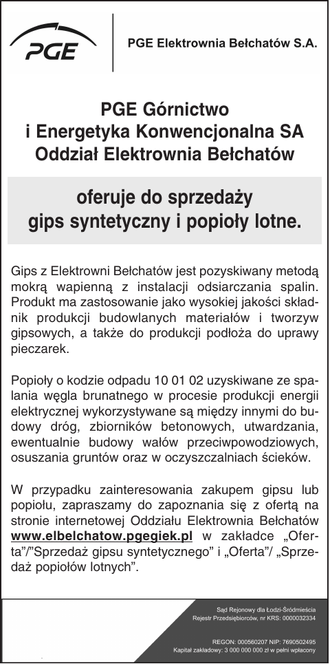 PGE Górnictwo i Energetyka Konwencjonalna SA Oddział Elektrownia Bełchatów oferuje do sprzedaży gips syntetyczny i popioły lotne. Gips z Elektrowni Bełchatów jest pozyskiwany metodą mokrą wapienną z instalacji odsiarczania spalin. Produkt ma zastosowanie jako wysokiej jakości składnik produkcji budowlanych materiałów i tworzyw gipsowych, a także do produkcji podłoża do uprawy pieczarek. Popioły o kodzie odpadu 10 01 02 uzyskiwane ze spalania węgla brunatnego w procesie produkcji energii elektrycznej wykorzystywane są między innymi do budowy dróg, zbiorników betonowych, utwardzania, ewentualnie budowy wałów przeciwpowodziowych, osuszania gruntów oraz w oczyszczalniach ścieków. W przypadku zainteresowania zakupem gipsu lub popiołu, zapraszamy do zapoznania się z ofertą na stronie internetowej Oddziału Elektrownia Bełchatów www.elbelchatow.pgegiek.pl w zakładce „Oferta”/”Sprzedaż gipsu syntetycznego” i „Oferta”/ „Sprzedaż popiołów lotnych”.